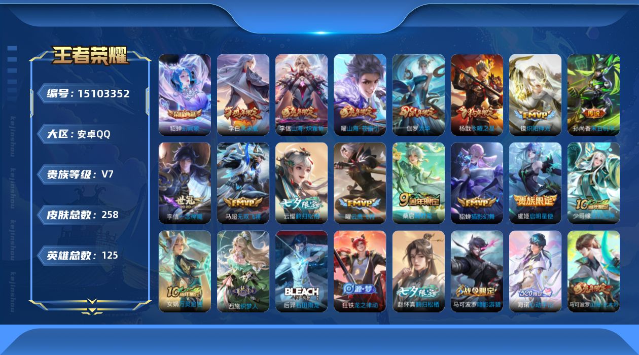 商品描述:[15103352]XR45480-安卓Q-无二次-有违规-V8-最强王者段位-125英雄-258皮肤-1典藏皮肤-15传说-74史诗【英雄全皮】:孙权全皮,李信全皮,蒙恬全皮,影全皮,海诺全皮【荣耀典藏】:貂蝉幻阙歌【传说皮肤】:后羿神树通天,桑启鸣野蒿,云缨鹤归松栖,曜山海苍雷引,李信山海炽霜斩,马超无双飞将,镜炽阳神光,虞姬启明星使,曜云鹰飞将,李信一念神魔,伽罗太华,貂蝉猫影幻舞,杨戬永曜之星,李白凤求凰,孙尚香末日机甲【限定皮肤】:姜子牙天穹之誓,杨戬破阵退雄兵,狄仁杰阴阳师,赵云皇家上将,赵云引擎之心,赵云龙胆,孙尚香蔷薇恋人,阿轲迷踪丽影,芈月幻夜卜梦,吕布御风骁将,周瑜赤莲之焰,夏侯惇朔风刀,马可波罗暗影游猎,马可波罗山海玄木吟,狄仁杰魔术师,狄仁杰万华元夜,达摩沙漠行僧,项羽海滩派对,老夫子醍醐杖,程咬金演武夺筹,刘邦夺宝奇兵,韩信傲雪梅枪,兰陵王驯魔猎人,兰陵王金庭之子,孙悟空美猴王,后羿辉光之辰,张飞虎魄,李元芳云中旅人,虞姬启明星使,钟馗驱傩正仪,杨玉环寅虎心曲,杨戬永曜之星,雅典娜黎明之约,蔡文姬繁星吟游,鬼谷子原初探秘者,黄忠火炮绅士,苏烈千军破阵,百里玄策原初追逐者,弈星混沌棋,沈梦溪大漠名商,明世隐疑决卦,裴擒虎李小龙,裴擒虎擒涛扼浪,狂铁电玩高手,云中君纤云弄巧,李信山海炽霜斩,伽罗太华,盾山御銮,猪八戒西部大镖客,上官婉儿梁祝,上官婉儿神器万象笔,曜山海苍雷引,西施玲珑珍味,鲁班大师探海日志,桑启海盐诗旅,戈娅驭风魔法,赵怀真鹤归松栖,云缨鹤归松栖,阿古朵江河有灵,张良古海寻踪,蒙犽百解令,蒙恬荣光圣徽,鬼谷子天穹祈灯,姬小满妄想食味,刘邦剑破天穹,程咬金群星魔术团,关羽决胜骁骑,海诺心动手记,刘备异域游侠,周瑜熔金海岸【年限皮肤】:孙悟空美猴王,杨玉环寅虎心曲,李白凤求凰,杨戬永曜之星,后羿辉光之辰,吕布御风骁将,伽罗太华,张飞虎魄,赵云龙胆,马可波罗山海玄木吟,李信山海炽霜斩,曜山海苍雷引【赛季限定】:夏侯惇朔风刀,狄仁杰万华元夜,达摩沙漠行僧,老夫子醍醐杖,程咬金演武夺筹,兰陵王金庭之子,张良古海寻踪,李元芳云中旅人,钟馗驱傩正仪,雅典娜黎明之约,鬼谷子原初探秘者,苏烈千军破阵,百里玄策原初追逐者,弈星混沌棋,沈梦溪大漠名商,明世隐疑决卦,裴擒虎擒涛扼浪,盾山御銮,鲁班大师探海日志,桑启海盐诗旅,鬼谷子天穹祈灯,蒙恬荣光圣徽,刘邦
