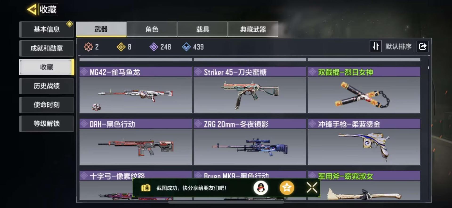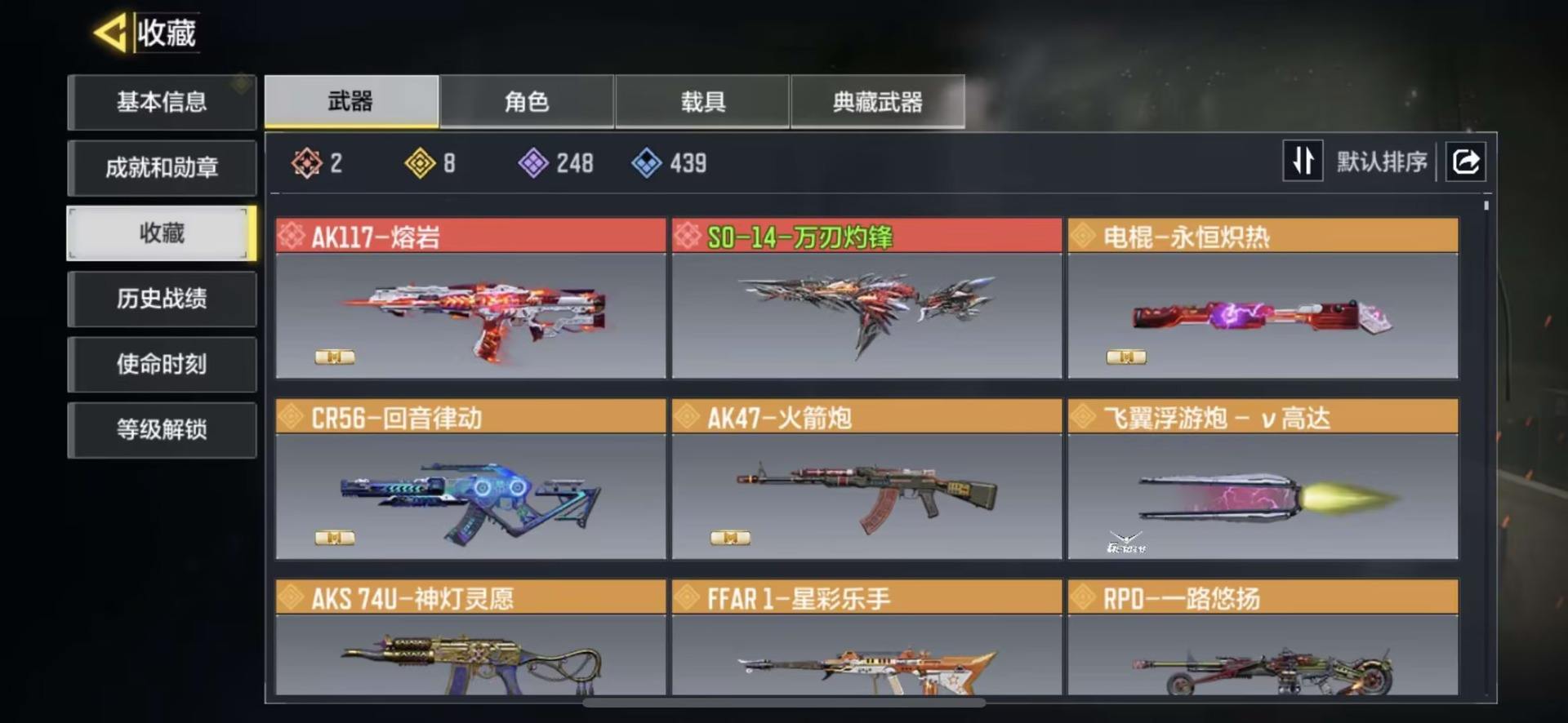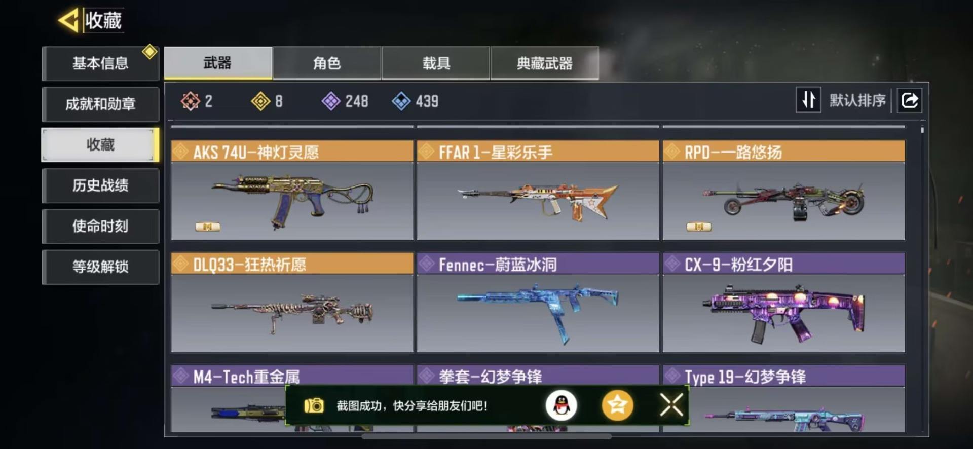 MHZ2415【7红2满12金】安卓Q-等级400-史诗枪械522 【7神话】AMR-亚特兰蒂斯(满级) Kilo 141-暗夜奏鸣曲(满级) M13-黑耀星辰 Switchblade X9-瞬影斩决 Krig6-冰霜巨龙 Fennec-无畏 AK117-熔岩 【12传说】 AN94-毁灭浪潮 十字弓-动能电流 Arctic50-青眸白虎 S36-甜心诱惑 DLQ33-先进火力 唐刀-白月魁 Type25-赤焰复仇 SA80-狂暴冲锋 电棍-永恒炽热 CR56-回音律动 AK47-火箭炮 飞翼浮游炮-v高达