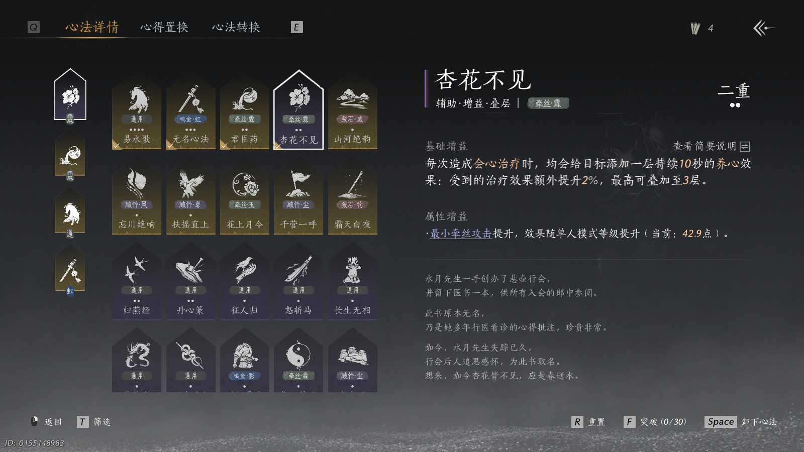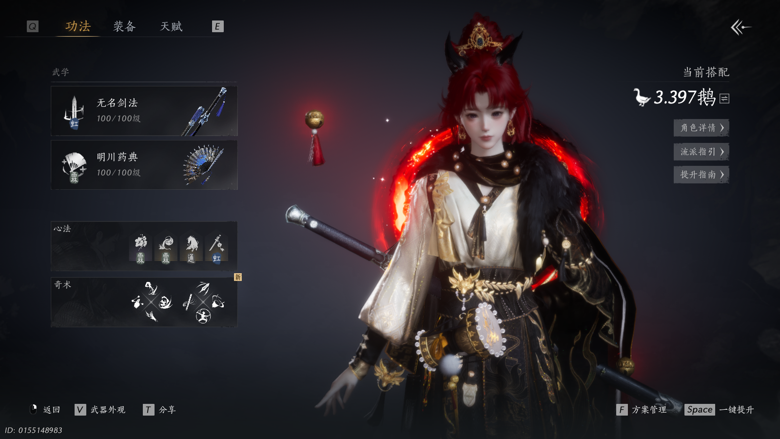 商品描述:XY-076671290 风华值13139 武林造诣(鹅)3.397 已用八音窍数量2 等级100 角色性别【文本】女 【有换绑CD】 【未注册】 【不支持人脸包赔】 【女】 【是】 【是】