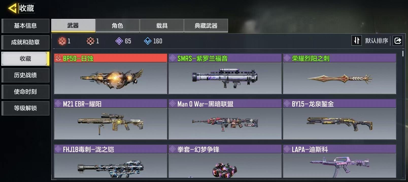 商品描述:[15227496]125级 1神话 65史诗 段位黄金 可二次 可修改实名 【神话枪械】BP50-日蚀