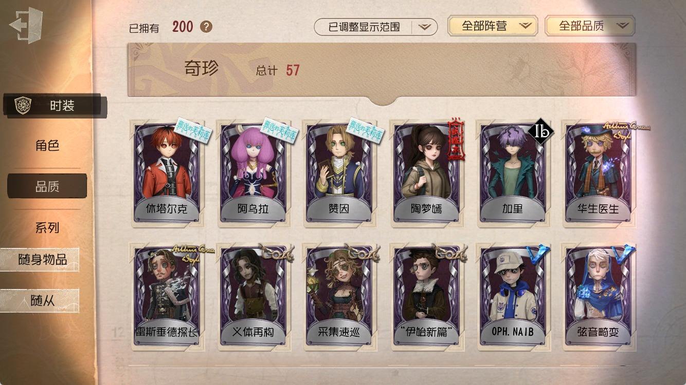 商品描述:[15246792]安卓官服 手机账号 200时装 7金皮 57紫皮 10随从 59随身物品 【时装】园丁-源自星辰,杂技演员-祈雨珠,黄衣之主-克朗普斯,“心理学家”-末世搜救,佣兵-达克斯上校,红夫人-应许之日,黄衣之主-衣帽架先生,梦之女巫-裁缝夫人,渔女-审判之翎,古董商-陶梦嫣,入殓师-变彩,爱哭鬼-善恶的本性,“心理学家”-恒梦,歌剧演员-拂晓女士,“杰克”-加里,隐士-薄金 ,雕刻家-善忘的海马体,26号守卫-秘密大厨,小说家-无归的昨日,祭司-阿乌拉,大副-雷斯垂德探长,病患-湖中影,邮差-潘塔龙,佣兵-弦音畸变,火灾调查员-“膨化”,时空之影-“有机磷”,宿伞之魂-桃面书生,“心理学家”-银骑士,佣兵-OPH.NAIB,摄影师-“琥珀”,“法罗女士”-芳泽霞,蜘蛛-聚光灯下,先知-纯白之盐,渔女-鬼脸天蛾,勘探员-盛夏飞盘,邮差-华生医生,园丁-郁金香之梦,小说家-“伊始新篇”,气象学家-采风的仙灵,杂技演员-李天辰,木偶师-义体再构,“喧嚣”-星之王,哭泣小丑-熄灭的太阳,画家-多色印刷,调酒师-校对人,“博士”-“裁纸机”,拉拉队员-采集速巡,佣兵-弹簧手,击球手-迫降专家,勘探员-鼹鼠先生,勘探员-罗纳德,勘探员-矿业董事,疯眼-禁闭院长,医生-炽天使,牛仔-逆刃之鞭,守墓人-奶酪,宿伞之魂-残花泪【随身物品】灯龙影(稀世),微缩星球(奇珍),夏(稀世),绝影(奇珍),“全熟”(奇珍),醒梦铃(奇珍),毁誉之印(稀世),枯萎的花冠(奇珍),喝彩(奇珍),缚翼(稀世),咖啡壶(稀世),酩酊(奇珍),法典(奇珍),唤潮(稀世),玫瑰手杖(蓝)(奇珍),白泽玉(奇珍),完美人偶(稀世),鹰羽(奇珍),涅槃(稀世)