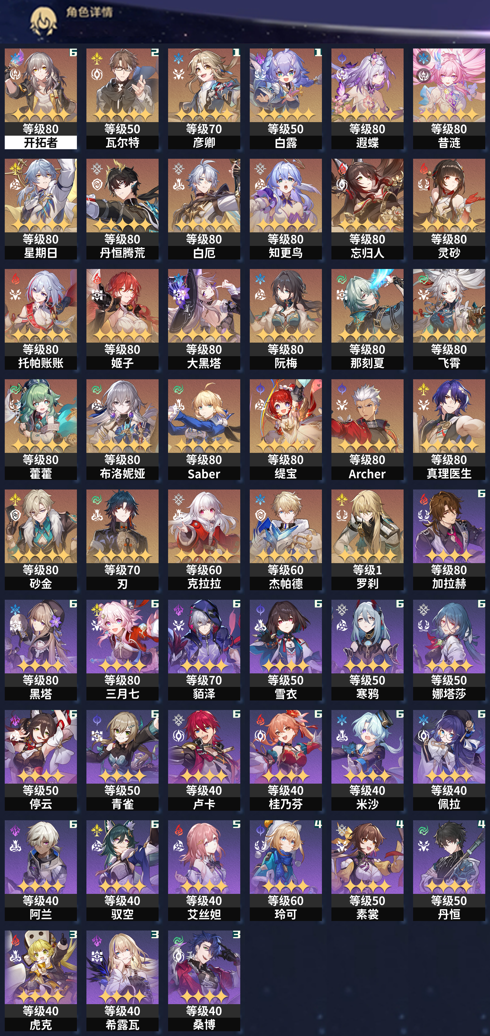 【崩坏·星穹铁道】【LYXQ6817】冒险等级:68,女主,五星数量:17,绑定情况:邮箱__五星角色:白厄 * 6命|Saber|阮·梅|刻律德菈|布洛妮娅|符玄|Archer|丹恒·腾荒|彦卿|杰帕德|真理医生__五星光锥:黎明恰如此燃烧 * 5精|记忆永不落幕 * 5精|时节不居 * 2精|无可取代的东西|理想燃烧的地狱|银河铁道之夜,【邮箱未实名】[13684071]m23836,70级,女主,36黄,梦华34,星琼90,星轨专票0,星轨通票3,16个五星角色:3命白厄,1命布洛妮娅,1命阮梅,1命白露,1命克拉拉,1命杰帕德,星期日,丹恒腾荒,刻律德菈,Archer,大黑塔,遐蝶,真理医生,姬子,彦卿,瓦尔特,8个五星光锥:精5不息的演算,精1黎明恰如此燃烧,精1星海巡航,精1理想燃烧的地狱,精1回到大地的飞行,精1记一位星神的陨落,精1记忆永不落幕,精1时节不居