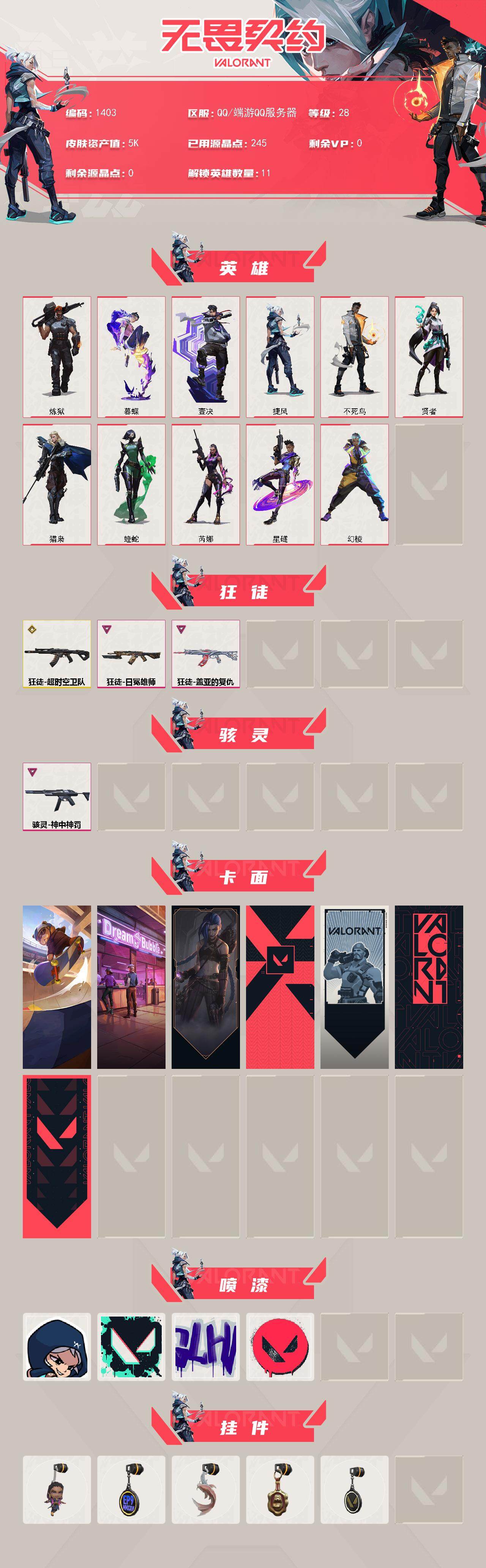 商品描述:[15292998]【英雄】:幻棱,炼狱,暮蝶,壹决,捷风,不死鸟,贤者,猎枭,蝰蛇,芮娜,星礈【狂徒】:狂徒-超时空卫队,狂徒-盖亚的复仇,狂徒-日冕雄师【骇灵】:骇灵-神中神罚【卡面】:Clutch 卡面,梦幻奶茶 卡面,《双城之战》金克丝 卡面,代号红色 卡面,新兵报到 卡面,V契约 卡面,无畏契约 卡面【喷漆】:捷风差距 喷漆,胜利属于无畏契约 喷漆,GLHF 喷漆,无畏契约 喷漆【挂饰】:无畏契约GO!第一卷 芮娜 挂饰,第九季//第一幕 纪念币 挂饰,红鳞松叶 挂饰,海豹的认可 挂饰,无畏契约 纪念币 挂饰