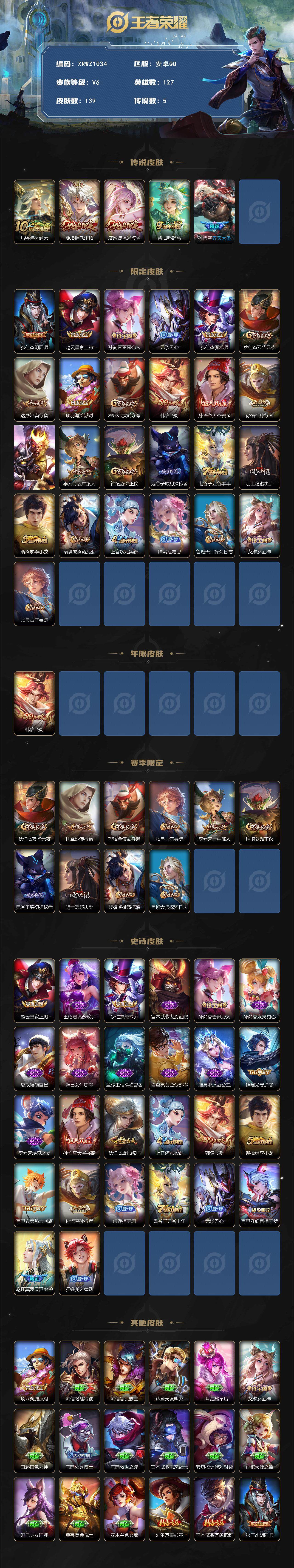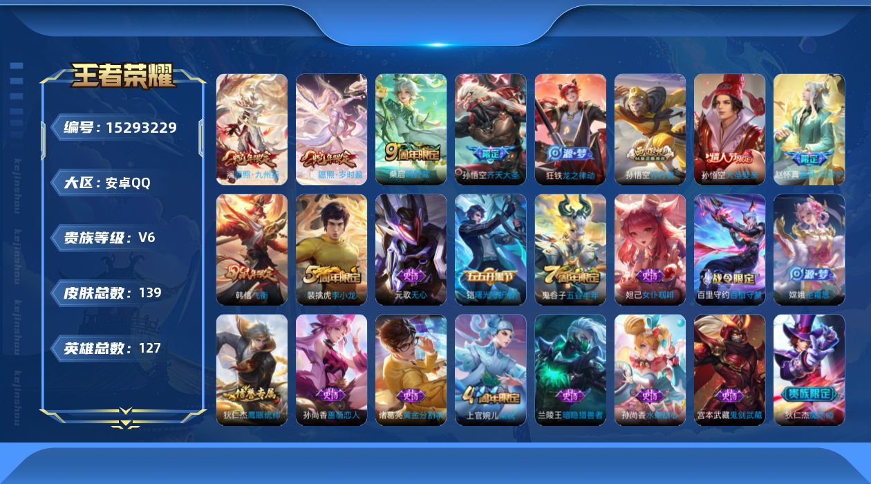 商品描述:[15293229]Xr45437-安卓Q-无二次-V6-尊贵铂金I段位-127英雄-139皮肤-5传说-26史诗【传说皮肤】:后羿神树通天,澜愿照九州拓,虞姬愿照岁时盈,桑启鸣野蒿,孙悟空齐天大圣【限定皮肤】:狄仁杰阴阳师,赵云皇家上将,孙尚香蔷薇恋人,元歌无心,狄仁杰魔术师,狄仁杰万华元夜,达摩沙漠行僧,项羽海滩派对,程咬金演武夺筹,韩信飞衡,孙悟空大圣娶亲,孙悟空孙行者,孙悟空齐天大圣,李元芳云中旅人,钟馗驱傩正仪,鬼谷子原初探秘者,鬼谷子五谷丰年,明世隐疑决卦,裴擒虎李小龙,裴擒虎擒涛扼浪,上官婉儿梁祝,嫦娥拒霜思,鲁班大师探海日志,艾琳女武神,张良古海寻踪【年限皮肤】:韩信飞衡【赛季限定】:狄仁杰万华元夜,达摩沙漠行僧,程咬金演武夺筹,张良古海寻踪,李元芳云中旅人,钟馗驱傩正仪,鬼谷子原初探秘者,明世隐疑决卦,裴擒虎擒涛扼浪,鲁班大师探海日志【史诗皮肤】:赵云皇家上将,王昭君偶像歌手,狄仁杰魔术师,宫本武藏鬼剑武藏,孙尚香蔷薇恋人,孙尚香水果甜心,嬴政摇滚巨星,妲己女仆咖啡,兰陵王暗隐猎兽者,诸葛亮黄金分割率,雅典娜冰冠公主,铠曙光守护者,李元芳逐浪之夏,孙悟空大圣娶亲,狄仁杰鹰眼统帅,上官婉儿梁祝,韩信飞衡,裴擒虎李小龙,百里玄策热力回旋,孙悟空孙行者,嫦娥拒霜思,鬼谷子五谷丰年,元歌无心,百里守约百相守梦,赵怀真器灵浮梦炉,狂铁龙之律动【其他皮肤】:项羽海滩派对,韩信教廷特使,韩信街头霸王,达摩大发明家,芈月红桃皇后,艾琳女武神,白起白色死神,扁鹊化身博士,扁鹊救世之瞳,宫本武藏未来纪元,安琪拉玩偶对对碰,孙膑天使之翼,妲己少女阿狸,典韦黄金武士,花木兰兔女郎,刘备万事如意,宫本武藏万象初新,狄仁杰阴阳师,刘备汉昭烈帝,关羽龙腾万里,钟无艳海滩丽影,宫本武藏霸王丸,狂铁命运角斗场,诸葛亮掌控之力,李白敏锐之力,明世隐虹云星官,庄周奇妙博物学,小乔丁香结,沈梦溪鲨炮海盗猫,明世隐疑决卦,鬼谷子原初探秘者,狄仁杰万华元夜,程咬金演武夺筹,张良缤纷绘卷,钟馗驱傩正仪,鲁班大师乓乓大师,典韦铁甲之心,达摩沙漠行僧,蒙恬蔚蓝守将,李元芳云中旅人,刘备潮玩造梦师,海月幻泉雾影,裴擒虎擒涛扼浪,太乙真人劲辣红锅,鲁班大师探海日志,张良古海寻踪,后羿完美运算,东皇太一噬灭天穹,老夫子百相守梦,干将莫邪雾都夜雨,吕布逐霄战戟,苍苍林狼骑,太乙真人谧流熔炉,西施雪境奇遇,东皇太