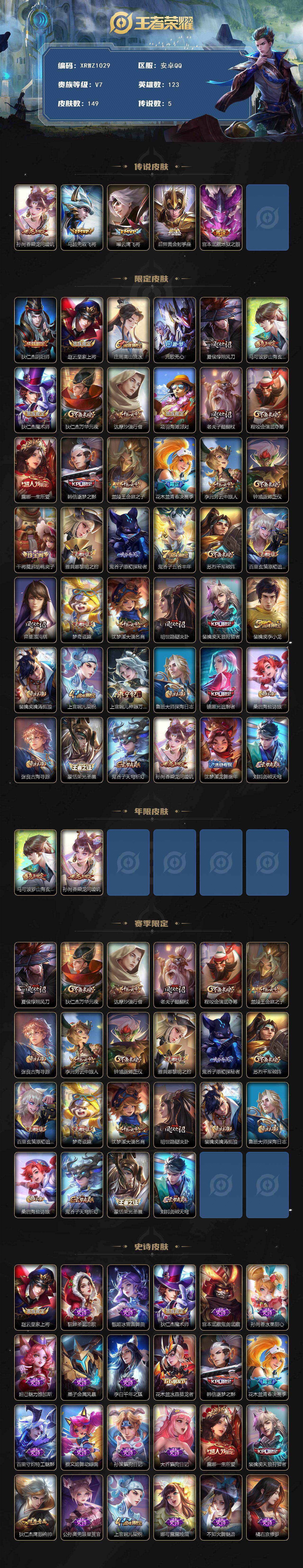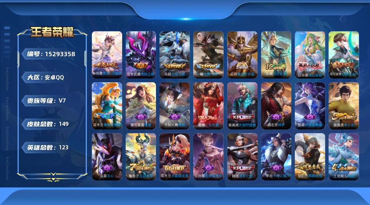 商品描述:[15293358]Xr46744-安卓Q-V7-最强王者段位-123英雄-149皮肤-5传说-37史诗【传说皮肤】:孙尚香乘龙问璇玑,马超无双飞将,曜云鹰飞将,后羿黄金射手座,宫本武藏地狱之眼【限定皮肤】:狄仁杰阴阳师,赵云皇家上将,庄周高山流水,元歌无心,夏侯惇朔风刀,马可波罗山海玄木吟,狄仁杰魔术师,狄仁杰万华元夜,达摩沙漠行僧,项羽海滩派对,老夫子醍醐杖,程咬金演武夺筹,露娜一生所爱,韩信逐梦之影,兰陵王金庭之子,花木兰青春决赛季,李元芳云中旅人,钟馗驱傩正仪,干将莫邪胡桃夹子,雅典娜黎明之约,鬼谷子原初探秘者,鬼谷子五谷丰年,苏烈千军破阵,百里玄策原初追逐者,弈星混沌棋,梦奇顽趣,沈梦溪大漠名商,明世隐疑决卦,裴擒虎天狼狩猎者,裴擒虎李小龙,裴擒虎擒涛扼浪,上官婉儿梁祝,上官婉儿神器万象笔,鲁班大师探海日志,镜匿光追影者,桑启海盐诗旅,张良古海寻踪,蒙恬荣光圣徽,鬼谷子天穹祈灯,孙尚香乘龙问璇玑,沈梦溪龙舞盛年,刘邦剑破天穹【年限皮肤】:马可波罗山海玄木吟,孙尚香乘龙问璇玑【赛季限定】:夏侯惇朔风刀,狄仁杰万华元夜,达摩沙漠行僧,老夫子醍醐杖,程咬金演武夺筹,兰陵王金庭之子,张良古海寻踪,李元芳云中旅人,钟馗驱傩正仪,雅典娜黎明之约,鬼谷子原初探秘者,苏烈千军破阵,百里玄策原初追逐者,弈星混沌棋,梦奇顽趣,沈梦溪大漠名商,明世隐疑决卦,裴擒虎擒涛扼浪,鲁班大师探海日志,桑启海盐诗旅,鬼谷子天穹祈灯,蒙恬荣光圣徽,刘邦剑破天穹【史诗皮肤】:赵云皇家上将,貂蝉圣诞恋歌,甄姬冰雪圆舞曲,狄仁杰魔术师,宫本武藏鬼剑武藏,孙尚香水果甜心,妲己魅力维加斯,墨子金属风暴,李白千年之狐,花木兰水晶猎龙者,韩信逐梦之影,花木兰青春决赛季,百里守约特工魅影,蔡文姬舞动绿茵,孙策猫狗日记,大乔猫狗日记,露娜一生所爱,裴擒虎天狼狩猎者,狄仁杰鹰眼统帅,公孙离无限星赏官,上官婉儿梁祝,娜可露露晚萤,不知火舞魅语,橘右京修罗,百里玄策原初追逐者,裴擒虎李小龙,庄周高山流水,镜匿光追影者,雅典娜黎明之约,鬼谷子五谷丰年,上官婉儿神器万象笔,元歌无心,梦奇顽趣,马可波罗山海玄木吟,蒙恬荣光圣徽,公孙离涂山容容,女娲万灵启世【其他皮肤】:项羽海滩派对,韩信教廷特使,韩信街头霸王,露娜哥特玫瑰,达摩大发明家,赵云忍炎影,芈月红桃皇后,程咬金星际陆战队,白起白色死神,牛魔西部大镖客,扁鹊化身博士,宫