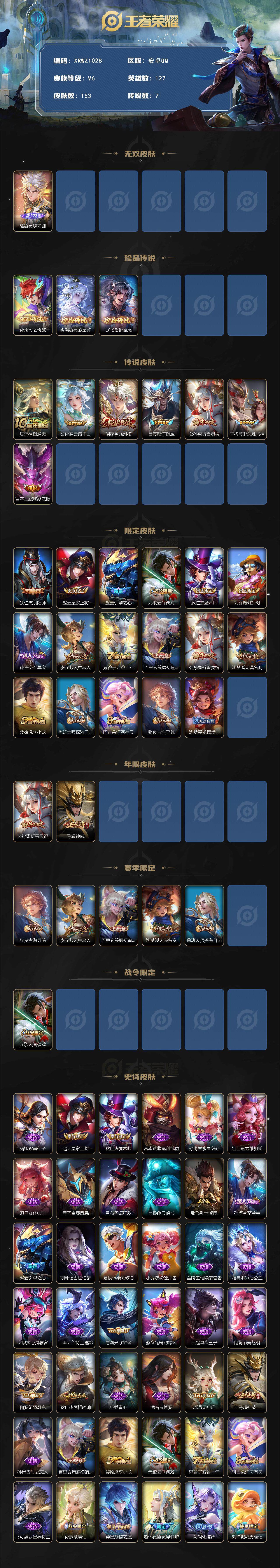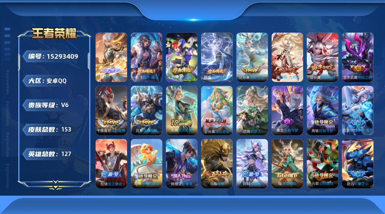 商品描述:[15293409]Xr47486-安卓Q-V6-最强王者段位-127英雄-153皮肤-1无双-3珍品传说-7传说-49史诗【英雄全皮】:孙权全皮【无双皮肤】:曜器灵螭龙剑【珍品传说】:孙策时之奇旅,嫦娥器灵落星盏,张飞兔狲蓬尾【传说皮肤】:后羿神树通天,公孙离云诺千山,澜愿照九州拓,吕布怒海麟威,公孙离祈雪灵祝,干将莫邪久胜战神,宫本武藏地狱之眼【限定皮肤】:狄仁杰阴阳师,赵云皇家上将,赵云引擎之心,元歌云间偶戏,狄仁杰魔术师,项羽海滩派对,孙悟空至尊宝,李元芳云中旅人,鬼谷子五谷丰年,百里玄策原初追逐者,公孙离祈雪灵祝,沈梦溪大漠名商,裴擒虎李小龙,鲁班大师探海日志,阿古朵江河有灵,张良古海寻踪,沈梦溪龙舞盛年【年限皮肤】:公孙离祈雪灵祝,马超神威【赛季限定】:张良古海寻踪,李元芳云中旅人,百里玄策原初追逐者,沈梦溪大漠名商,鲁班大师探海日志【战令限定】:元歌云间偶戏【史诗皮肤】:露娜紫霞仙子,赵云皇家上将,狄仁杰魔术师,宫本武藏鬼剑武藏,孙尚香水果甜心,妲己魅力维加斯,妲己女仆咖啡,墨子金属风暴,吕布圣诞狂欢,曹操幽灵船长,张飞乱世虎臣,孙悟空至尊宝,赵云引擎之心,刘邦德古拉伯爵,夏侯惇乘风破浪,小乔缤纷独角兽,兰陵王暗隐猎兽者,雅典娜冰冠公主,安琪拉心灵骇客,百里守约特工魅影,铠曙光守护者,蔡文姬舞动绿茵,白起星夜王子,阿轲节奏热浪,伽罗箭羽风息,狄仁杰鹰眼统帅,小乔青蛇,橘右京修罗,瑶遇见神鹿,马超神威,孙尚香时之恋人,百里玄策原初追逐者,裴擒虎李小龙,元歌云间偶戏,鬼谷子五谷丰年,阿古朵江河有灵,马可波罗星界特工,孙膑茶境仙,弈星万物之道,赵怀真器灵浮梦炉,阿轲化蝶舞,刘禅鸭鸭历险记,狂铁龙之律动,百里守约雪豹霜爪,周瑜百相守梦,黄忠百相守梦,西施织梦人,公孙离涂山容容,女娲万灵启世【其他皮肤】:项羽海滩派对,韩信教廷特使,韩信街头霸王,达摩大发明家,赵云忍炎影,白起白色死神,牛魔西部大镖客,宫本武藏未来纪元,姜子牙时尚教父,亚瑟死亡骑士,花木兰兔女郎,张飞五福同心,甄姬花好人间,刘备万事如意,宫本武藏万象初新,狄仁杰阴阳师,钟无艳海滩丽影,诸葛亮掌控之力,李白敏锐之力,小乔丁香结,沈梦溪鲨炮海盗猫,马可波罗潮玩牛仔,沈梦溪大漠名商,蒙恬蔚蓝守将,李元芳云中旅人,鲁班大师探海日志,李元芳妄想特派,张良古海寻踪,沈梦溪龙舞盛年,东皇太一噬灭天穹,苍苍林狼