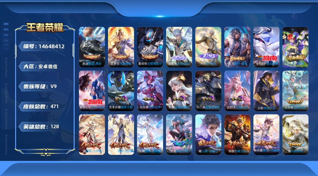 商品描述:[14648412]Xr43209-安卓WX-V9-最强王者段位-128英雄-471皮肤-3典藏-2无双-6星元-4珍品传说-42传说-143史诗【英雄全皮】:元歌全皮,达摩全皮,姜子牙全皮,孙权全皮,钟馗全皮,太乙真人全皮,鬼谷子全皮,沈梦溪全皮,蒙恬全皮,司空震全皮,戈娅全皮,空空儿全皮,影全皮【荣耀典藏】:武则天英雄,夏侯惇无限飓风号,李白鸣剑曳影,花木兰九霄神辉【无双皮肤】:李白碎月剑心,诸葛亮天机白泽【珍品传说】:马可波罗怪盗基德,鲁班七号江户川柯南,孙策时之奇旅,张飞兔狲蓬尾【传说皮肤】:后羿神树通天,干将莫邪千山共赴,元歌诡秘之主,公孙离云诺千山,司空震愿照山河定,女娲愿照千秋盛,澜愿照九州拓,云缨幻光神枪,王昭君映山客,桑启鸣野蒿,亚连落雪白狼,吕布曦玄引,孙尚香乘龙问璇玑,赵云乘龙铭钟鼎,宫本武藏惊梅引,云缨鹤归松栖,干将莫邪画中仙,花木兰燃星之曲,项羽无限倾心,孙悟空齐天大圣,曜山海苍雷引,李白诗剑行,马超无双飞将,孙策末日机甲,王昭君乞巧织情,周瑜音你心动,小乔音你心动,李元芳飞鸢探春,铠绛天战甲,镜炽阳神光,虞姬启明星使,李信一念神魔,刘备时之恋人,干将莫邪久胜战神,达摩黄金狮子座,后羿黄金射手座,杨戬永曜之星,貂蝉仲夏夜之梦,孙尚香末日机甲,宫本武藏地狱之眼,武则天海洋之心,狄仁杰超时空战士【限定皮肤】:白起狰,蒙犽顽岩魄,姜子牙天穹之誓,杨戬破阵退雄兵,狄仁杰阴阳师,赵云皇家上将,赵云引擎之心,墨子神迹守卫,嬴政优雅恋人,鲁班七号狮舞东方,庄周高山流水,高渐离死亡摇滚,高渐离玩趣恶龙,扁鹊奇幻香踪,白起夜都怪侠,芈月重明,芈月白晶晶,芈月幻夜卜梦,吕布御风骁将,周瑜赤莲之焰,元歌云间偶戏,元歌无心,夏侯惇朔风刀,甄姬游园惊梦,甄姬落雪兰心,曹操烛龙,典韦穷奇,典韦蓝屏警告,马可波罗暗影游猎,马可波罗山海玄木吟,狄仁杰魔术师,狄仁杰万华元夜,达摩星际陆战队,达摩沙漠行僧,项羽海滩派对,项羽无限倾心,老夫子醍醐杖,老夫子航海奇遇记,关羽冰锋战神,安琪拉魔法小厨娘,程咬金演武夺筹,韩信傲雪梅枪,王昭君午后时光,兰陵王驯魔猎人,兰陵王金庭之子,花木兰燃星之曲,亚瑟潮玩骑士王,孙悟空至尊宝,孙悟空孙行者,孙悟空齐天大圣,牛魔御旌,后羿辉光之辰,后羿如梦令,后羿圣弓游侠,李元芳匿光侦查者,李元芳云中旅人,虞姬启明星使,钟馗神迹守卫,钟馗驱傩正仪,杨玉环遇见