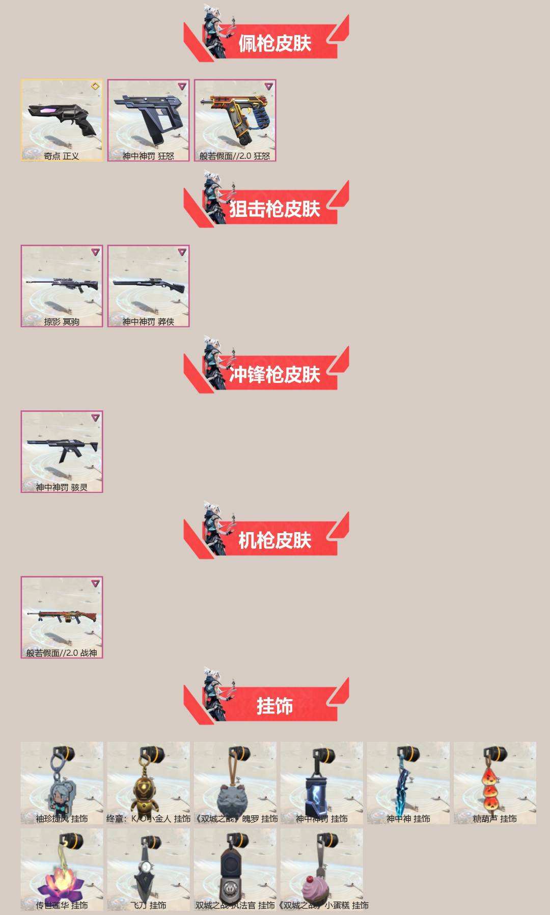 商品描述:[15294309]10橙皮 11紫皮 52皮肤 28英雄 91卡面 810已用源晶 黄金段位 【套装】:般若假面//2.0套装,《双城之战》收藏套装,神罚套装,神中神罚套装【近战武器皮肤】:神之刃,诡秘蛇影,鬼丸国纲,荒土机兵热能刀,拳套-双城之战【佩枪皮肤】:狂怒-般若假面//2.0,狂怒-神中神罚,正义-奇点【冲锋枪皮肤】:骇灵-神中神罚【步枪皮肤】:幻影-神中神罚,獠犬-般若假面//2.0,狂徒-般若假面//2.0,狂徒-双城之战,狂徒-盖亚的复仇,狂徒-塑水宗,狂徒-偃月苍龙,狂徒-堕天遗武,幻影-破败军械【狙击枪皮肤】:莽侠-神中神罚,冥驹-掠影【机枪皮肤】:战神-般若假面//2.0【挂饰】:袖珍捷风挂饰,神中神罚挂饰,神中神挂饰,传世莲华挂饰,双城之战小蛋糕挂饰,双城之战魄罗挂饰,双城之战执法官挂饰,糖葫芦挂饰,终章KO小金人挂饰,飞刀挂饰