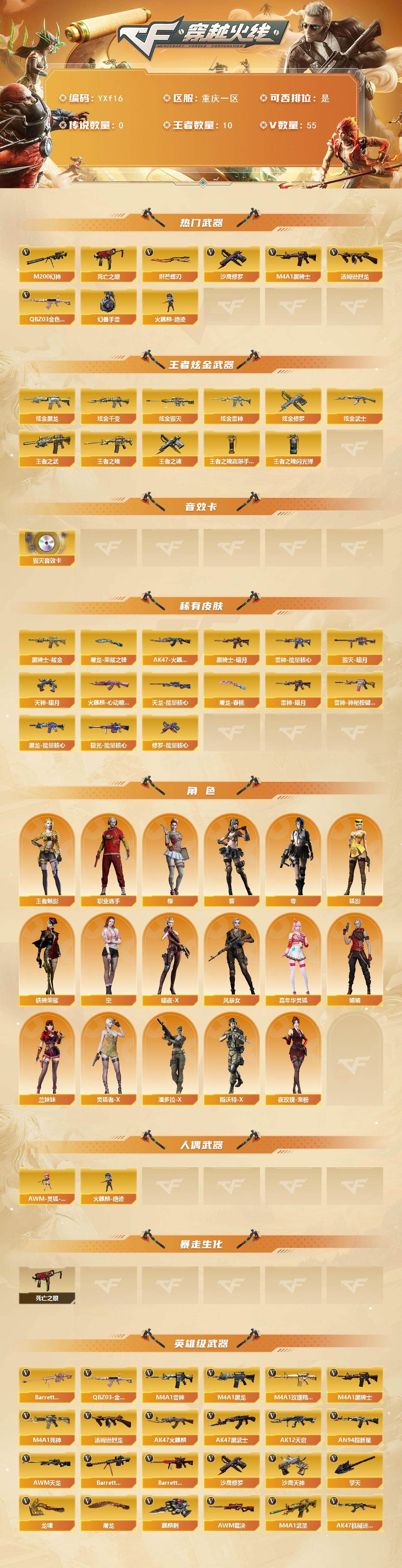 M7256/西部/四川一区/可排位/69v/幻神/幻神丹凤/王者幻神/觉醒版/6盘龙/6烈龙/【竞技荣光套/M00技荣光/柯尔特竞技荣光/*2/擎天竞技荣光/】/白虎/机械迷城穹宇/炼狱百战金芒/炼狱百战金芒庆典舞曲音效卡/王者之灵/【四防角色/王者春/】/【角色】/电竞教官云悠悠/迷迭香/零纪元/幻面灵狐/葵阿尔法武装/乔伊教练/王者涂鸦/【音效卡/炼狱百战金芒庆典舞曲音效卡/】/【枪皮】/修罗百战金芒/雷神耀金/雷神白鲨/王者武器/王者之城/王者之心/王者之势/王者之武/王者之刺/炫金武器/炫金黑龙/【小人枪/火麒麟零纪元/裁决雪莉杨/】/永久AC/有过十年记录/找回包赔
