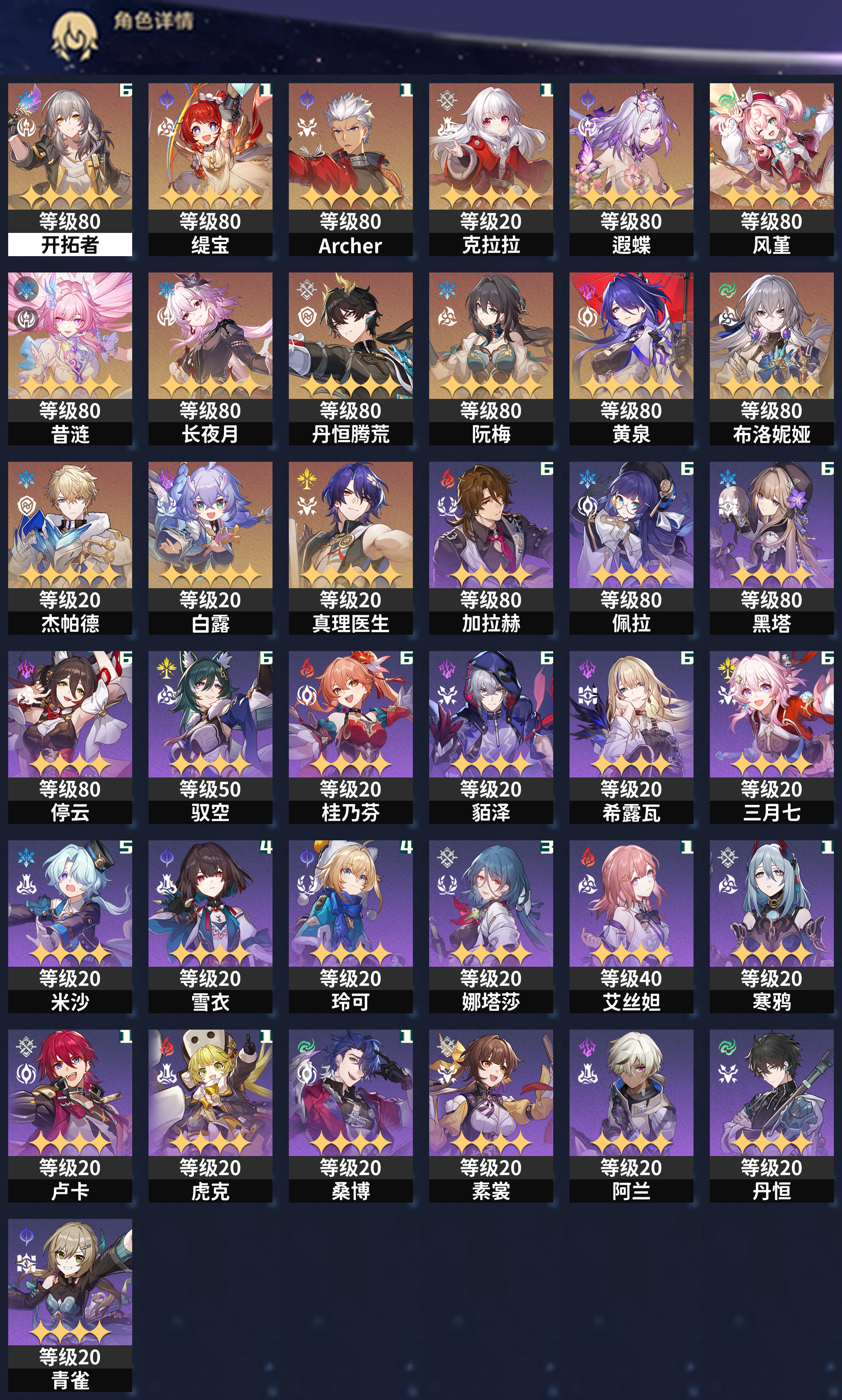 【崩坏·星穹铁道】【LYXQ6871】冒险等级:70,女主,五星数量:36,绑定情况:邮箱__五星角色:杰帕德 * 2命|白露 * 2命|姬子 * 2命|遐蝶 * 1命|布洛妮娅 * 1命|风堇|缇宝|长夜月|丹恒·腾荒|白厄|波提欧|银枝|忘归人|阮·梅|阿格莱雅|乱破|丹恒·饮月|罗刹|云璃|刻律德菈|Archer|瓦尔特|彦卿|希儿|真理医生__五星光锥:记一位星神的陨落 * 5精|比阳光更明亮的|驶向第二次生命|忍法帖·缭乱破魔|金血铭刻的时代|制胜的瞬间|让告别,更美一些|但战斗还未结束|星海巡航|以世界之名|银河铁道之夜,【邮箱未实名】