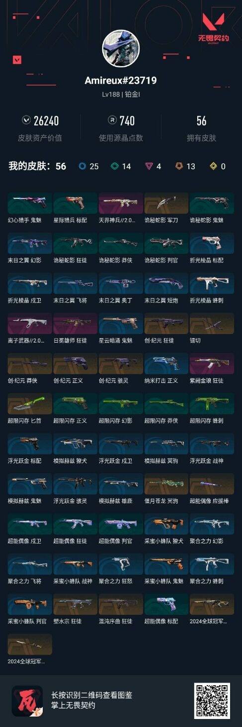 HK601/【区服】QQ【游戏等级】Lv189/【游戏段位】青铜III/【剩余V点】87/【剩余R点】100/【皮肤资产价值】56340/【使用R点】950/【英雄数量】28/【皮肤数量】67/【卡面数量】92/【喷漆数量】67/【挂件数量】67/【拥有套装】/【拥有近战武器】神圣领域-战刀/VCT-2025-爪刀/珍珠棘贝-短剑/离子武器//2.0-爪刀/噬影者-簇刃/镭切/落英飞旋/机动狂飙-战刀/剥皮小刀/侦察力量-蝴蝶刀//【拥有步枪】2022全球冠军赛-幻影/虚空遗器-幻影/噬影者-狂徒/黯夜怪谈-獠犬/砰砰X特攻队-幻影/2025全球冠军赛-狂徒/离子武器//2.0-狂徒/异鳞魔蛇-幻影/紫阙金琅//2.0-幻影/天界神兵-戍卫/紫阙金琅-狂徒/盖亚的复仇-狂徒/盖亚的复仇-戍卫/诡秘蛇影-狂徒/神圣领域-獠犬/神圣领域-幻影/珍珠棘贝-幻影/珍珠棘贝-戍卫/折光棱晶-戍卫/月球哨兵-戍卫/复古浪潮-獠犬//【拥有狙击枪】塑水宗-飞将/堕天遗武-冥驹/末日之翼-飞将/星云暗涌-冥驹/月球哨兵-莽侠/深海水族-莽侠/复古浪潮-冥驹//【拥有机枪】离子武器//2.0-战神/神圣领域-战神/末日之翼-奥丁/深海水族-战神//【拥有冲锋枪】珍珠棘贝-骇灵/折光棱晶-蜂刺/星云暗涌-骇灵/星云暗涌-蜂刺/深海水族-蜂刺//【拥有霰弹枪】诡秘蛇影-判官/月球哨兵-雄鹿/复古浪潮-雄鹿//【拥有手枪】VCT25-x-EDG-标配/西部未来-正义/机动狂飙-正义/源能者娱乐系统-鬼魅/星际猎兵-标配/阿特拉斯指挥部-标配/日耀风暴-正义/神圣领域-狂怒/流星兵团-鬼魅/珍珠棘贝-狂怒/末日之翼-短炮/折光棱晶-标配/星云暗涌-鬼魅/月球哨兵-正义/纳米打击-正义/复古浪潮-正义/深海水族-短炮//【稀有挂件】V25第六幕青铜挂饰/第九季青铜挂饰/终章猫猫木乃伊挂饰/第八季青铜挂饰/终章迷你机甲挂饰/战术河童挂饰/传世莲华挂饰//【卡面信息】VCT2025CN联赛卡面/双城之战拥抱卡面/虹吸式咖啡壶卡面/找回包赔