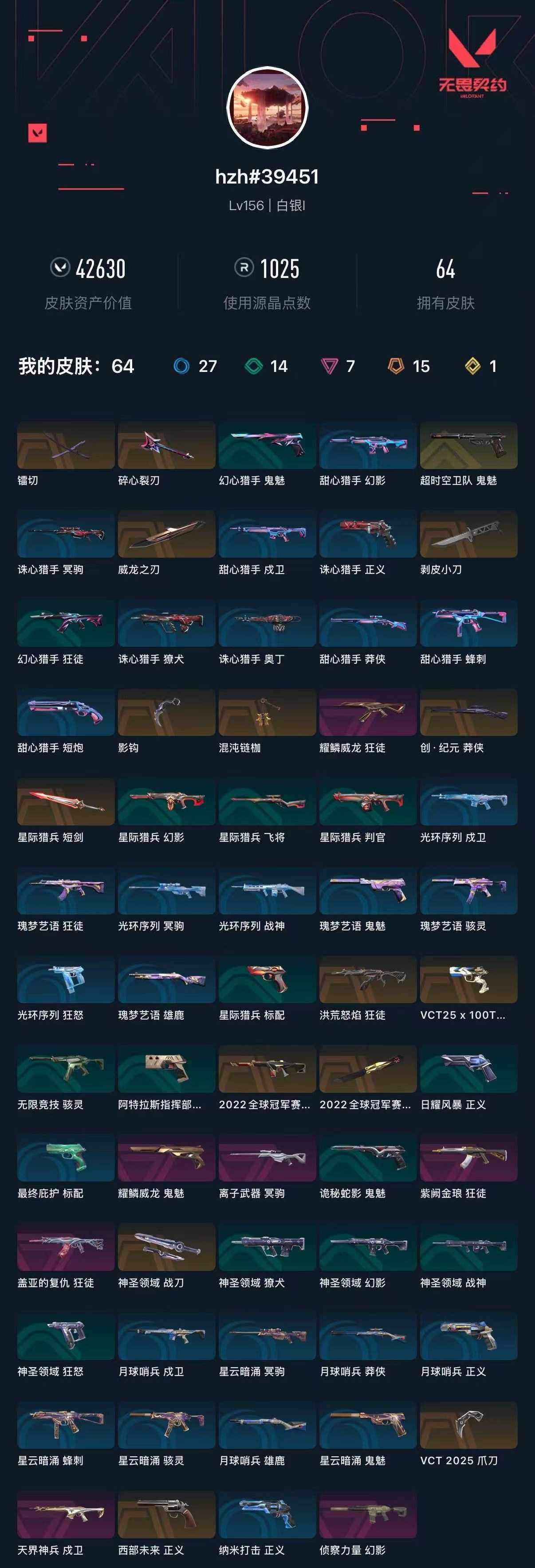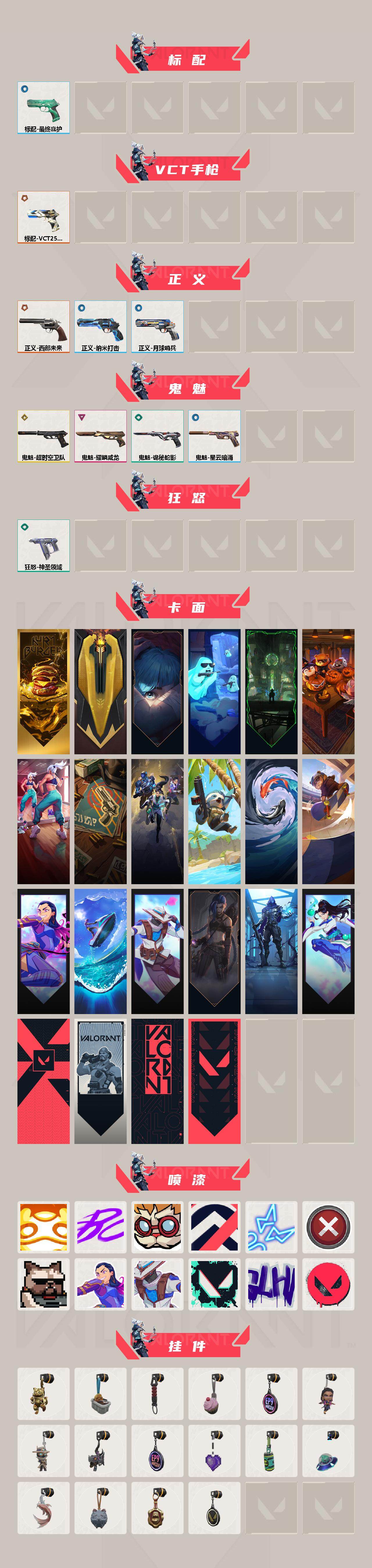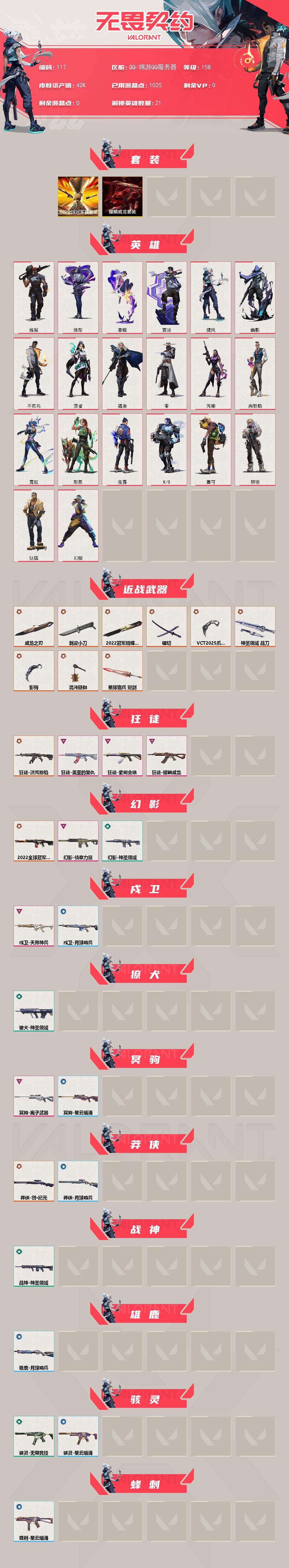 商品描述:[13698628]【套装】:2022全球冠军赛套装,VCT 2025 赛季套装,耀鳞威龙套装【英雄】:幻棱,炼狱,维斯,暮蝶,钛狐,壹决,捷风,幽影,不死鸟,贤者,猎枭,零,芮娜,尚勃勒,霓虹,斯凯,夜露,K/O,盖可,钢锁【近战 武器】:近战武器-2022全球冠军赛 蝴蝶刀,近战武器-混沌链枷,近战武器-影钩,近战武器-剥皮小刀,近战武器-VCT 2025 爪刀,近战武器-镭切,近战武器-威龙之刃,近战武器-神圣领域 战刀,近战武器-星际猎兵 短剑【狂徒】:狂徒-洪荒怒焰,狂徒-盖亚的复仇,狂徒-耀鳞威龙,狂徒-紫阙金琅【幻影】:幻影-2022全球冠军赛,幻影-侦察力量,幻影-神圣领域【戍卫】:戍卫-天界神兵,戍卫-月球哨兵【獠犬】:獠犬-神圣领域【冥驹】:冥驹-离子武器,冥驹-星云暗涌【莽侠】:莽侠-创·纪元,莽侠-月球哨兵【战神】:战神-神圣领域【雄鹿】:雄鹿-月球哨兵【骇灵】:骇灵-无限竞技,骇灵-星云暗涌【蜂刺】:蜂刺-星云暗涌【标配】:标配-最终庇护【VCT手枪】:标配-VCT25 x 100T【正义】:正义-西部未来,正义-纳米打击,正义-月球哨兵【鬼魅】:鬼魅-超时空卫队,鬼魅-耀鳞威龙,鬼魅-诡秘蛇影,鬼魅-星云暗涌【狂怒】:狂怒-神圣领域【卡面】:终章:激斗汉堡 卡面,进入射程 卡面,《双城之战》拥抱 卡面,精灵大战 卡面,欢迎来到底城 卡面,南瓜盛典 卡面,热舞环节 卡面,正义的化身 卡面,复活专家 卡面,树懒大作战 卡面,红鳞松叶 卡面,Clutch 卡面,无畏契约GO!第一卷:芮娜 卡面,复古浪潮 卡面,无畏契约GO!第一卷:零 卡面,《双城之战》金克丝 卡面,暗枪 卡面,无畏契约GO!第一卷:贤者 卡面,代号红色 卡面,新兵报到 卡面,V契约 卡面,无畏契约 卡面【喷漆】:嗨宝南瓜灯 喷漆,嘭! 喷漆,都算到了 喷漆,控场勿近 喷漆,霓光四射 喷漆,买装还是存钱 喷漆,关门放狗 喷漆,无畏契约GO!第一卷:芮娜 喷漆,无畏契约GO!第一卷:零 喷漆,胜利属于无畏契约 喷漆,GLHF 喷漆,无畏契约 喷漆【挂饰】:终章:猫猫木乃伊 挂饰,悠闲鸡块 挂饰,伞绳 挂饰,《双城之战》小蛋糕 挂饰,第九季//第三幕 纪念币 挂饰,无畏契约GO!第一卷 芮娜 挂饰,无畏契约GO!第一卷 零 挂饰,鱼骨头 挂饰,第九季//第二幕