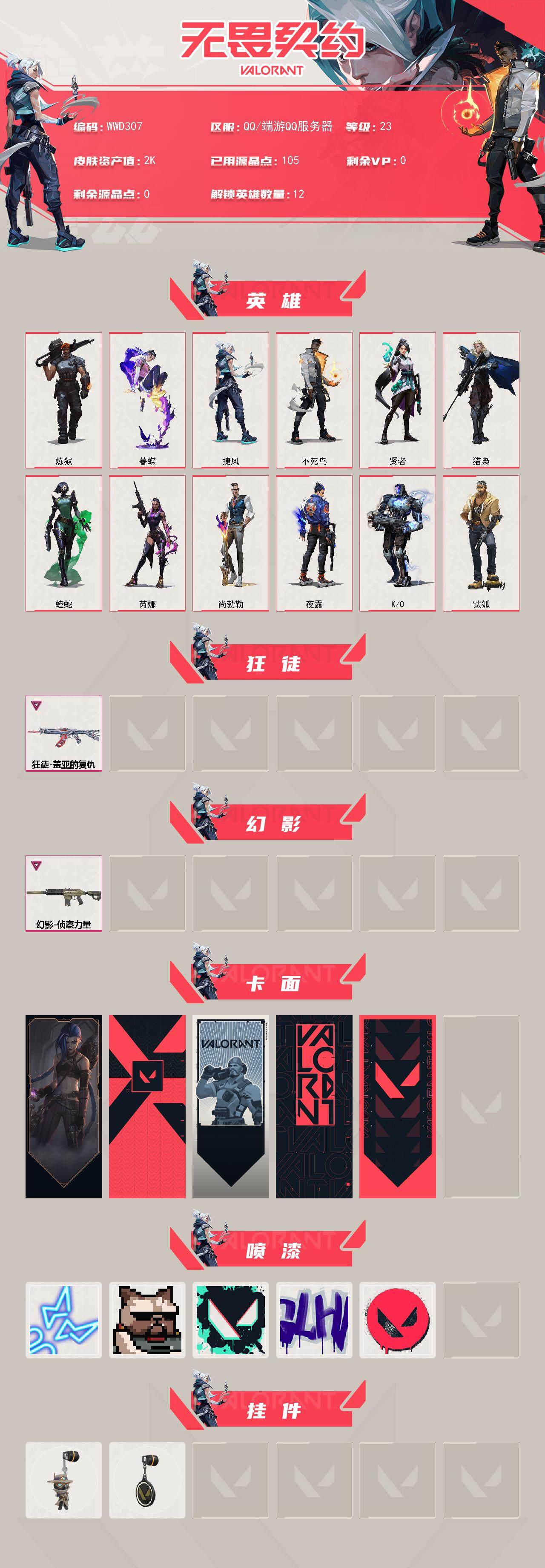商品描述:【WWD307】卓越*2/皮肤*5/等级*23/段位:黑铁/炼狱/暮蝶/钛狐/捷风/不死鸟/贤者/猎枭/蝰蛇/芮娜/尚勃勒/夜露/K/O/狂徒-盖亚的复仇/幻影-侦察力量/《双城之战》金克丝 卡面/代号红色 卡面/新兵报到 卡面/V契约 卡面/无畏契约 卡面/霓光四射 喷漆/关门放狗 喷漆/胜利属于无畏契约 喷漆/GLHF 喷漆/无畏契约 喷漆/无畏契约GO!第一卷 零 挂饰/无畏契约 纪念币 挂饰