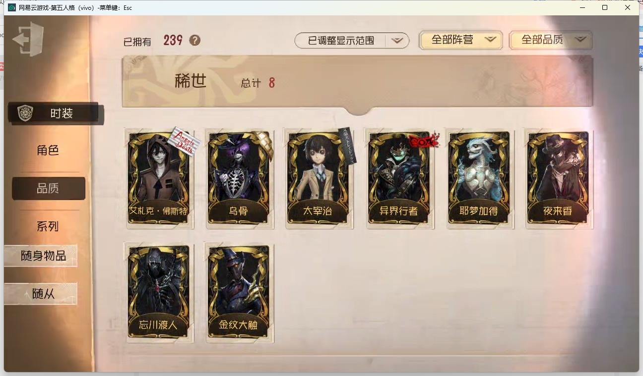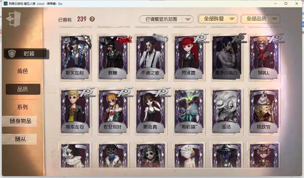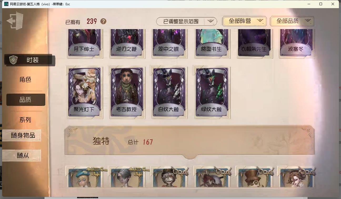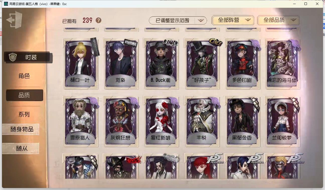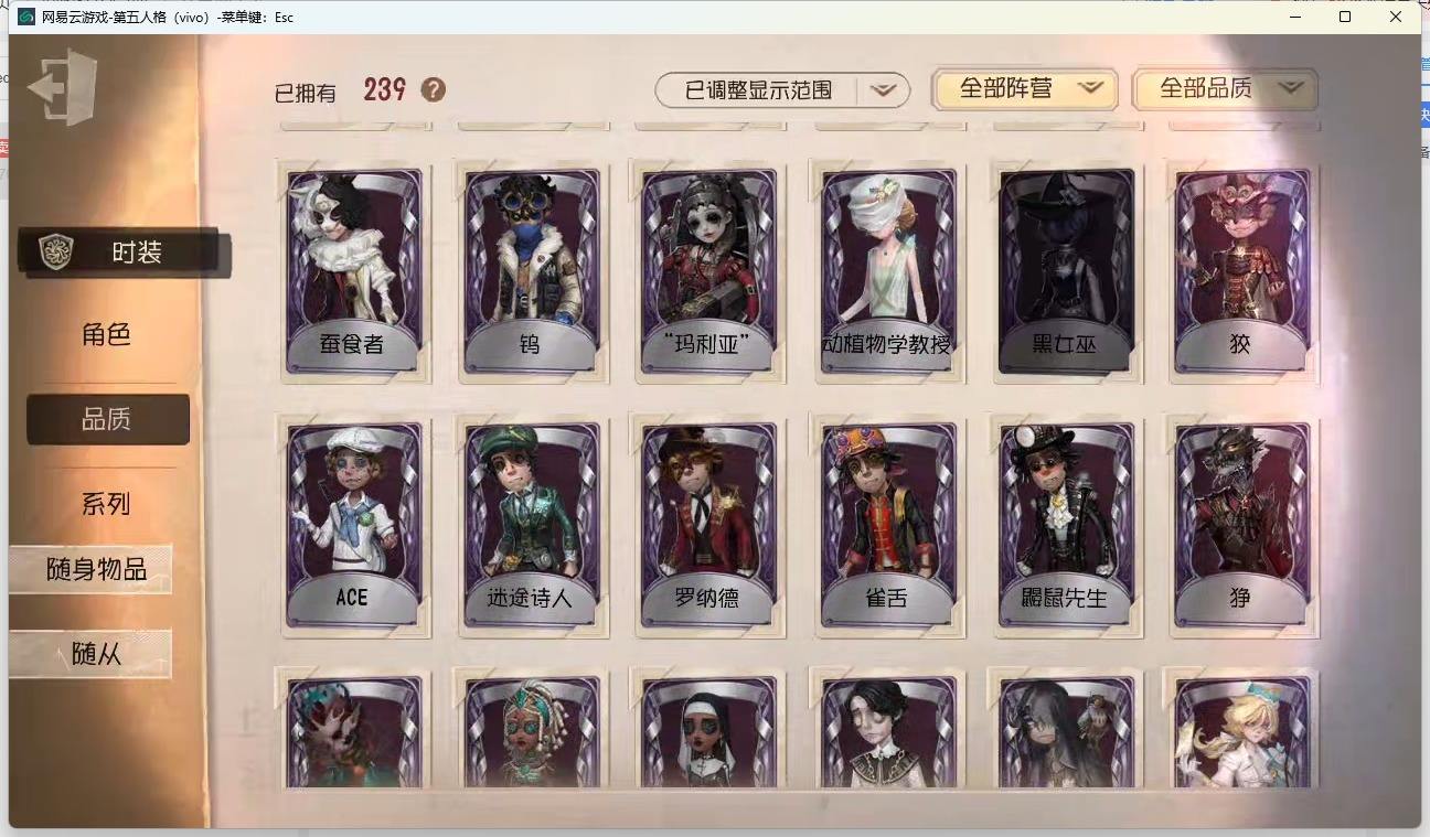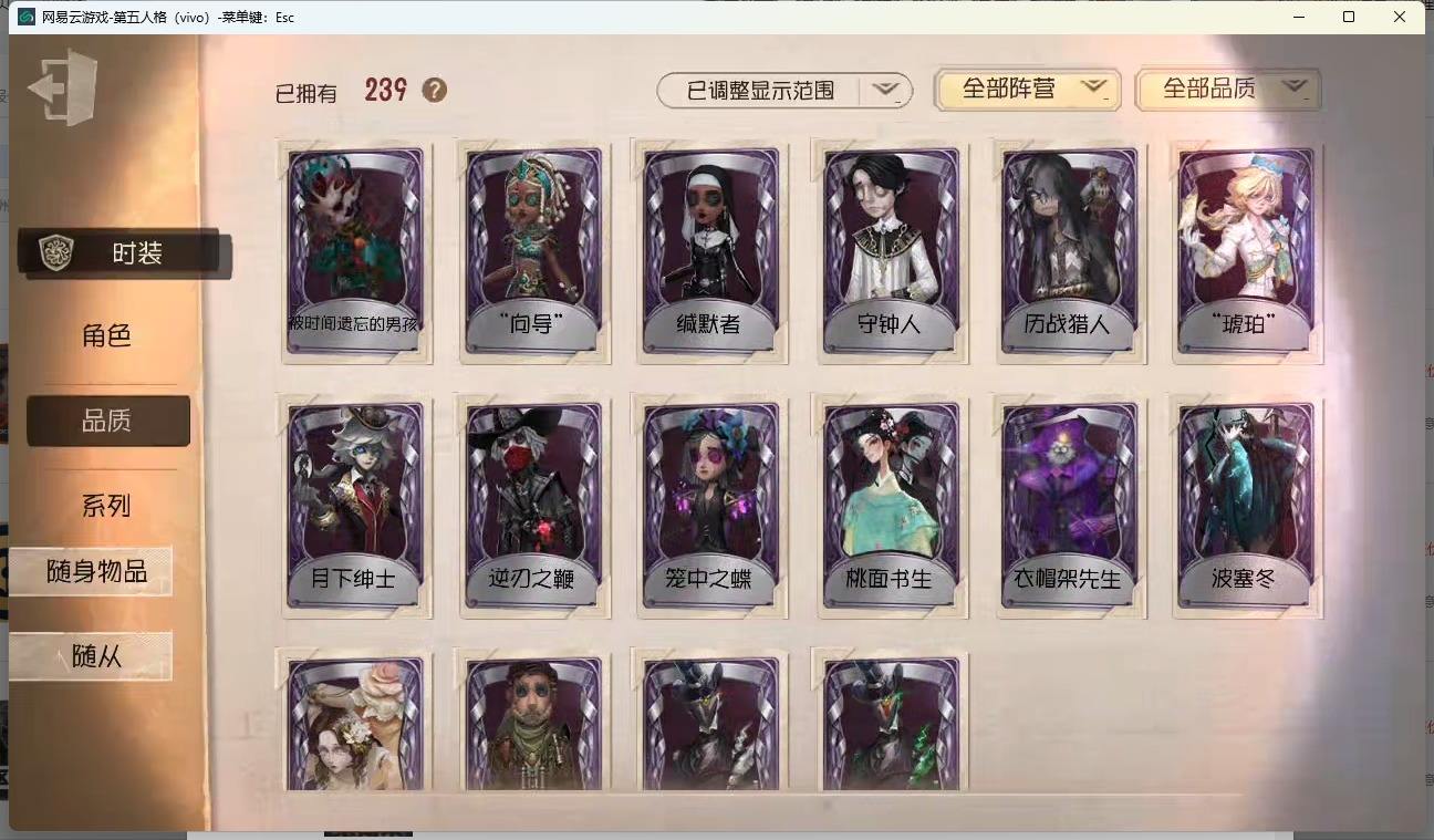 商品描述:[13788346]VIVO 手机账号 239时装 8金皮 64紫皮 12随从 102随身物品 【时装】:教授-丹尼尔·狄更斯,空军-凯瑟琳·沃德,律师-亚伯拉罕·葛雷,幸运儿-星航之旅,咒术师-灰烬狂想,野人-雪原猎人,佣兵-B.Duck潮,“记录员”-执政官,“杰克”-艾札克·佛斯特,“噩梦”-圣洁,杂技演员-狡,厂长-丰悦,“杰克”-加里,孽蜥-耶梦加得,隐士-刘枭,邮差-华生医生,大副-雷斯垂德探长,雕刻家-善忘的海马体,小说家-肖驰,“杰克”-乌骨,佣兵-OPH.NAIB,时空之影-“有机磷”,击球手-钨,画家-多色印刷,飞行家-警戒哨台,小说家-“伊始新篇”,“法罗女士”-芳泽霞,空军-新岛真,机械师-佐仓双叶,哭泣小丑-蚕食者,空军-樋口一叶,勘探员-黑郁金香,昆虫学者-动植物学教授,“杰克”-夜来香,“杰克”-“好孩子",雕刻家-“玛利亚”,画家-江户川乱步,“杰克”-金纹大触,“杰克”-斯文加利,“杰克”-忘川渡人,“杰克”-不速之客,调香师-猩红新娘,园丁-兰闺惊梦,小丑-异界行者,牛仔-教鞭,前锋-坂本龙司,前锋-SKULL,“囚徒”-太宰治