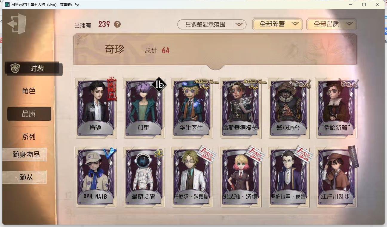 [13739658]哔哩哔哩 手机账号 330时装 25金皮 86紫皮 7随从 110随身物品 【时装】:宿伞之魂-粲然的北辰,心理学家-长夜,佣兵-赤井秀一,记者-永恒,蜘蛛-花祭,“心理学家”-末世搜救,勘探员-枭徒,冒险家-赞因,心理学家-菲伦,空军-尼德霍格,空军-寒香舞,空军-毛利兰,祭司-引路人,律师-毛利小五郎,昆虫学者-索菲亚,昆虫学者-黑女巫,26号守卫-黑白熊,“博士”-征服,红夫人-夜潮,画家-江户川乱步,“杰克”-盛宴伯爵,“杰克”-忘川渡人,红夫人-贝拉夫人,红蝶-白无垢,黄衣之主-死灵师,红夫人-赤宴,医生-试运者,调酒师-贝尔摩德,调香师-今夜不再,调香师-灰原哀,医生-罪木蜜柑,先知-怪盗基德,前锋-SKULL,梦之女巫-川上富江,前锋-服部平次,摄影师-亚兹拉尔,前锋-霓虹先锋,入殓师-安室透