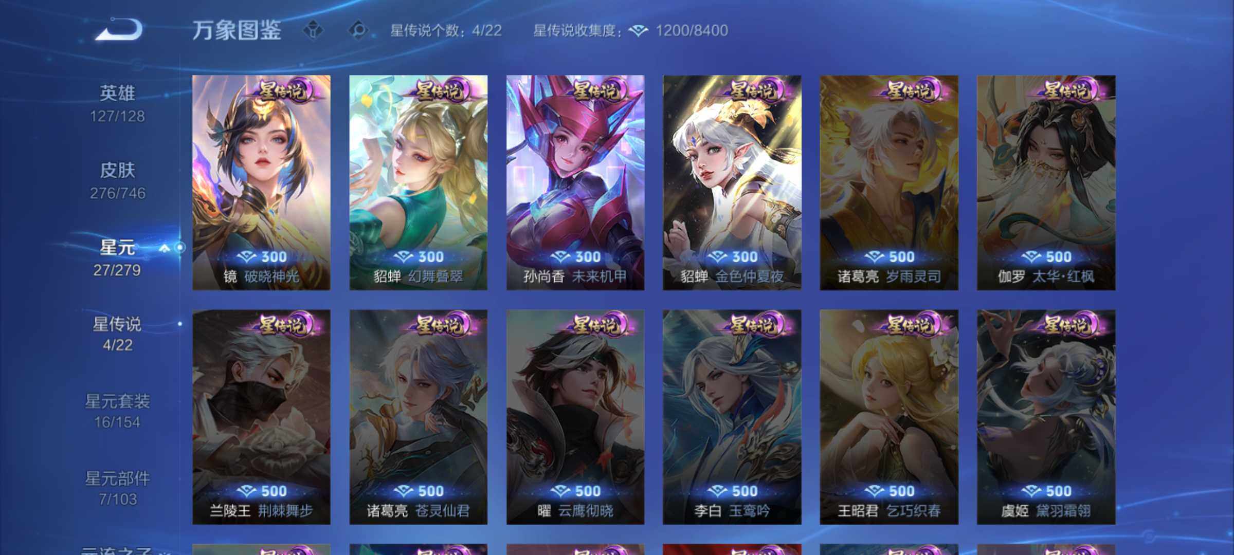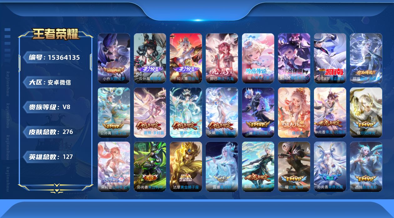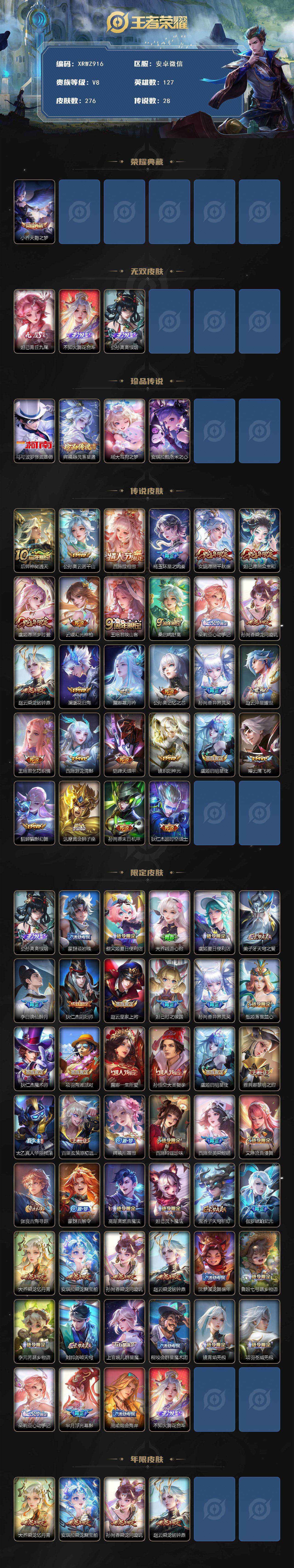 商品描述:[15364135]Xr45249-安卓WX-可二次-V8-最强王者段位-127英雄-276皮肤-1典藏-0珍品无双-3无双-4珍品传说-28传说-95史诗【英雄全皮】:孙权全皮,西施全皮,空空儿全皮,影全皮,少司缘全皮【荣耀典藏】:小乔天鹅之梦【无双皮肤】:妲己青丘九尾,不知火舞花合斗,公孙离离恨烟【珍品传说】:马可波罗怪盗基德,嫦娥器灵落星盏,瑶大耳狗之梦,安琪拉酷洛米之心【传说皮肤】:后羿神树通天,公孙离云诺千山,西施续相思,杨玉环星之鸣奏,女娲愿照千秋盛,妲己愿照众生和,虞姬愿照岁时盈,云缨幻光神枪,王昭君映山客,桑启鸣野蒿,朵莉亚心动手记,孙尚香乘龙问璇玑,赵云乘龙铭钟鼎,澜逐花归海,露娜霜月吟,公孙离记忆之芯,孙尚香异界灵契,赵云淬星耀世,王昭君乞巧织情,西施游龙清影,铠绛天战甲,镜炽阳神光,虞姬启明星使,曜云鹰飞将,貂蝉猫影幻舞,达摩黄金狮子座,孙尚香末日机甲,狄仁杰超时空战士【限定皮肤】:公孙离离恨烟,蒙犽顽岩魄,蔡文姬夏日便利店,大乔绒语心约,虞姬夏日便利店,姜子牙天穹之誓,李白谪仙醉月,狄仁杰阴阳师,赵云皇家上将,妲己时之彼端,孙尚香异界灵契,甄姬落雪兰心,狄仁杰魔术师,项羽海滩派对,露娜一生所爱,孙悟空大圣娶亲,虞姬启明星使,雅典娜黎明之约,太乙真人华丽摇滚,百里玄策原初追逐者,嫦娥拒霜思,西施玲珑珍味,西施至美乘鲤谣,艾琳流音漫舞,张良古海寻踪,蒙犽百解令,高渐离燃音魔法,妲己灵卜魔法,鬼谷子天穹祈灯,伽罗琥珀纪元,大乔乘龙忆丹青,安琪拉乘龙聚宝船,孙尚香乘龙问璇玑,赵云乘龙铭钟鼎,沈梦溪龙舞盛年,鲁班七号蔬乡物语,李元芳蔬乡物语,刘邦剑破天穹,上官婉儿群星魔术团,程咬金群星魔术团,镜青焰无极,项羽苍威无极,朵莉亚心动手记,芈月浮光幕影,周瑜熔金海岸,不知火舞花合斗【年限皮肤】:大乔乘龙忆丹青,安琪拉乘龙聚宝船,孙尚香乘龙问璇玑,赵云乘龙铭钟鼎【赛季限定】:张良古海寻踪,雅典娜黎明之约,百里玄策原初追逐者,鬼谷子天穹祈灯,刘邦剑破天穹,姜子牙天穹之誓【战令限定】:蔡文姬夏日便利店,虞姬夏日便利店,甄姬落雪兰心,艾琳流音漫舞,西施玲珑珍味,高渐离燃音魔法,妲己灵卜魔法,鲁班七号蔬乡物语,李元芳蔬乡物语,镜青焰无极,项羽苍威无极【史诗皮肤】:露娜紫霞仙子,赵云皇家上将,赵云未来纪元,貂蝉圣诞恋歌,甄姬冰雪圆舞曲,王昭君偶像歌手,狄仁杰魔术师,廉