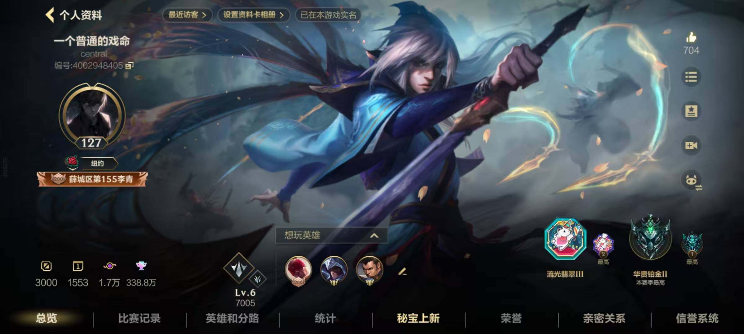 [13724249]1典藏 7神话 11限定 53传说 233史诗 406皮肤 可二次 可修改实名 【段位】:翡翠 【典藏皮】:超武乾坤:虹影 【神话皮】:夜星流火 金克丝,臻藏 翩翩绣蕊 霞,雷霆神兵 沃利贝尔,至臻锐雯,灰烬骑士派克,至臻心之钢永恩,龙的传人 【限定皮肤】:龙的传人,斩星魔剑,星之守护者霞,星之守护者洛,神龙烈焰金克丝,张辽文远,水晶玫瑰皇子,美猴王,水晶玫瑰永恩,水晶玫瑰蔚,关羽云长 【传说皮】:暗星尊,光电璀璨泽丽,水晶玫瑰 卡莎,神龙尊者 圣龙 李青,御风墨影 亚索,斗魂觉醒 莎弥拉,黎明使者德莱文,光影巨翼亚托克斯,源计划:毁灭,魔女伊芙琳,心之钢凯隐,灵魂莲华腕豪,星之守护者卡莎,星之守护者 阿卡丽,西部魔影 永恩,水晶玫瑰 凯特琳,水晶玫瑰 阿狸,天棱快晴 伊泽瑞尔,神龙尊者 昼日真龙 亚索,北极星神 黛安娜,霸天零式塞恩,斗魂无双亚索,西部魔影卢锡安,天煞劫,神王诺手,神王盖伦,神拳盲僧,神龙尊者 驭风啸龙,欧米伽小队 幽灵特工,女主播风女,律政大亨,炼狱魔犬,黎明使者锐雯,K/DA ALLOUT萨勒芬妮,黑夜使者亚索,光明哨兵薇恩,灌篮高手,福牛守护者女枪,西部天使寒冰,太空律动机器人,跳跳倩影女枪,光明哨兵格雷福斯,暗星女王拉克丝,源计划:泯灭,源计划:林,黎明使者永恩,星之守护者金克丝,战斗学院ez,源计划:联合,源计划:净化,星之守护者 陨,星之守护者 落,星之守护者阿狸