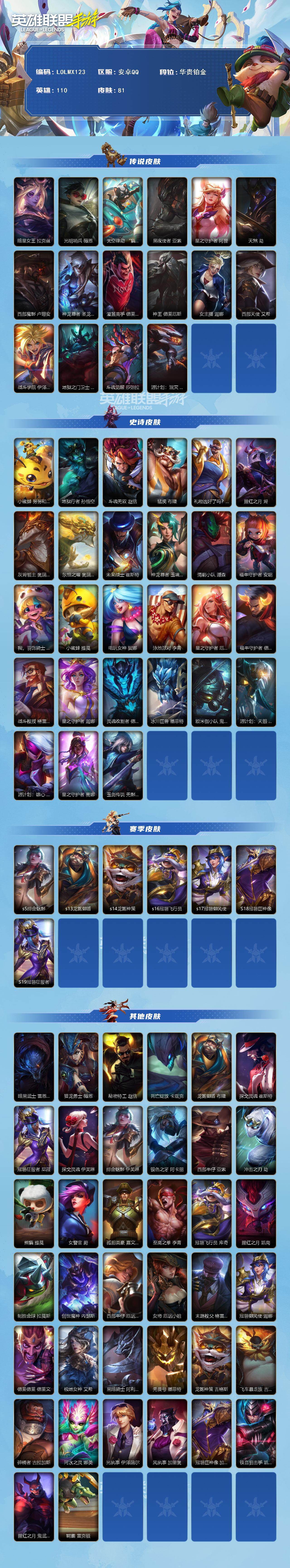 商品描述:【LOLMX123】110英雄/81皮肤/华贵铂金/暗星女王 拉克丝/光明哨兵 薇恩/太空律动 “猫猫”布里和里茨 布里茨/黑夜使者 亚索/星之守护者 阿狸/天煞 劫/西部魔影 卢锡安/神龙尊者 圣龙 李青/灌篮高手 德莱厄斯/神王 德莱厄斯/女主播 迦娜/西部天使 艾希/战斗学院 伊泽瑞尔/地狱之门卫士 加里奥/斗魂觉醒 莎弥拉/源计划:泯灭 雷克顿/小蜜蜂 努努和威朗普/地狱行者 孙悟空/斗魂无双 赵信/猛虎 布隆/礼物选好了吗? 布隆/腥红之月 烬/灰烬领主 奥瑞利安·索尔/东恒之曜 奥瑞利安·索尔/未来战士 崔斯特/神龙尊者 玉境灵龙 卡莎/清剿小队 潘森/福牛守护者 安妮/我,羽饰