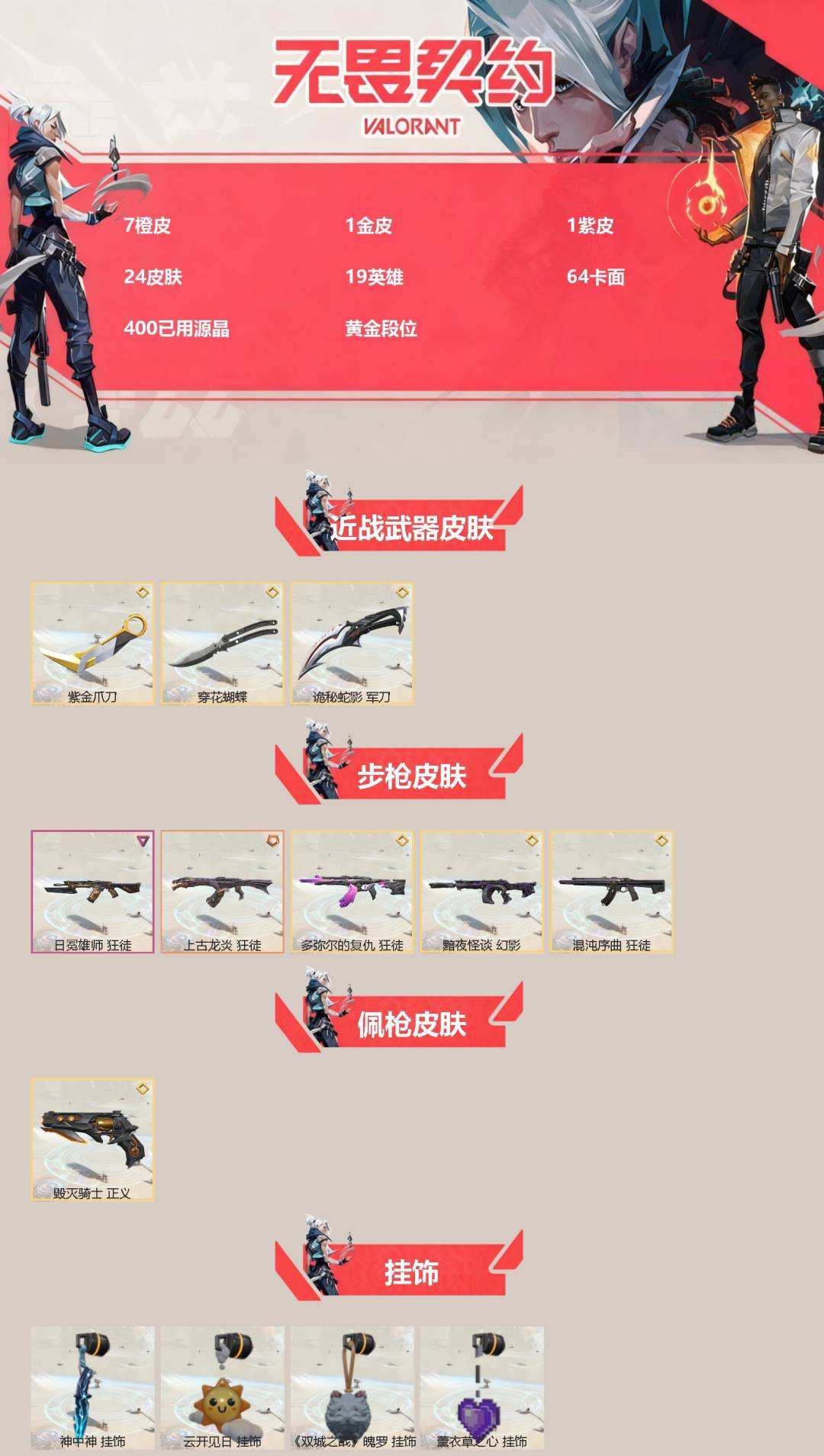 【WWC577】卓越*2/皮肤*4/等级*31/段位:白银/炼狱/维斯/暮蝶/捷风/幽影/不死鸟/贤者/猎枭/零/芮娜/狂徒-日冕雄师/骇灵-无限竞技/正义-离子武器/钢弓与箭弦 卡面/钢锁工牌 卡面/无畏契约GO!第一卷:零 卡面/钢锁vs盖可 卡面/代号红色 卡面/新兵报到 卡面/V契约 卡面/无畏契约 卡面/买装还是存钱 喷漆/胜利属于无畏契约 喷漆/GLHF 喷漆/无畏契约 喷漆/无畏契约GO!第一卷 零 挂饰/天外飞客 挂饰/无畏契约 纪念币 挂饰