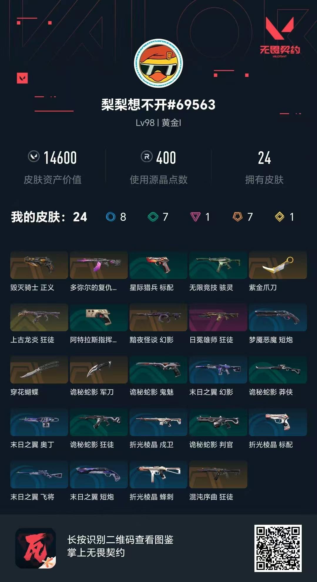 [13789531]7橙皮 1金皮 1紫皮 24皮肤 19英雄 64卡面 400已用源晶 黄金段位 【近战武器皮肤】:诡秘蛇影,穿花蝴蝶,紫金爪刀 【佩枪皮肤】:正义-毁灭骑士 【步枪皮肤】:狂徒-上古龙炎,幻影-黯夜怪谈,狂徒-混沌序曲,多弥尔的复仇 狂徒,狂徒-日冕雄师 【挂饰】:薰衣草之心挂饰,双城之战魄罗挂饰,神中神挂饰,云开见日挂饰