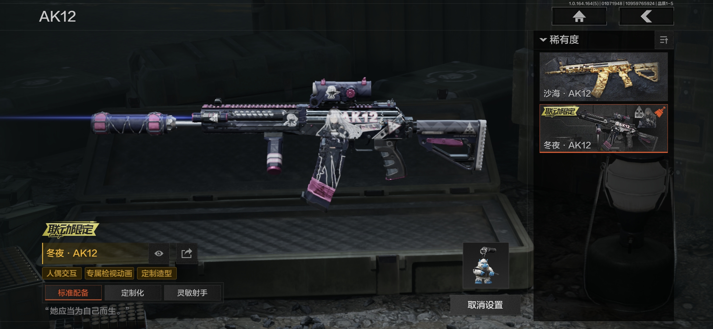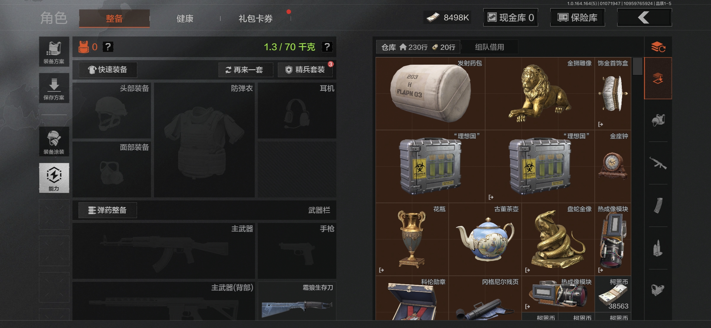 库存价值23.3 5近战武器 2金套装 10金枪皮 可修改实名 【柯恩币数量】4014k现金库10m【角色装扮(金)】使徒·欧瑞恩,机车朋克战衣【近战武器】空腔战术,收割者,工兵铲,来战·开山刀,霜狼生存刀【金色枪皮】告丧夜曲·AUG,利齿风暴·MPX,浮鳞影青·QBZ192,旧王圣谕·QBZ191,旧王圣谕·VSS,战术大师·AEK,包络战术·AKM,骑士之剑·AX50,冰河碎影·14,竞技·FAL【紫色枪皮】利齿风暴·T79,骤羽尖啸·AK12,鱼跃丹青·T85,鱼跃丹青·DT MDR,旗帜·RPK16,棱光裂变·AK102,棱光裂变·ACE31,棱光裂变·莫辛,逆火玄石·P90,典礼武备·GROZA,典礼武备·MCX,粉绒臻选·SKS,战术大师·AK74N,战术大师·SVDS,旗帜脉冲·M110,潜渊蛇鳞·M4A1,无畏·USAS12,骑士之剑·AKS74U,骑士之剑·SJ16,北国内卫·AN94,湖冰倒影·MP5【角色装扮(紫)】鎏金街头套装,金狮护身·转运套装