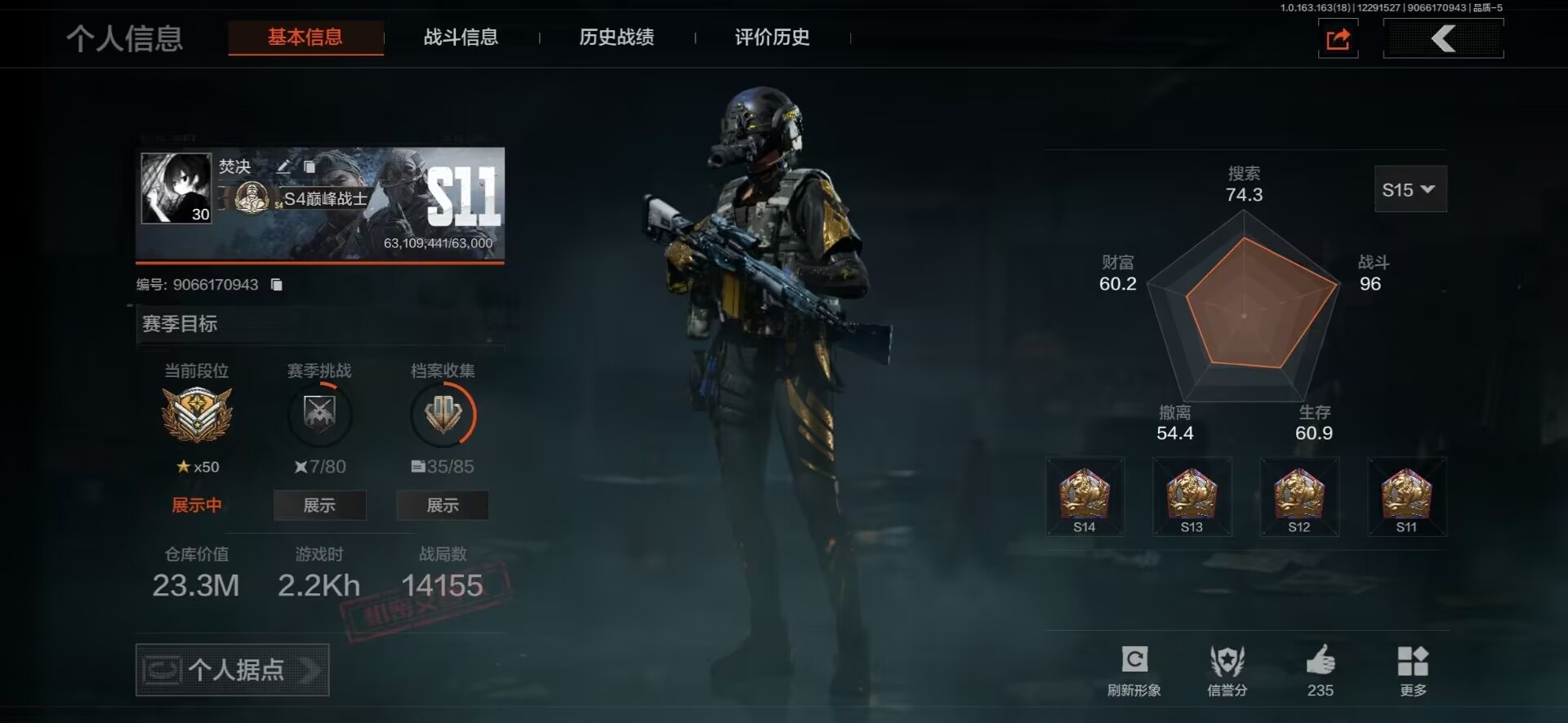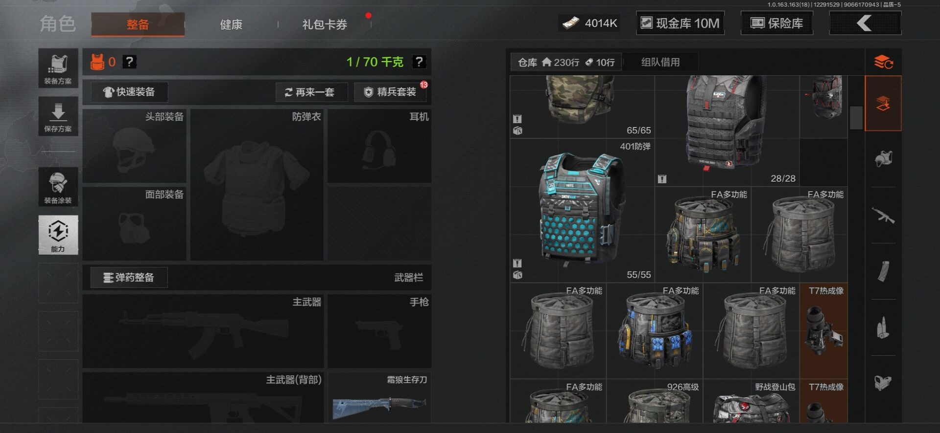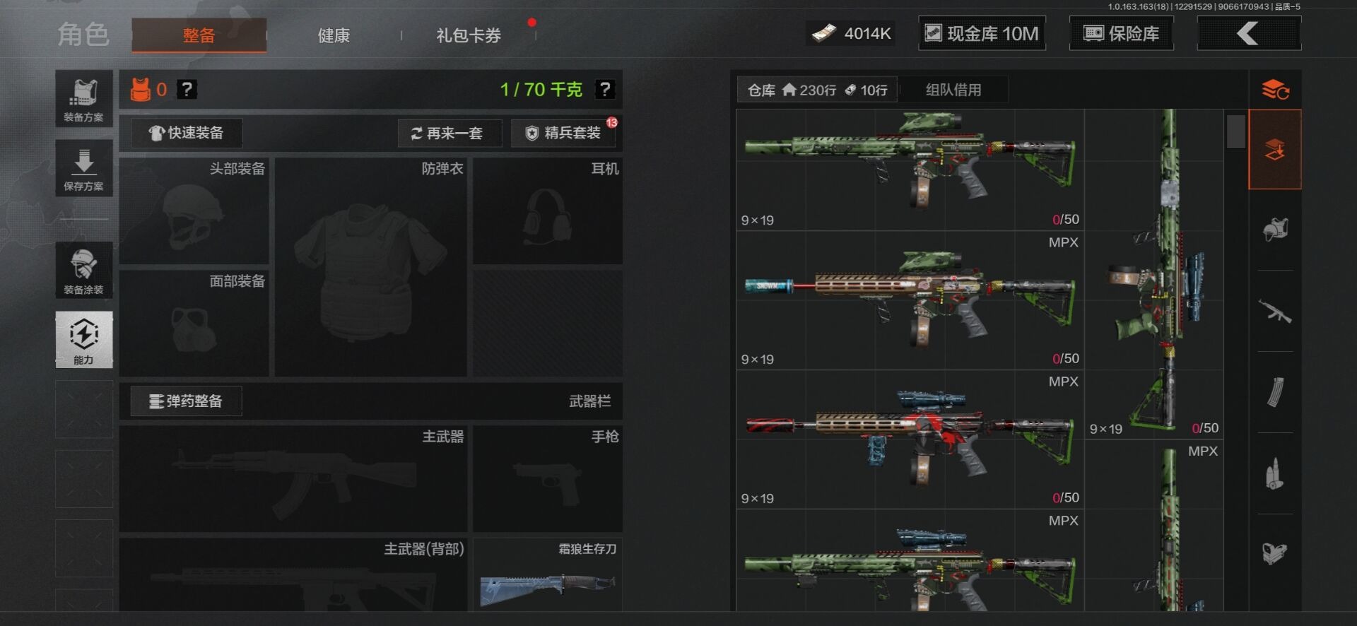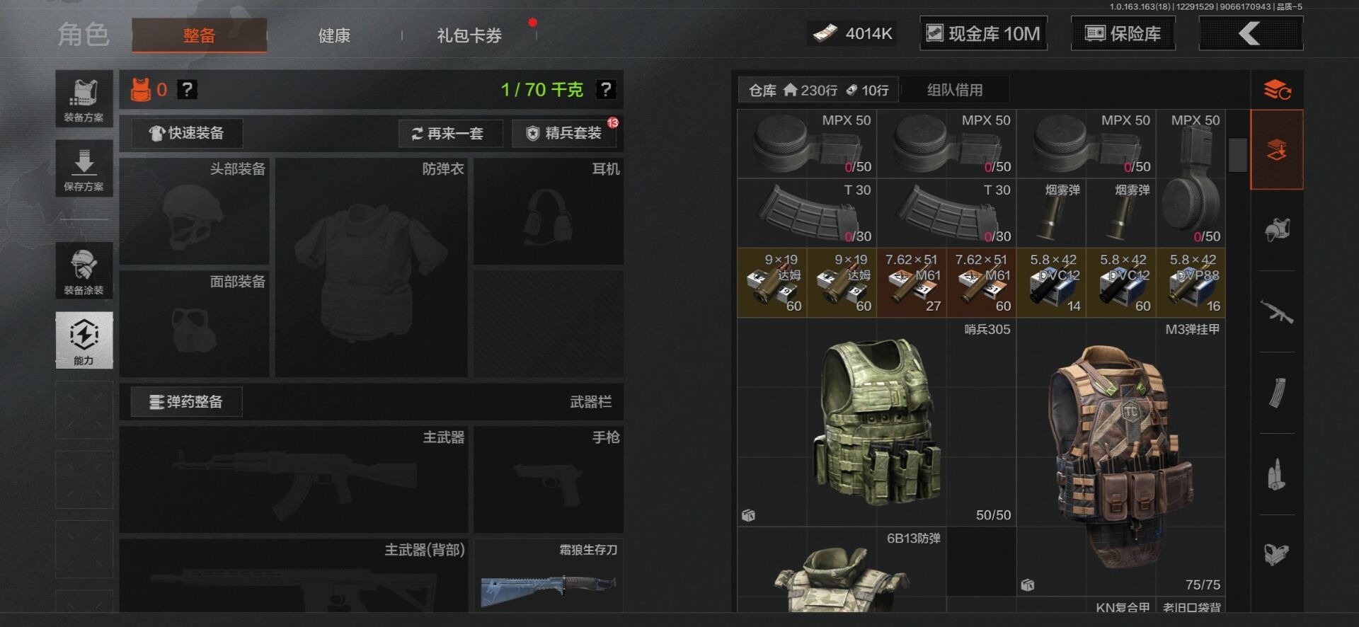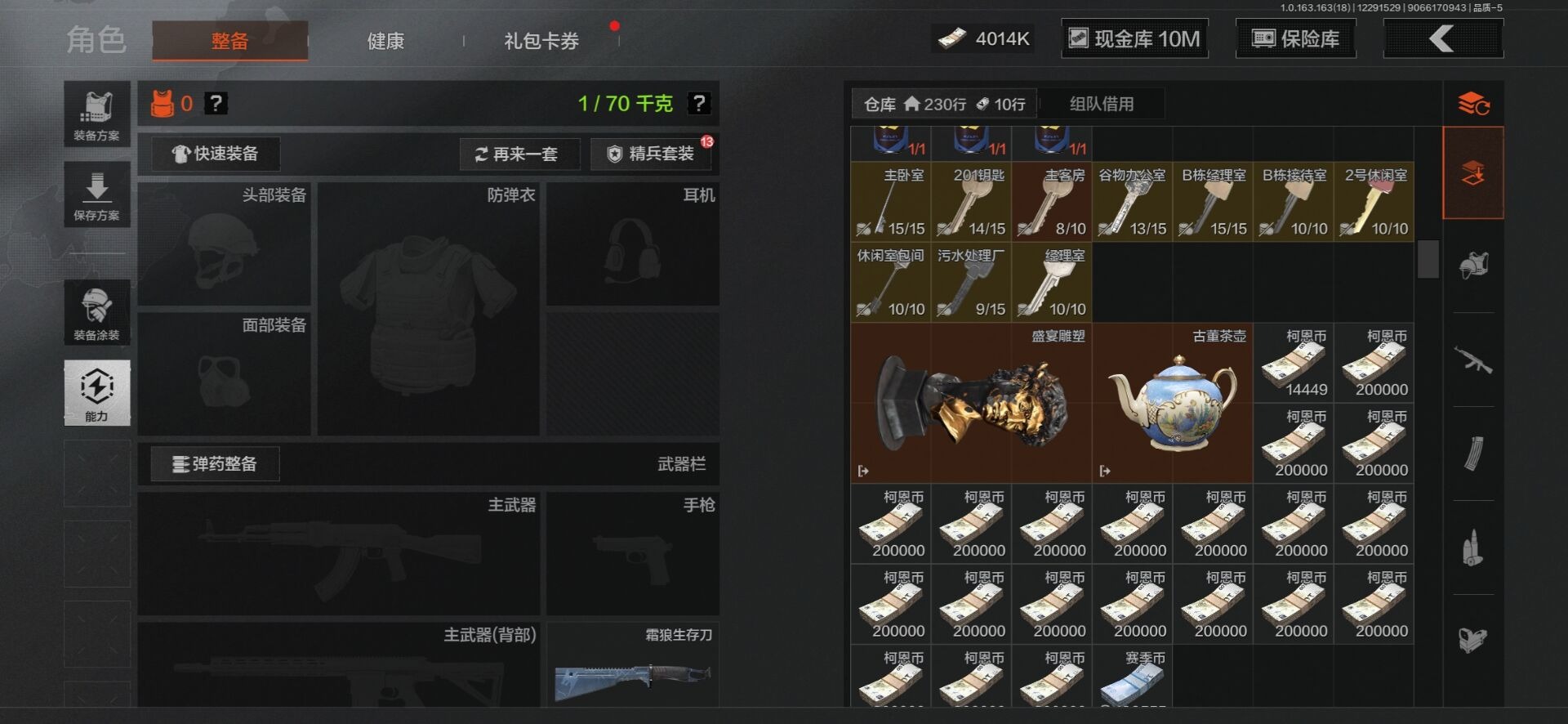 [15402033]库存价值23.3 5近战武器 2金套装 10金枪皮 可修改实名 【柯恩币数量】4014k现金库10m 【角色装扮(金)】使徒·欧瑞恩,机车朋克战衣 【近战武器】空腔战术,收割者,工兵铲,来战·开山刀,霜狼生存刀 【金色枪皮】告丧夜曲·AUG,利齿风暴·MPX,浮鳞影青·QBZ192,旧王圣谕·QBZ191,旧王圣谕·VSS,战术大师·AEK,包络战术·AKM,骑士之剑·AX50,冰河碎影·14,竞技·FAL 【紫色枪皮】利齿风暴·T79,骤羽尖啸·AK12,鱼跃丹青·T85,鱼跃丹青·DT MDR,旗帜·RPK16,棱光裂变·AK102,棱光裂变·ACE31,棱光裂变·莫辛,逆火玄石·P90,典礼武备·GROZA,典礼武备·MCX,粉绒臻选·SKS,战术大师·AK74N,战术大师·SVDS,旗帜脉冲·M110,潜渊蛇鳞·M4A1,无畏·USAS12,骑士之剑·AKS74U,骑士之剑·SJ16,北国内卫·AN94,湖冰倒影·MP5 【角色装扮(紫)】鎏金街头套装,金狮护身·转运套装