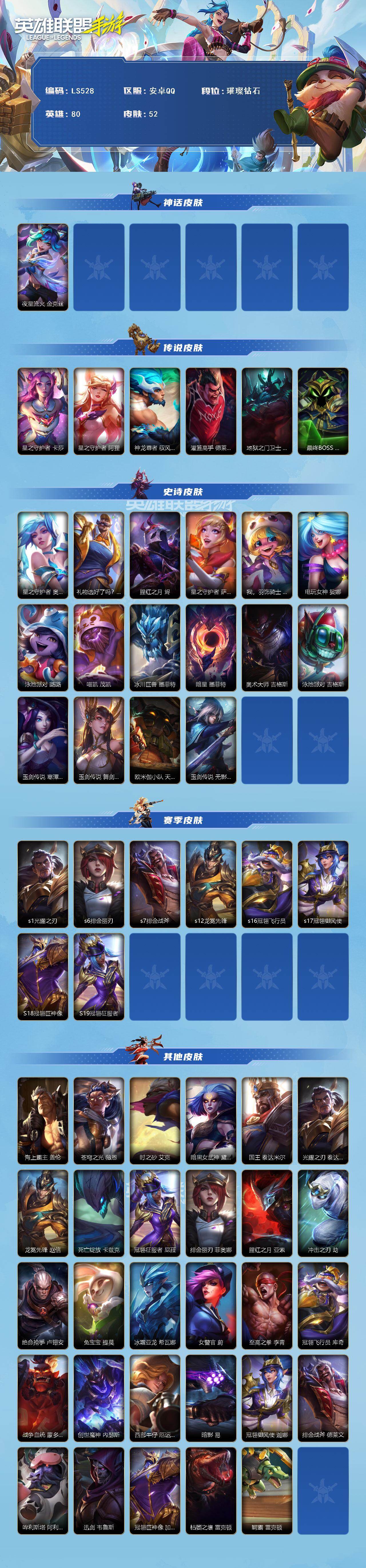 商品描述:【LS528】80英雄/52皮肤/1神话/璀璨钻石/夜星流火 金克丝/星之守护者 卡莎/星之守护者 阿狸/神龙尊者 驭风啸龙 易/灌篮高手 德莱厄斯/地狱之门卫士 加里奥/最终BOSS 维迦/星之守护者 奥莉安娜/礼物选好了吗? 布隆/腥红之月 烬/星之守护者 萨勒芬妮/我,羽饰骑士 崔丝塔娜/电玩女神 娑娜/泳池派对 璐璐/喵凯 茂凯/冰川巨兽 墨菲特/暗星 墨菲特/奥术大师 吉格斯/泳池派对 吉格斯/玉剑传说 寒潭夭夭 娜美/玉剑传说 舞剑仙 艾瑞莉娅/欧米伽小队 天雷爆破手 维迦/玉剑传说 无影 泰隆/s1光耀之刃/s6绯金丽刃/s7绯金战斧/s12龙冕先锋/s16冠翎飞行员/s17冠