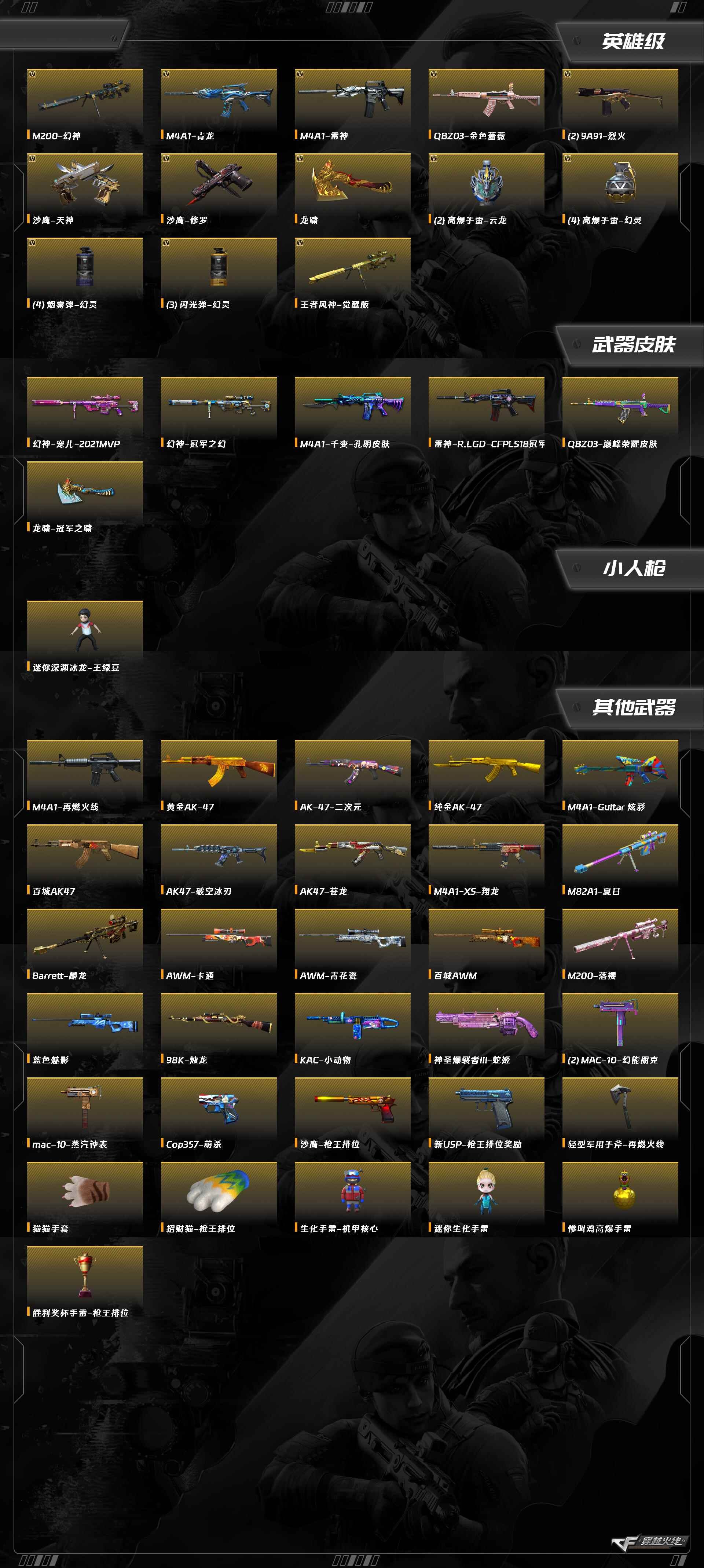 商品描述:XH7875/西部/重庆一区/可排位/【专家2】/Lv.87 少将6/24V/幻神/幻神宠儿/幻神冠军之幻/王者风神/青龙/QBZ金色蔷薇/QBZ巅峰荣耀/雷神/天神/修罗/迷你深渊冰龙王绿豆/龙啸/三套幻灵手雷/【皮肤】/雷神LGD/龙啸冠军之啸/【四防角色】/王者影豹/【其他角色】/战地猎狐/葵阿尔法武装/奇洋探员/乔伊教练/云海玲珑/零水下丽影///各种道具/各种饰品/细节看图/【此账号未被封过十年】