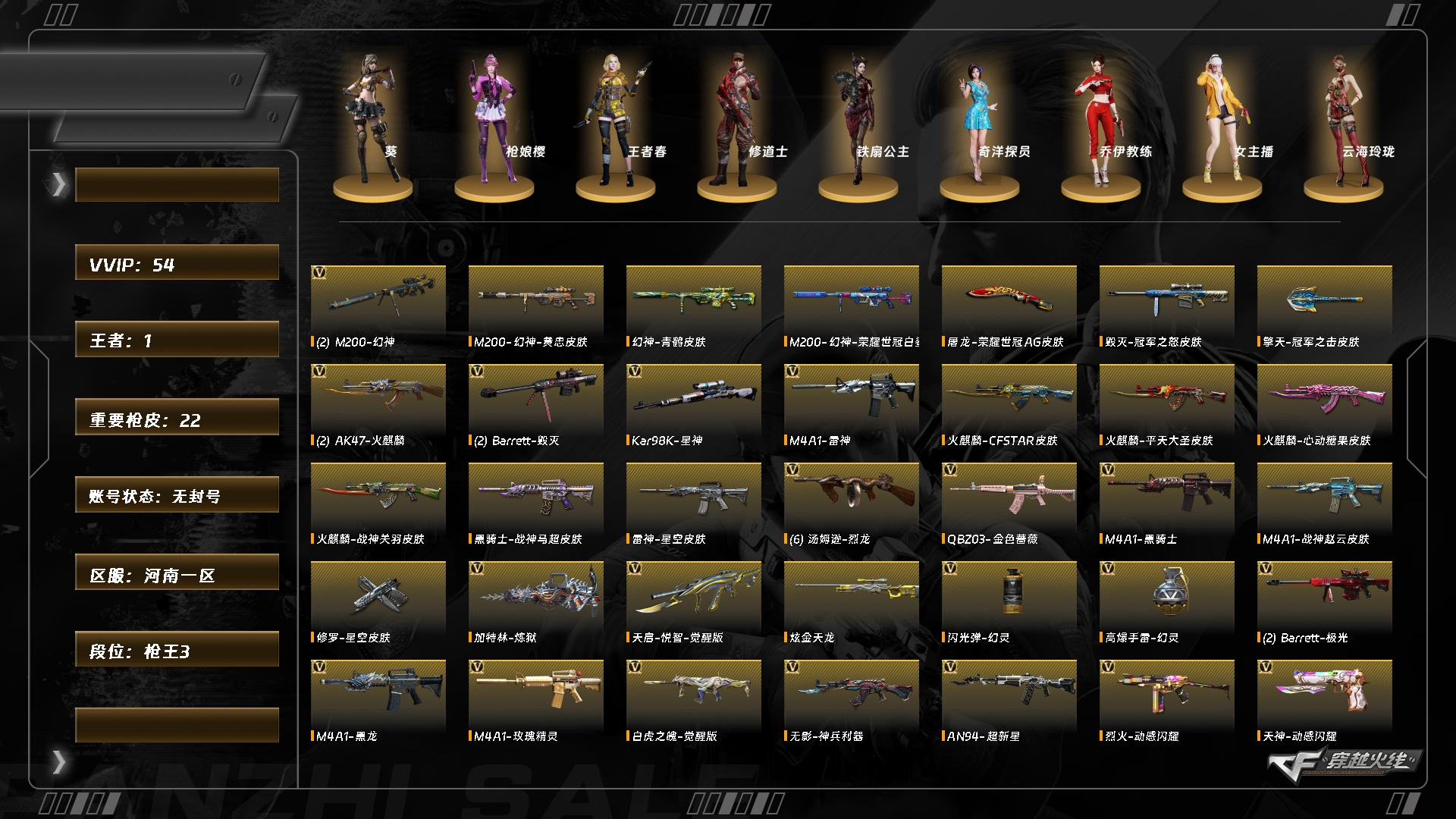 M7705/北部/山东二区/可排位/59v/幻神/幻神纸灯龙/QBZ金色蔷薇/金色蔷薇纸灯龙/柯尔特冠军之特/【四防角色/电竞教官云悠悠】/【角色】/葵/月兔特工/零纪元/葵阿尔法武装/乔伊教练/王者瞳闭月羞花/修道士/【音效卡/碧霄极光音效卡/炼狱百战金芒庆典舞曲音效卡/】/【枪皮】/龙啸纸灯龙/裁决百城联赛天津/火麒麟心动糖果/火麒麟雷神/王者武器/王者玄武/王者之锋/炫金武器/炫金骑士/【小人枪/天龙乔伊教练/】/永久AC/找回包赔