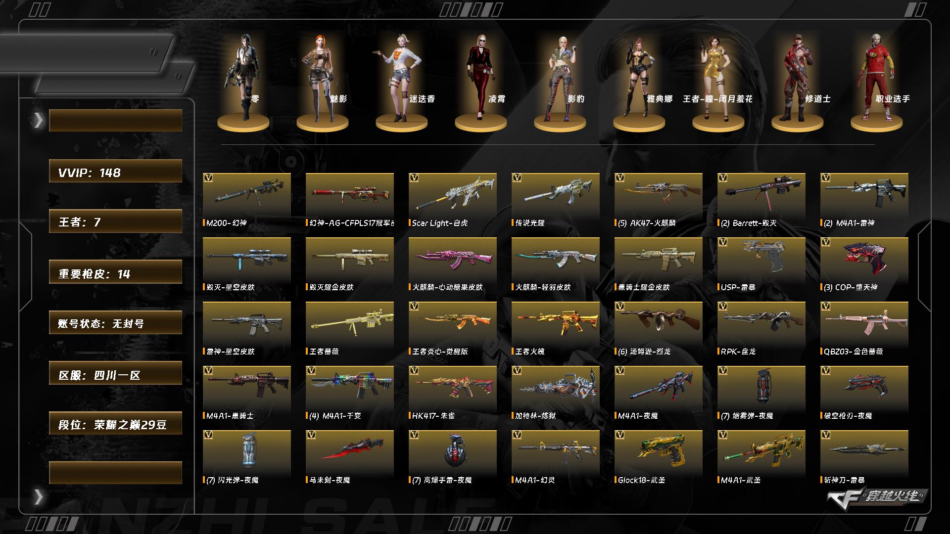 M7705/北部/山东二区/可排位/59v/幻神/幻神纸灯龙/QBZ金色蔷薇/金色蔷薇纸灯龙/柯尔特冠军之特/【四防角色/电竞教官云悠悠】/【角色】/葵/月兔特工/零纪元/葵阿尔法武装/乔伊教练/王者瞳闭月羞花/修道士/【音效卡/碧霄极光音效卡/炼狱百战金芒庆典舞曲音效卡/】/【枪皮】/龙啸纸灯龙/裁决百城联赛天津/火麒麟心动糖果/火麒麟雷神/王者武器/王者玄武/王者之锋/炫金武器/炫金骑士/【小人枪/天龙乔伊教练/】/永久AC/找回包赔