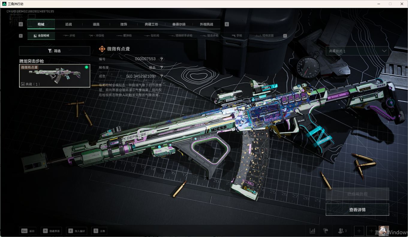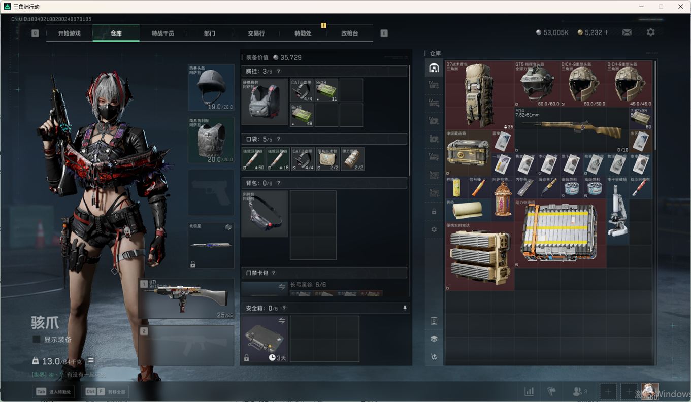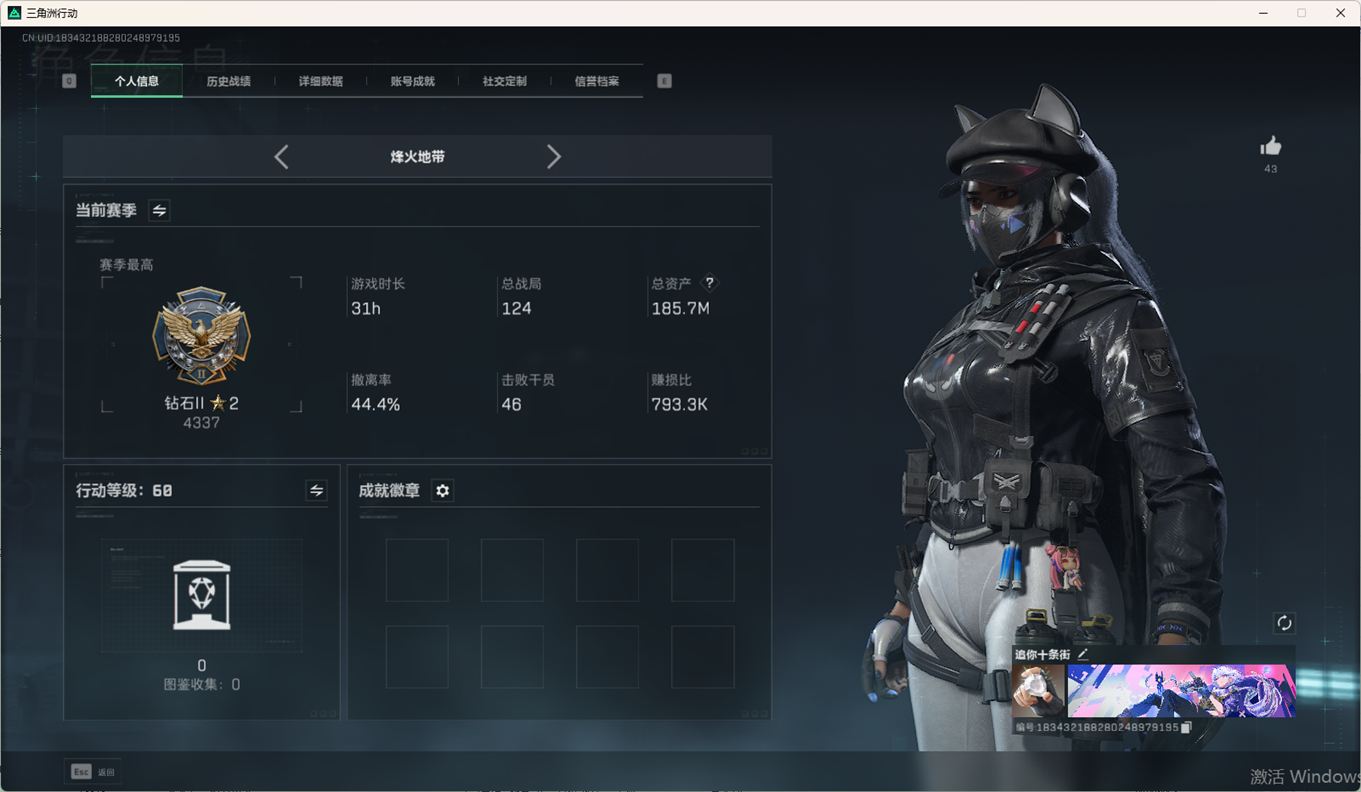 总资产:59.8M,哈夫币:260W,武器皮肤:25,钻石,战场60级:【安全箱】基础安全箱;【特勤处等级】仓库LV.8,靶场LV.7,训练中心LV.7;【干员皮肤】蜂医送葬人无题密令,无名夜鹰,红狼蚀金玫瑰;【近战武器】近战武器-北极星,近战武器-黑鹰;【步枪皮肤】M4A1突击步枪-蚀金玫瑰,M7战斗步枪-神秘艺术,SR-25射手步枪-水墨云图,ASVal突击步枪-蛇年祥瑞,AK-12突击步枪-夜鹰,K437突击步枪-北极星,CAR-15突击步枪-阿米娅,腾龙突击步枪-捞点薯条,AK-12突击步枪-特斯拉线圈,M4A1突击步枪-阿米娅,SCAR-H战斗步枪-启航,KC17突击步枪-电锯惊魂,SG552突击步枪-运动员;【冲锋枪皮肤】P90冲锋枪-神秘艺术,QCQ171冲锋枪-北极星,SMG-45冲锋枪-骑士,UZI冲锋枪-特斯拉线圈,SR-3M紧凑突击步枪-特斯拉线圈,勇士冲锋枪-能天使-午夜邮差;【狙击步枪皮肤】AWM狙击步枪-捞点薯条;【霰弹枪皮肤】725双管霰弹枪-送葬人-无题密令;【轻机枪皮肤】M250通用机枪-骑士之心;【手枪皮肤】93R-捞点薯条;