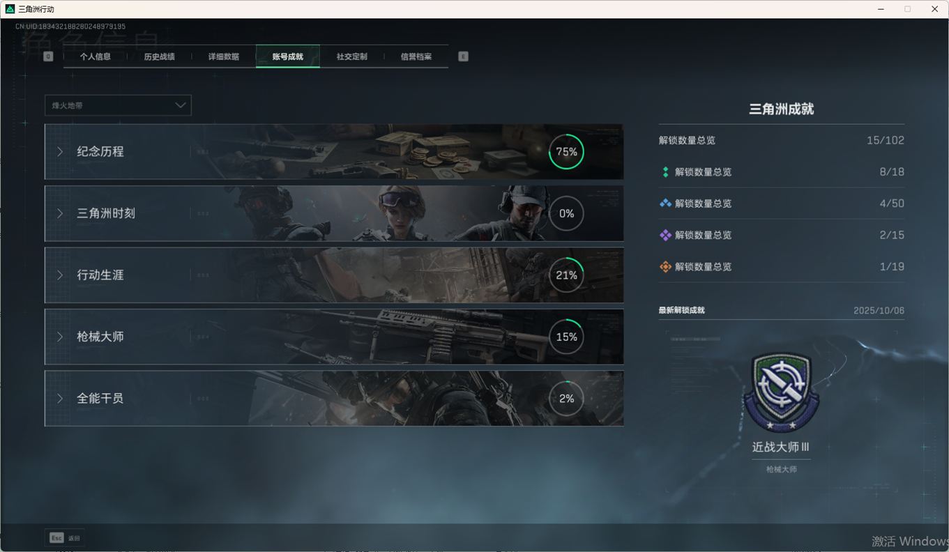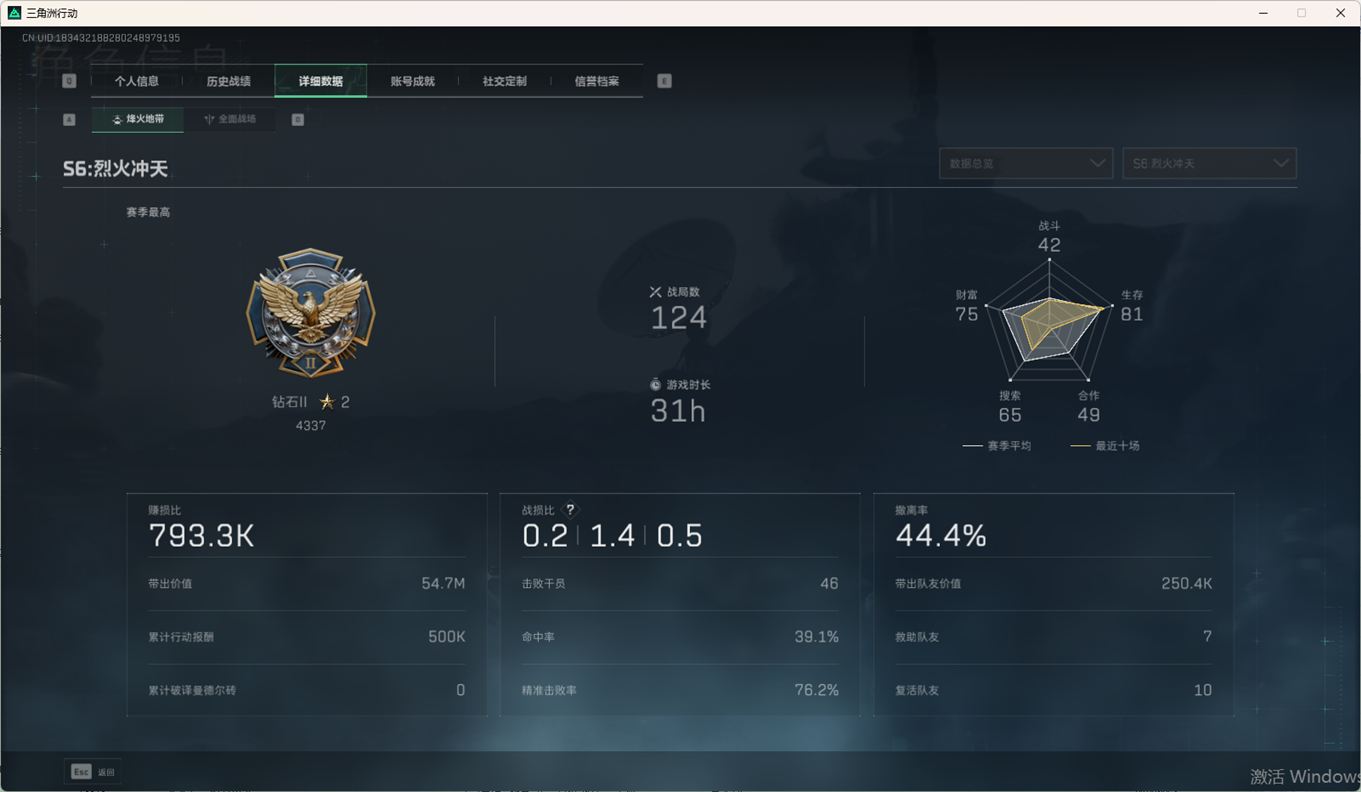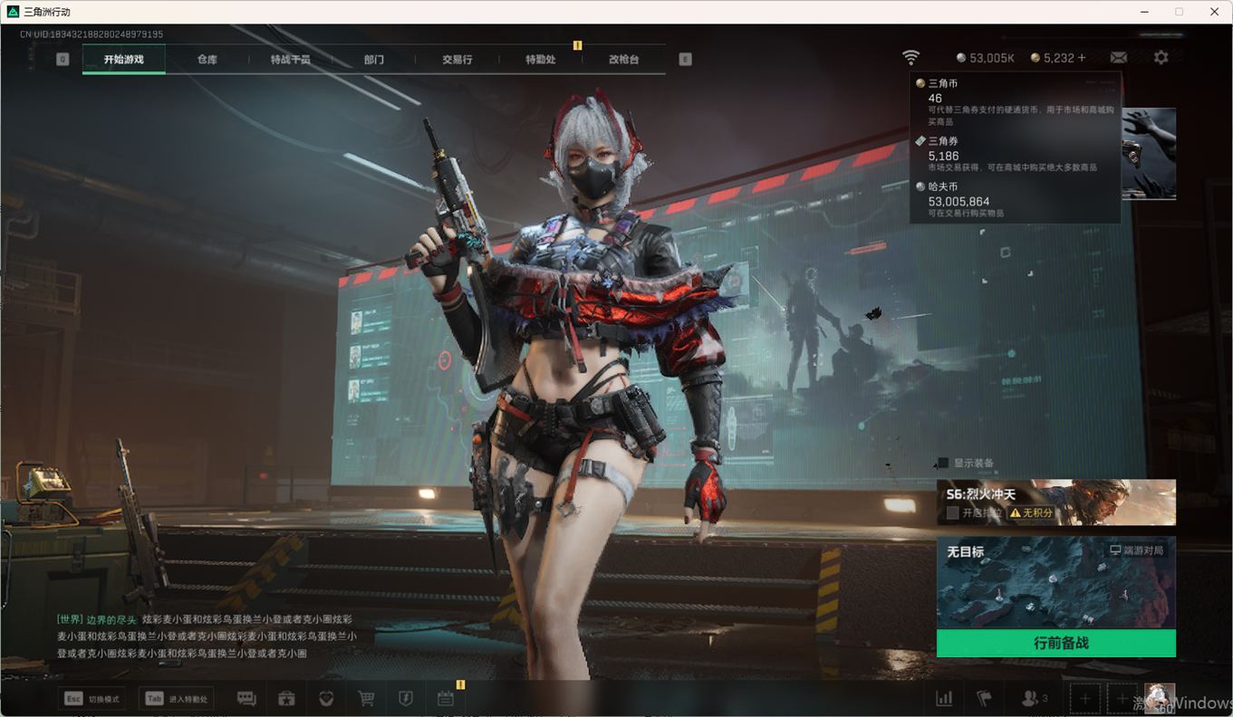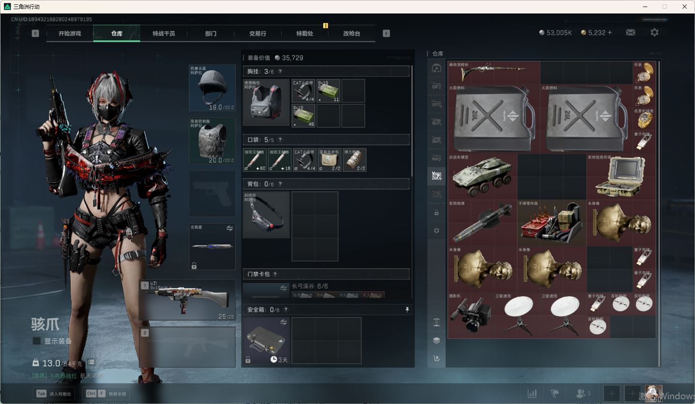 总资产:59.8M,哈夫币:260W,武器皮肤:25,钻石,战场60级:【安全箱】基础安全箱;【特勤处等级】仓库LV.8,靶场LV.7,训练中心LV.7;【干员皮肤】蜂医送葬人无题密令,无名夜鹰,红狼蚀金玫瑰;【近战武器】近战武器-北极星,近战武器-黑鹰;【步枪皮肤】M4A1突击步枪-蚀金玫瑰,M7战斗步枪-神秘艺术,SR-25射手步枪-水墨云图,ASVal突击步枪-蛇年祥瑞,AK-12突击步枪-夜鹰,K437突击步枪-北极星,CAR-15突击步枪-阿米娅,腾龙突击步枪-捞点薯条,AK-12突击步枪-特斯拉线圈,M4A1突击步枪-阿米娅,SCAR-H战斗步枪-启航,KC17突击步枪-电锯惊魂,SG552突击步枪-运动员;【冲锋枪皮肤】P90冲锋枪-神秘艺术,QCQ171冲锋枪-北极星,SMG-45冲锋枪-骑士,UZI冲锋枪-特斯拉线圈,SR-3M紧凑突击步枪-特斯拉线圈,勇士冲锋枪-能天使-午夜邮差;【狙击步枪皮肤】AWM狙击步枪-捞点薯条;【霰弹枪皮肤】725双管霰弹枪-送葬人-无题密令;【轻机枪皮肤】M250通用机枪-骑士之心;【手枪皮肤】93R-捞点薯条;