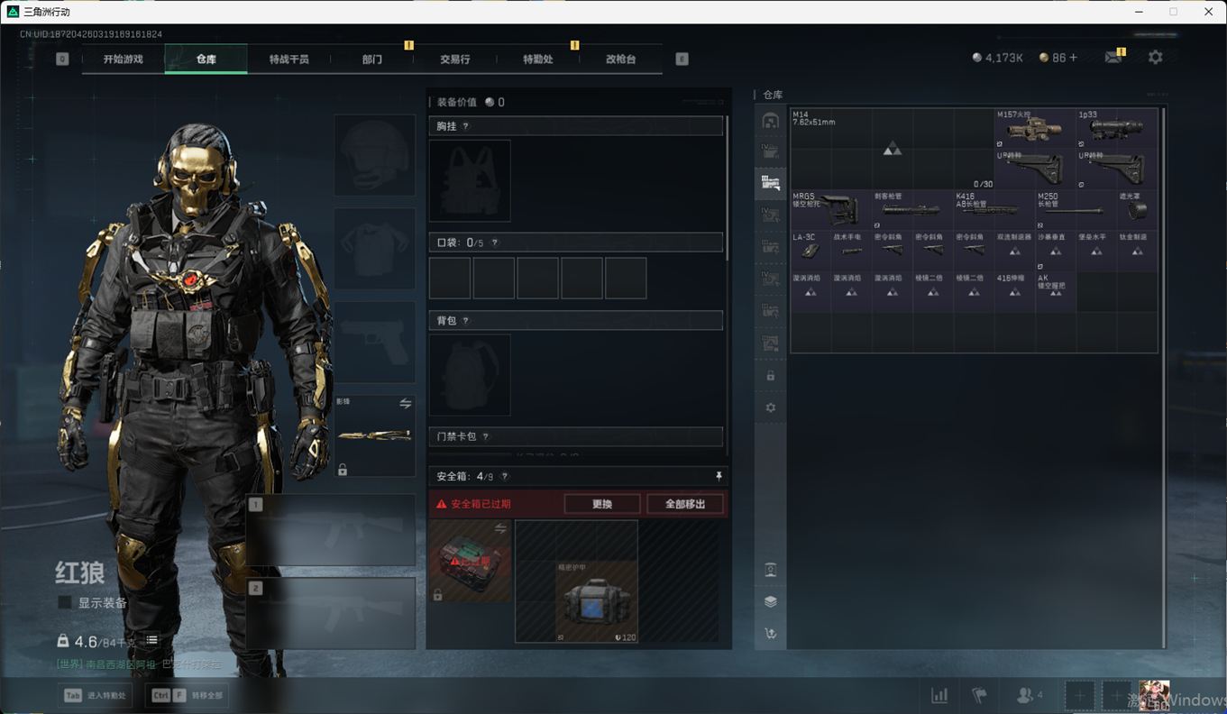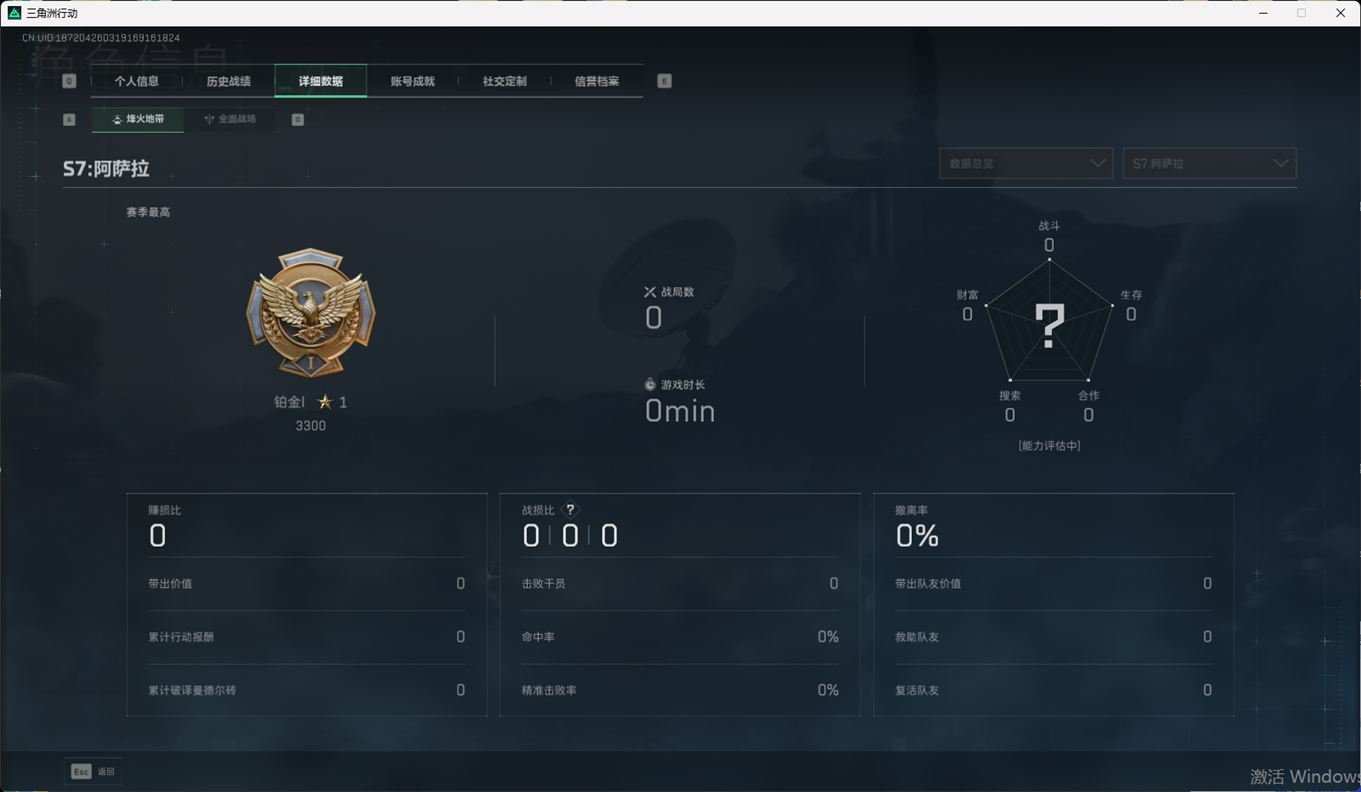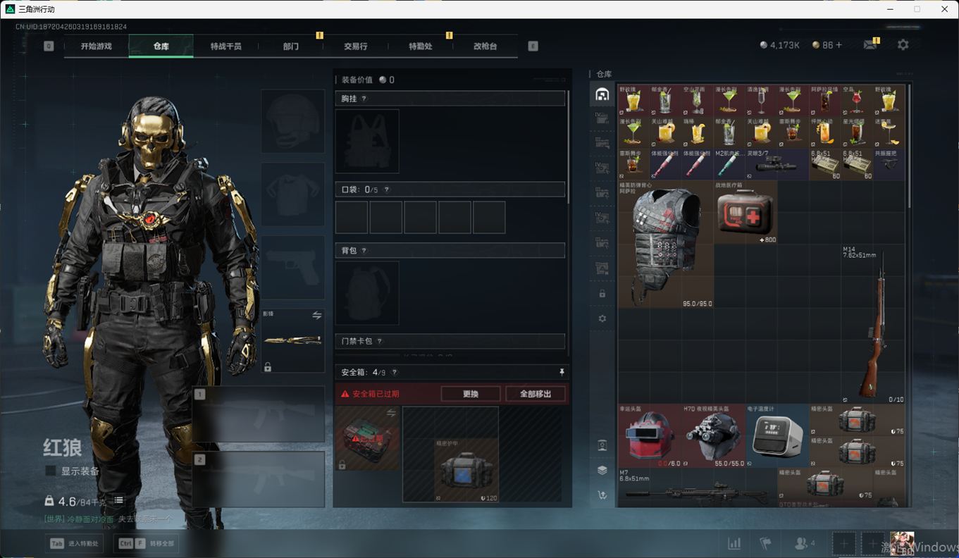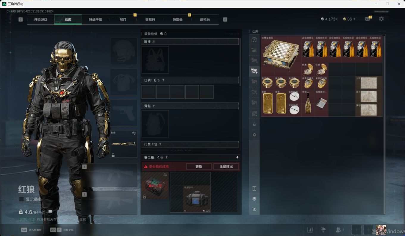 总资产:59.8M,哈夫币:260W,武器皮肤:25,钻石,战场60级:【安全箱】基础安全箱;【特勤处等级】仓库LV.8,靶场LV.7,训练中心LV.7;【干员皮肤】蜂医送葬人无题密令,无名夜鹰,红狼蚀金玫瑰;【近战武器】近战武器-北极星,近战武器-黑鹰;【步枪皮肤】M4A1突击步枪-蚀金玫瑰,M7战斗步枪-神秘艺术,SR-25射手步枪-水墨云图,ASVal突击步枪-蛇年祥瑞,AK-12突击步枪-夜鹰,K437突击步枪-北极星,CAR-15突击步枪-阿米娅,腾龙突击步枪-捞点薯条,AK-12突击步枪-特斯拉线圈,M4A1突击步枪-阿米娅,SCAR-H战斗步枪-启航,KC17突击步枪-电锯惊魂,SG552突击步枪-运动员;【冲锋枪皮肤】P90冲锋枪-神秘艺术,QCQ171冲锋枪-北极星,SMG-45冲锋枪-骑士,UZI冲锋枪-特斯拉线圈,SR-3M紧凑突击步枪-特斯拉线圈,勇士冲锋枪-能天使-午夜邮差;【狙击步枪皮肤】AWM狙击步枪-捞点薯条;【霰弹枪皮肤】725双管霰弹枪-送葬人-无题密令;【轻机枪皮肤】M250通用机枪-骑士之心;【手枪皮肤】93R-捞点薯条;