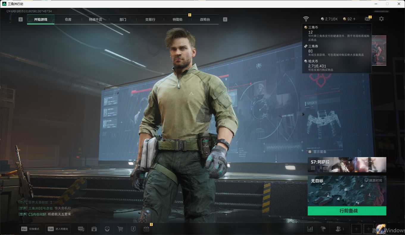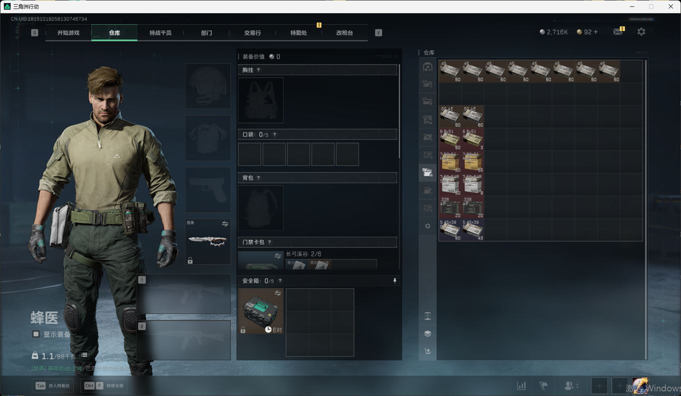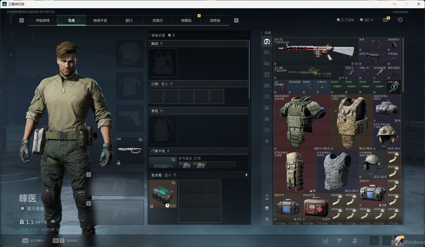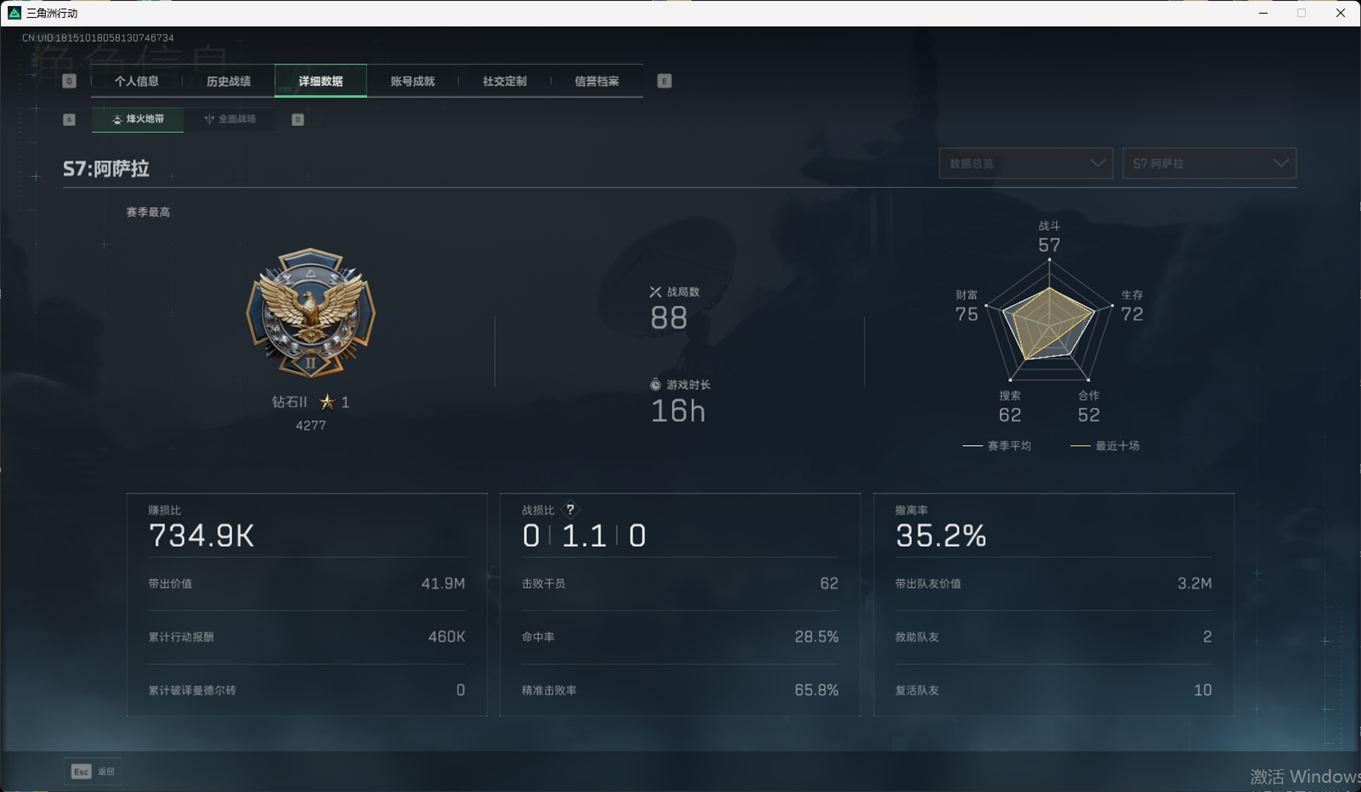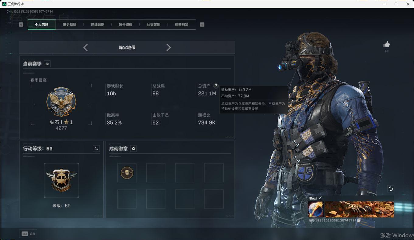 总资产:59.8M,哈夫币:260W,武器皮肤:25,钻石,战场60级:【安全箱】基础安全箱;【特勤处等级】仓库LV.8,靶场LV.7,训练中心LV.7;【干员皮肤】蜂医送葬人无题密令,无名夜鹰,红狼蚀金玫瑰;【近战武器】近战武器-北极星,近战武器-黑鹰;【步枪皮肤】M4A1突击步枪-蚀金玫瑰,M7战斗步枪-神秘艺术,SR-25射手步枪-水墨云图,ASVal突击步枪-蛇年祥瑞,AK-12突击步枪-夜鹰,K437突击步枪-北极星,CAR-15突击步枪-阿米娅,腾龙突击步枪-捞点薯条,AK-12突击步枪-特斯拉线圈,M4A1突击步枪-阿米娅,SCAR-H战斗步枪-启航,KC17突击步枪-电锯惊魂,SG552突击步枪-运动员;【冲锋枪皮肤】P90冲锋枪-神秘艺术,QCQ171冲锋枪-北极星,SMG-45冲锋枪-骑士,UZI冲锋枪-特斯拉线圈,SR-3M紧凑突击步枪-特斯拉线圈,勇士冲锋枪-能天使-午夜邮差;【狙击步枪皮肤】AWM狙击步枪-捞点薯条;【霰弹枪皮肤】725双管霰弹枪-送葬人-无题密令;【轻机枪皮肤】M250通用机枪-骑士之心;【手枪皮肤】93R-捞点薯条;