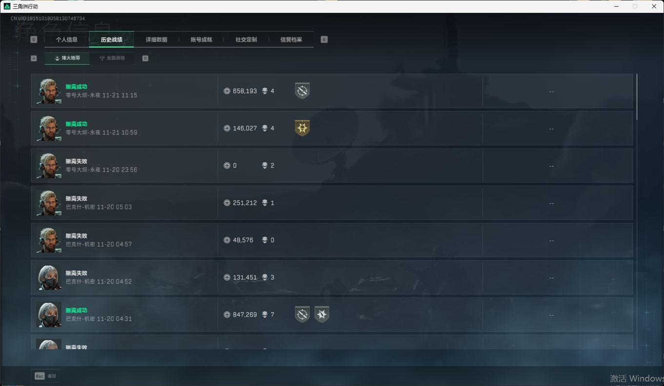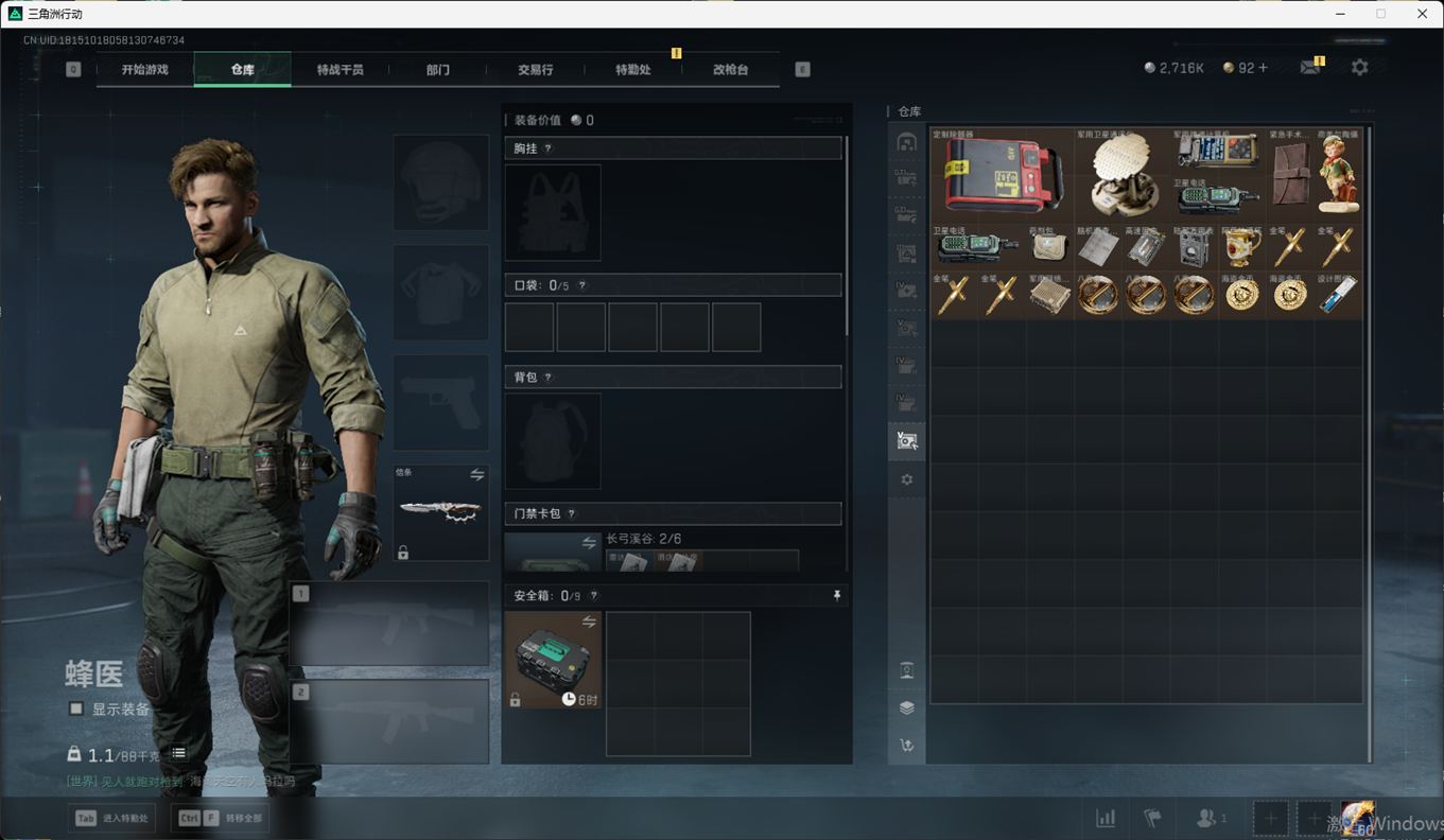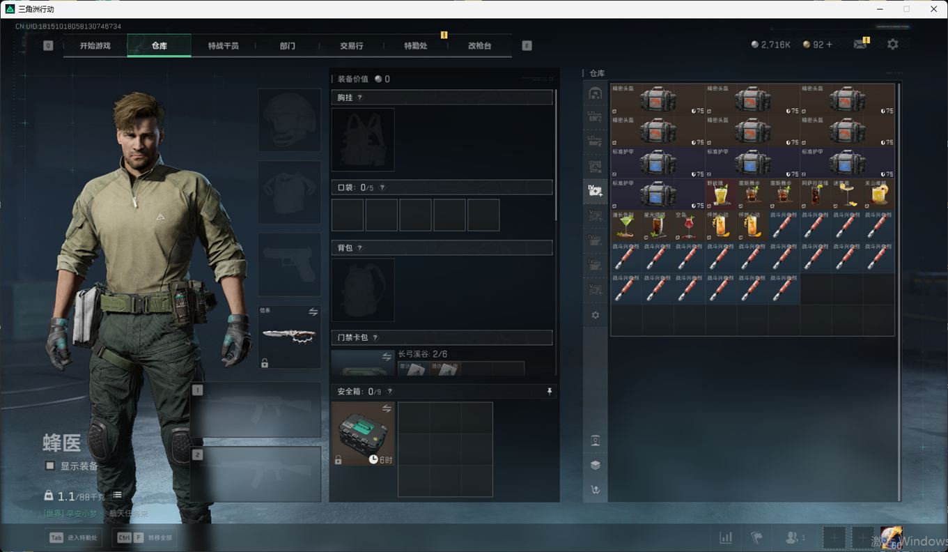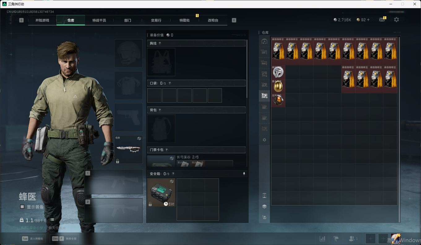 总资产:59.8M,哈夫币:260W,武器皮肤:25,钻石,战场60级:【安全箱】基础安全箱;【特勤处等级】仓库LV.8,靶场LV.7,训练中心LV.7;【干员皮肤】蜂医送葬人无题密令,无名夜鹰,红狼蚀金玫瑰;【近战武器】近战武器-北极星,近战武器-黑鹰;【步枪皮肤】M4A1突击步枪-蚀金玫瑰,M7战斗步枪-神秘艺术,SR-25射手步枪-水墨云图,ASVal突击步枪-蛇年祥瑞,AK-12突击步枪-夜鹰,K437突击步枪-北极星,CAR-15突击步枪-阿米娅,腾龙突击步枪-捞点薯条,AK-12突击步枪-特斯拉线圈,M4A1突击步枪-阿米娅,SCAR-H战斗步枪-启航,KC17突击步枪-电锯惊魂,SG552突击步枪-运动员;【冲锋枪皮肤】P90冲锋枪-神秘艺术,QCQ171冲锋枪-北极星,SMG-45冲锋枪-骑士,UZI冲锋枪-特斯拉线圈,SR-3M紧凑突击步枪-特斯拉线圈,勇士冲锋枪-能天使-午夜邮差;【狙击步枪皮肤】AWM狙击步枪-捞点薯条;【霰弹枪皮肤】725双管霰弹枪-送葬人-无题密令;【轻机枪皮肤】M250通用机枪-骑士之心;【手枪皮肤】93R-捞点薯条;
