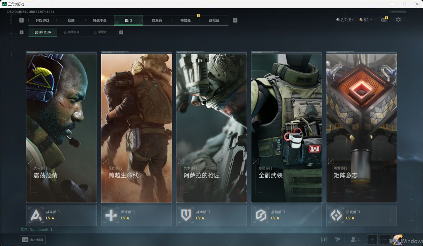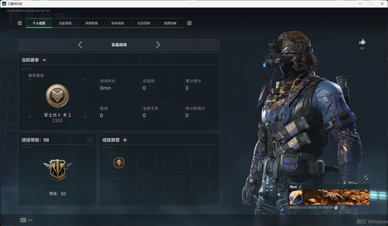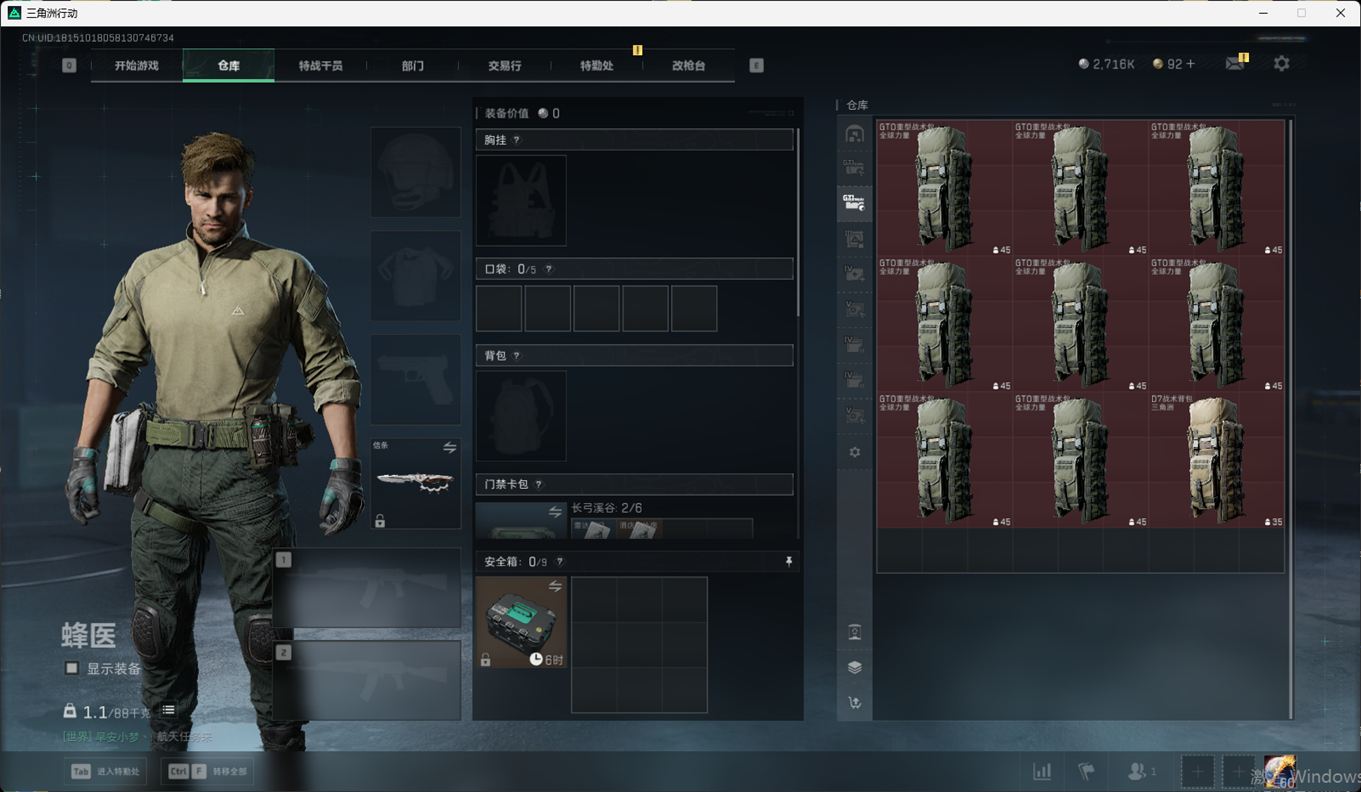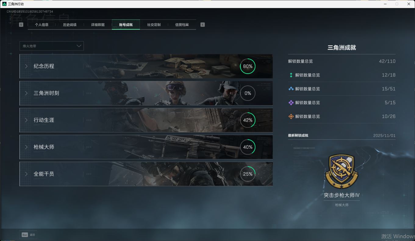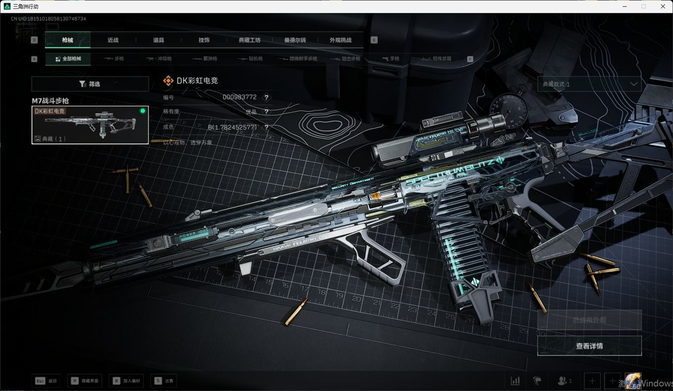 总资产:59.8M,哈夫币:260W,武器皮肤:25,钻石,战场60级:【安全箱】基础安全箱;【特勤处等级】仓库LV.8,靶场LV.7,训练中心LV.7;【干员皮肤】蜂医送葬人无题密令,无名夜鹰,红狼蚀金玫瑰;【近战武器】近战武器-北极星,近战武器-黑鹰;【步枪皮肤】M4A1突击步枪-蚀金玫瑰,M7战斗步枪-神秘艺术,SR-25射手步枪-水墨云图,ASVal突击步枪-蛇年祥瑞,AK-12突击步枪-夜鹰,K437突击步枪-北极星,CAR-15突击步枪-阿米娅,腾龙突击步枪-捞点薯条,AK-12突击步枪-特斯拉线圈,M4A1突击步枪-阿米娅,SCAR-H战斗步枪-启航,KC17突击步枪-电锯惊魂,SG552突击步枪-运动员;【冲锋枪皮肤】P90冲锋枪-神秘艺术,QCQ171冲锋枪-北极星,SMG-45冲锋枪-骑士,UZI冲锋枪-特斯拉线圈,SR-3M紧凑突击步枪-特斯拉线圈,勇士冲锋枪-能天使-午夜邮差;【狙击步枪皮肤】AWM狙击步枪-捞点薯条;【霰弹枪皮肤】725双管霰弹枪-送葬人-无题密令;【轻机枪皮肤】M250通用机枪-骑士之心;【手枪皮肤】93R-捞点薯条;