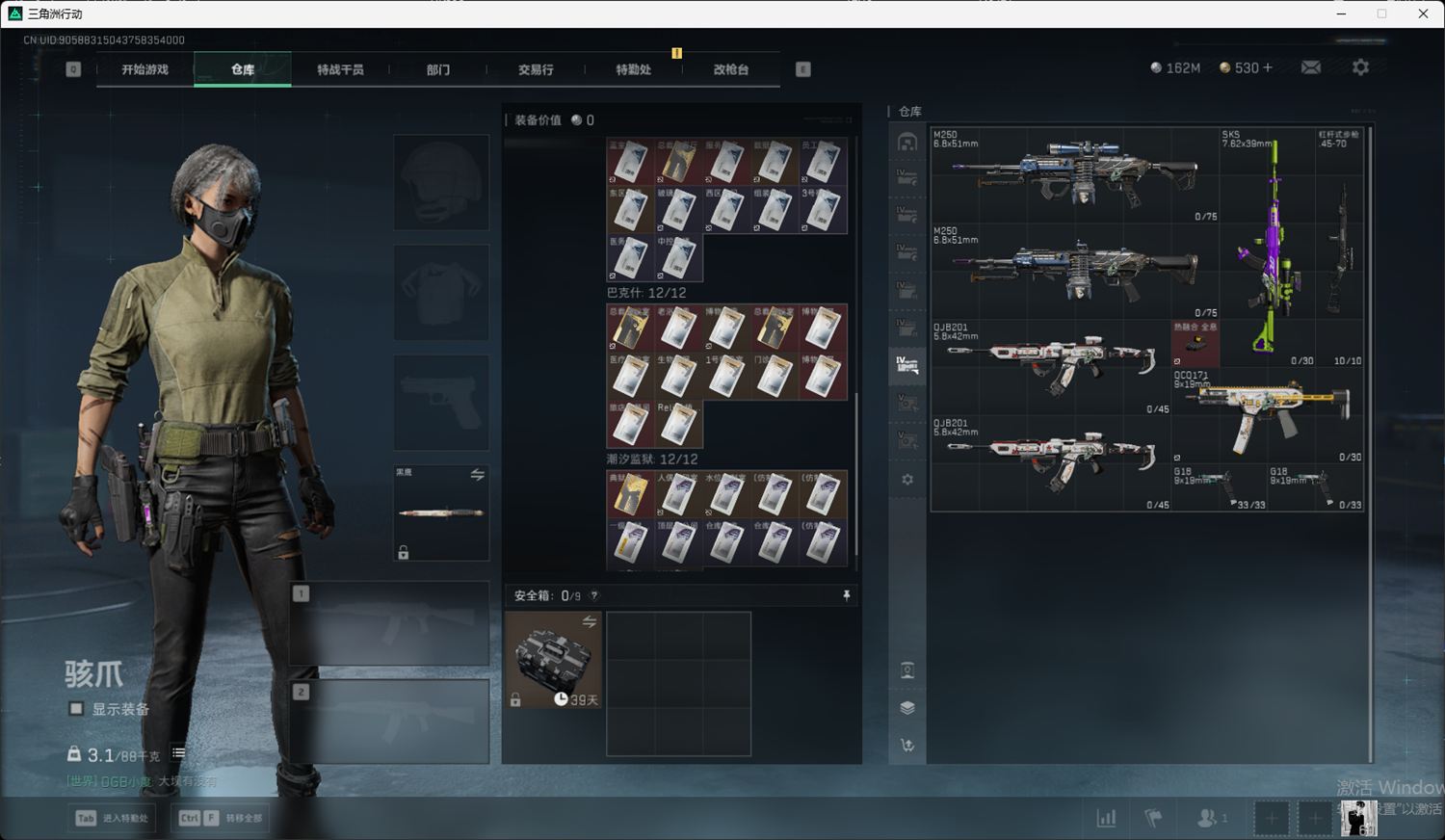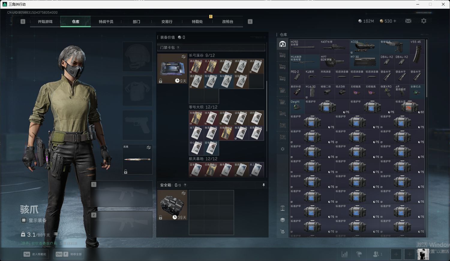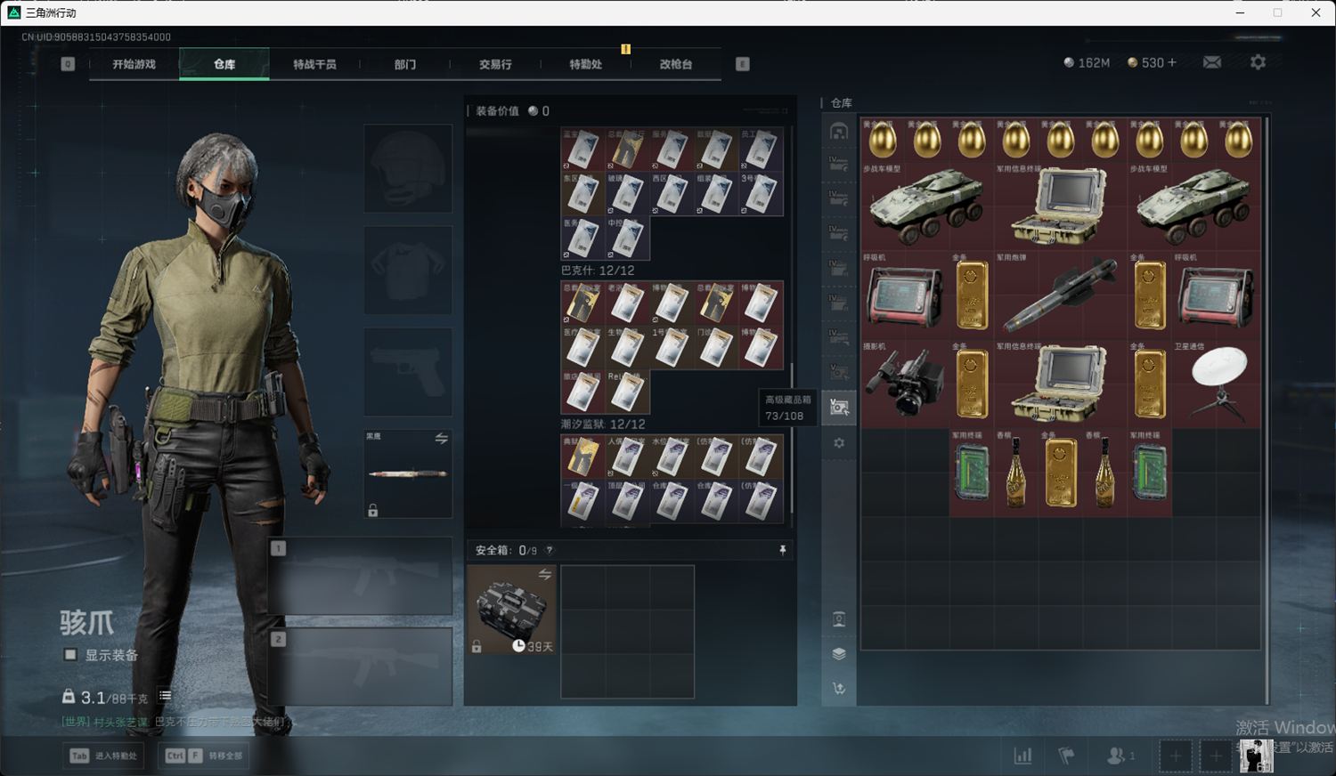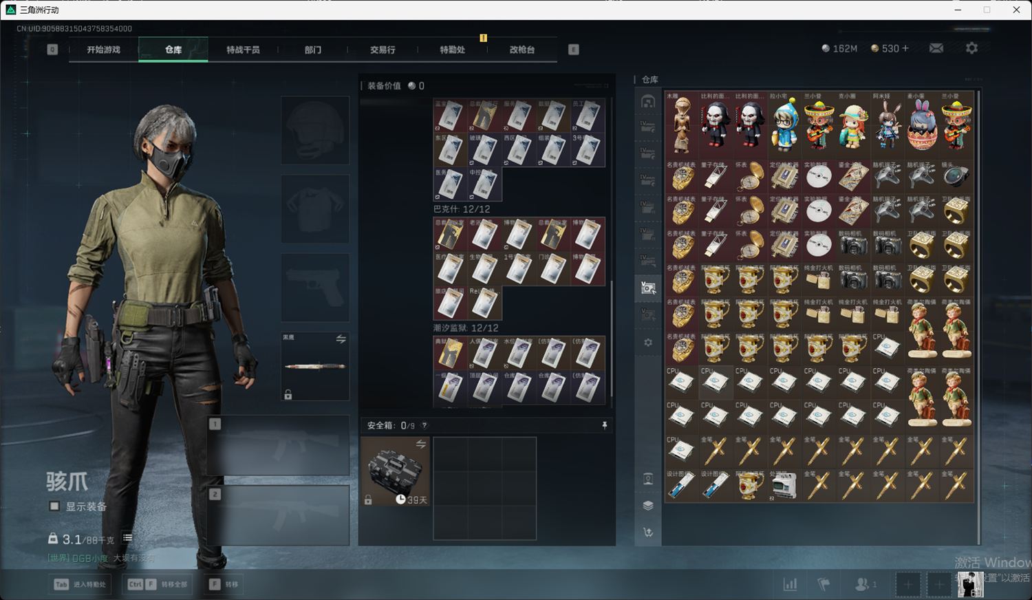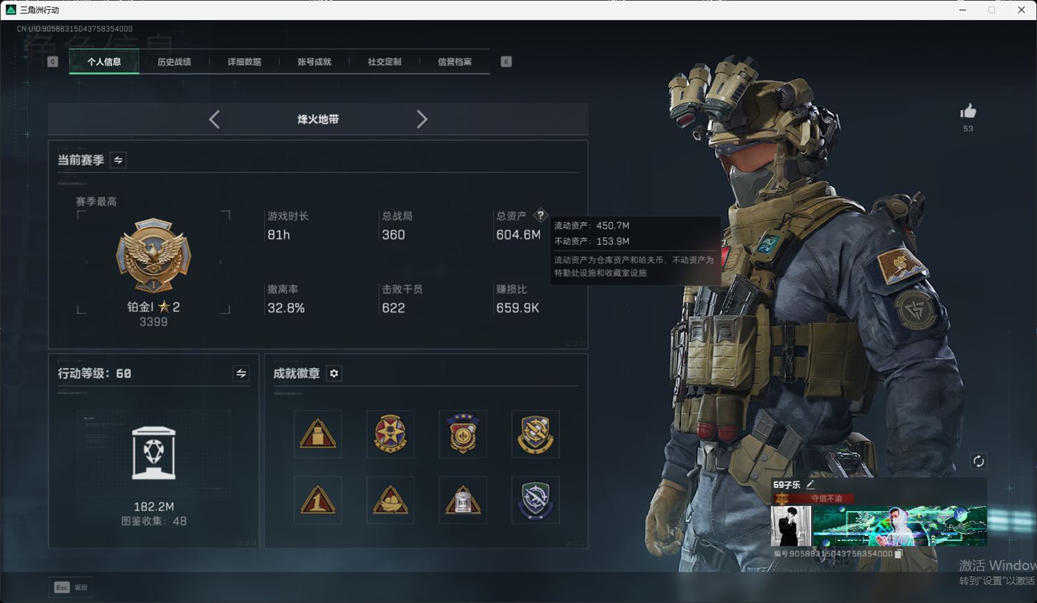 总资产:59.8M,哈夫币:260W,武器皮肤:25,钻石,战场60级:【安全箱】基础安全箱;【特勤处等级】仓库LV.8,靶场LV.7,训练中心LV.7;【干员皮肤】蜂医送葬人无题密令,无名夜鹰,红狼蚀金玫瑰;【近战武器】近战武器-北极星,近战武器-黑鹰;【步枪皮肤】M4A1突击步枪-蚀金玫瑰,M7战斗步枪-神秘艺术,SR-25射手步枪-水墨云图,ASVal突击步枪-蛇年祥瑞,AK-12突击步枪-夜鹰,K437突击步枪-北极星,CAR-15突击步枪-阿米娅,腾龙突击步枪-捞点薯条,AK-12突击步枪-特斯拉线圈,M4A1突击步枪-阿米娅,SCAR-H战斗步枪-启航,KC17突击步枪-电锯惊魂,SG552突击步枪-运动员;【冲锋枪皮肤】P90冲锋枪-神秘艺术,QCQ171冲锋枪-北极星,SMG-45冲锋枪-骑士,UZI冲锋枪-特斯拉线圈,SR-3M紧凑突击步枪-特斯拉线圈,勇士冲锋枪-能天使-午夜邮差;【狙击步枪皮肤】AWM狙击步枪-捞点薯条;【霰弹枪皮肤】725双管霰弹枪-送葬人-无题密令;【轻机枪皮肤】M250通用机枪-骑士之心;【手枪皮肤】93R-捞点薯条;
