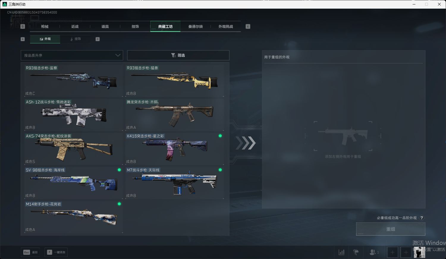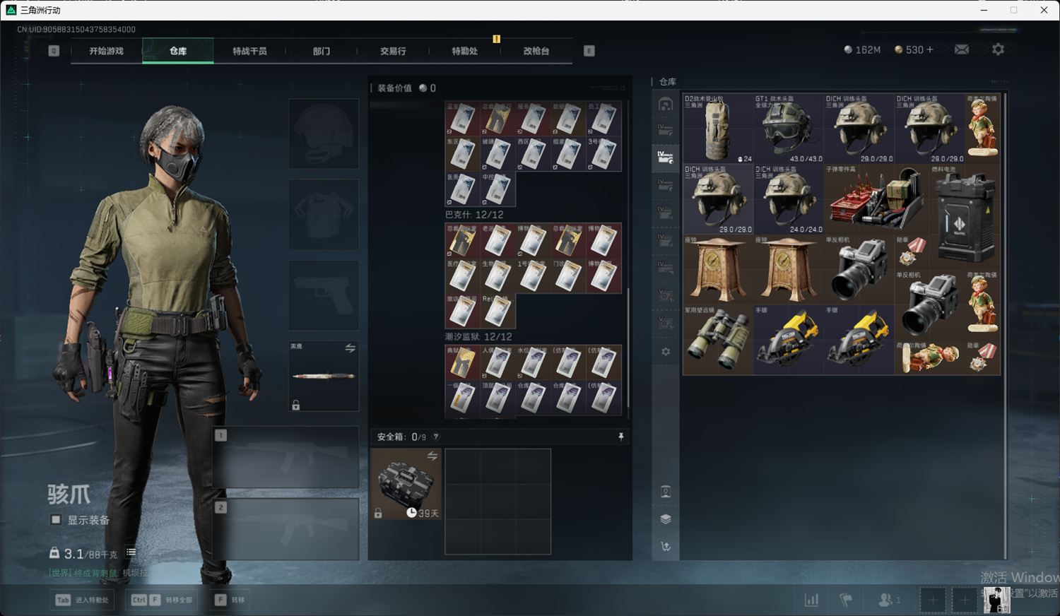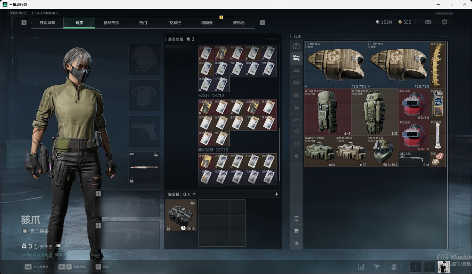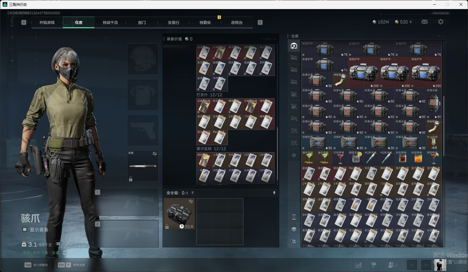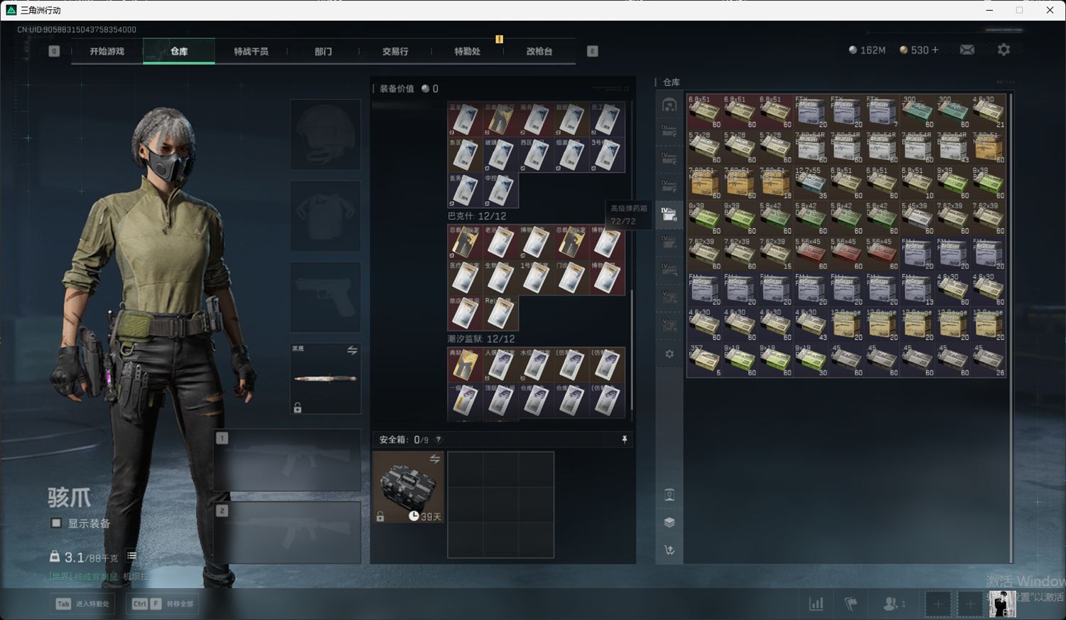 总资产:59.8M,哈夫币:260W,武器皮肤:25,钻石,战场60级:【安全箱】基础安全箱;【特勤处等级】仓库LV.8,靶场LV.7,训练中心LV.7;【干员皮肤】蜂医送葬人无题密令,无名夜鹰,红狼蚀金玫瑰;【近战武器】近战武器-北极星,近战武器-黑鹰;【步枪皮肤】M4A1突击步枪-蚀金玫瑰,M7战斗步枪-神秘艺术,SR-25射手步枪-水墨云图,ASVal突击步枪-蛇年祥瑞,AK-12突击步枪-夜鹰,K437突击步枪-北极星,CAR-15突击步枪-阿米娅,腾龙突击步枪-捞点薯条,AK-12突击步枪-特斯拉线圈,M4A1突击步枪-阿米娅,SCAR-H战斗步枪-启航,KC17突击步枪-电锯惊魂,SG552突击步枪-运动员;【冲锋枪皮肤】P90冲锋枪-神秘艺术,QCQ171冲锋枪-北极星,SMG-45冲锋枪-骑士,UZI冲锋枪-特斯拉线圈,SR-3M紧凑突击步枪-特斯拉线圈,勇士冲锋枪-能天使-午夜邮差;【狙击步枪皮肤】AWM狙击步枪-捞点薯条;【霰弹枪皮肤】725双管霰弹枪-送葬人-无题密令;【轻机枪皮肤】M250通用机枪-骑士之心;【手枪皮肤】93R-捞点薯条;