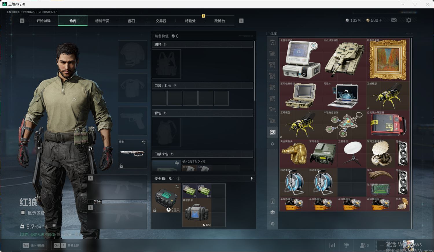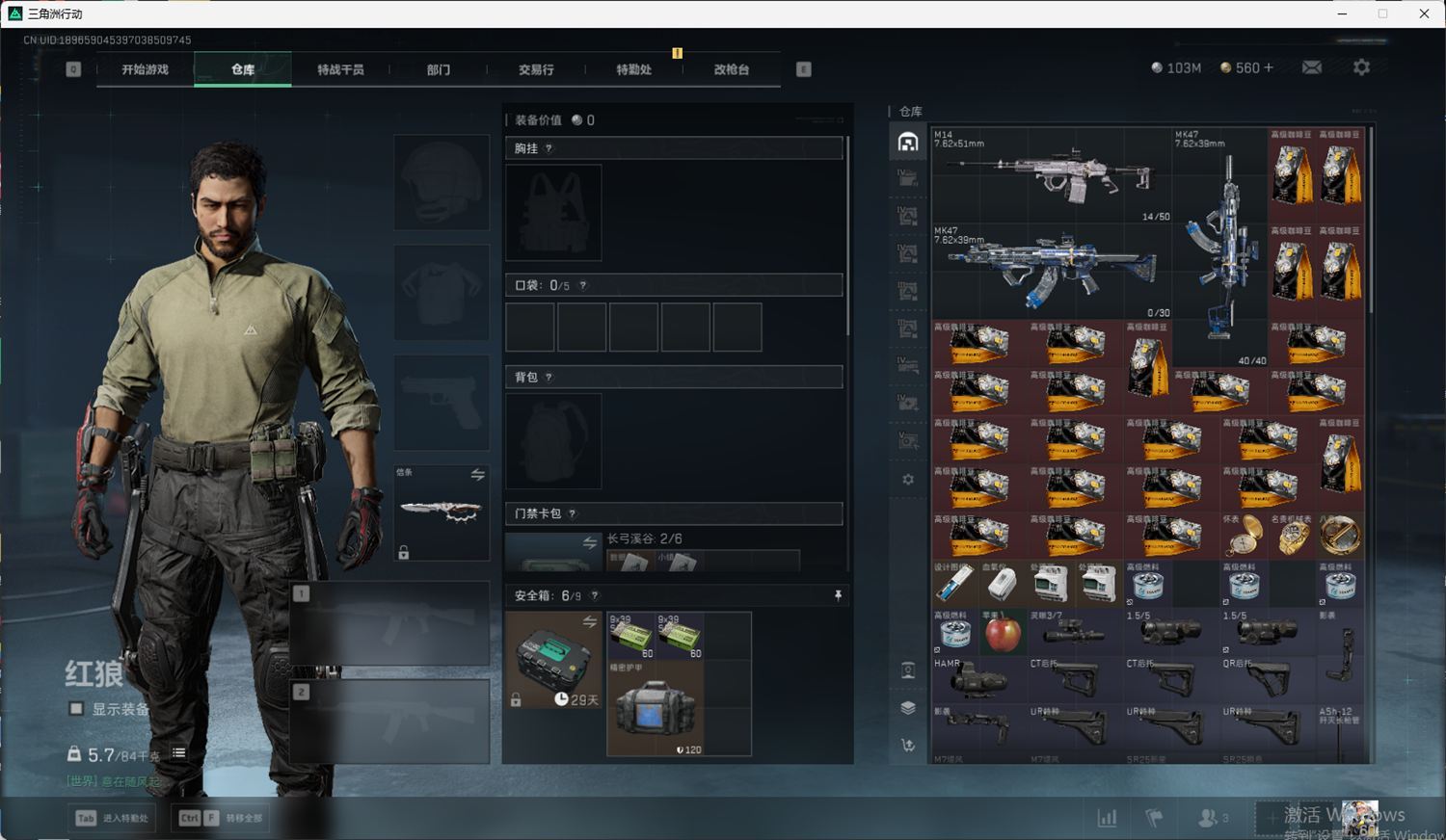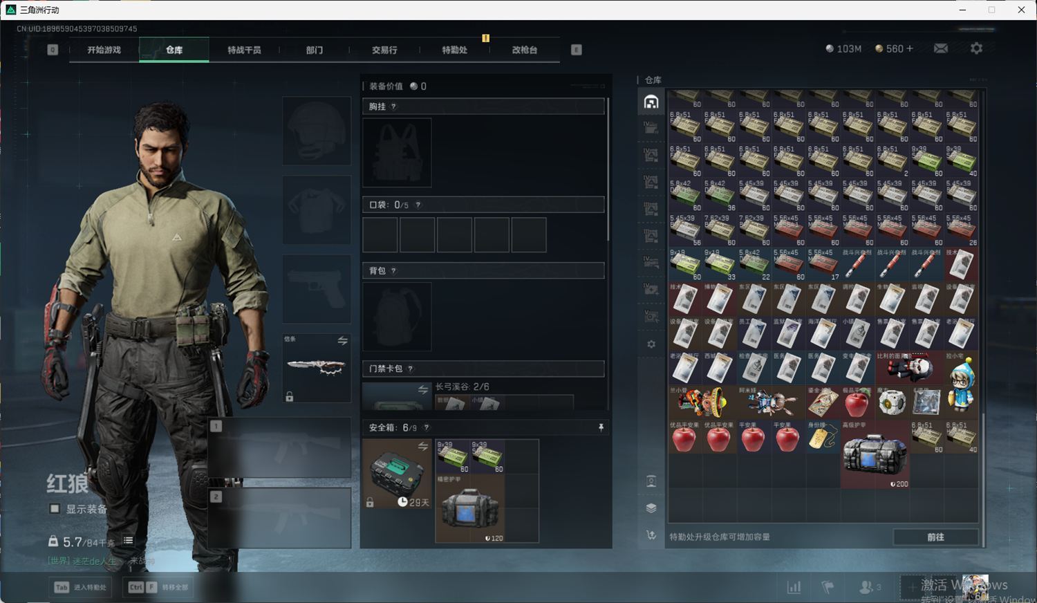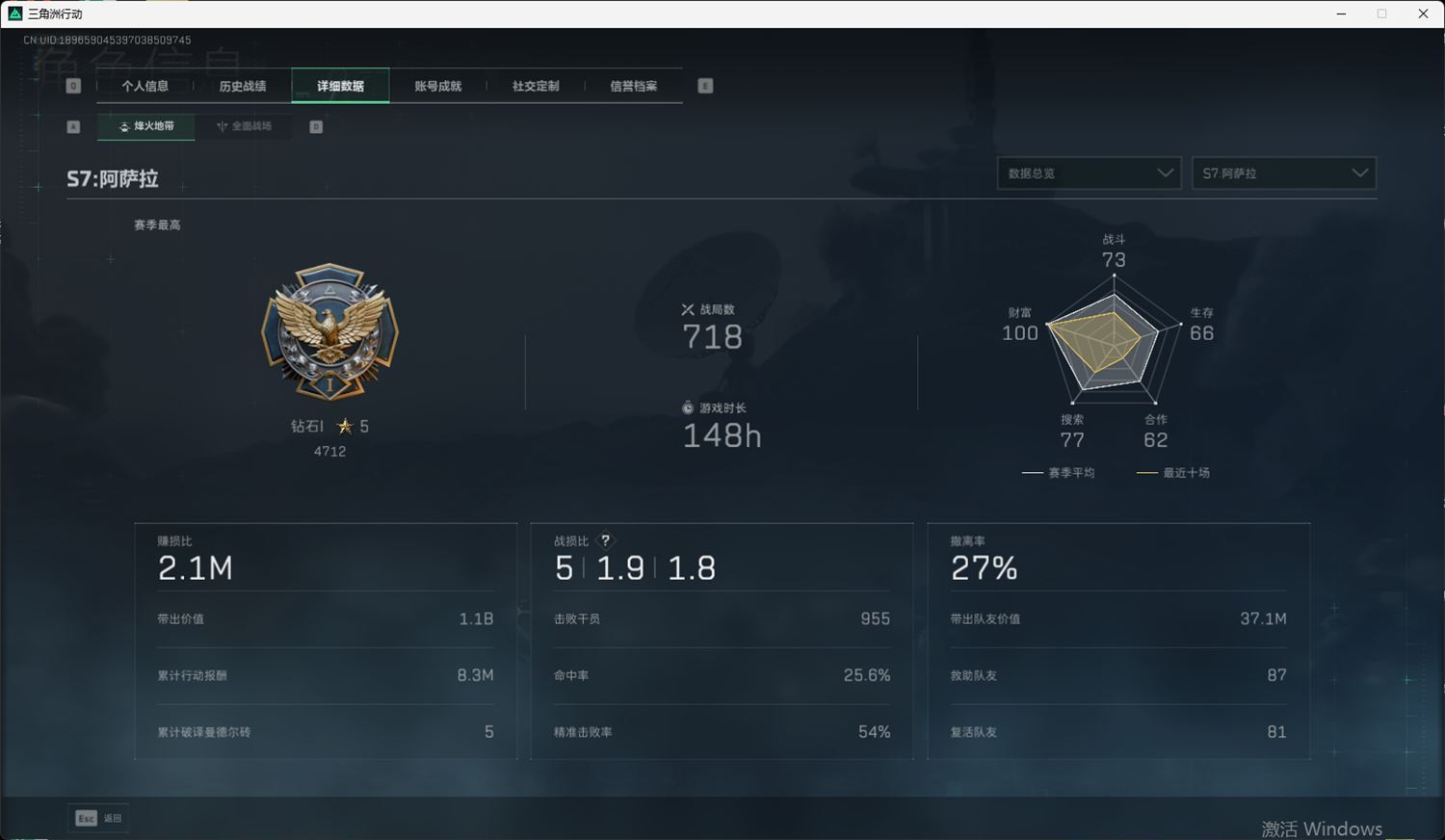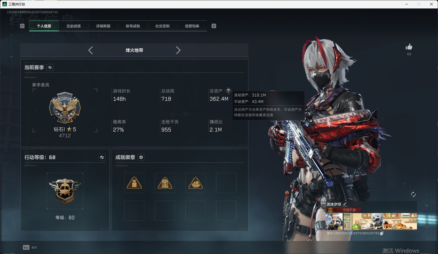总资产:59.8M,哈夫币:260W,武器皮肤:25,钻石,战场60级:【安全箱】基础安全箱;【特勤处等级】仓库LV.8,靶场LV.7,训练中心LV.7;【干员皮肤】蜂医送葬人无题密令,无名夜鹰,红狼蚀金玫瑰;【近战武器】近战武器-北极星,近战武器-黑鹰;【步枪皮肤】M4A1突击步枪-蚀金玫瑰,M7战斗步枪-神秘艺术,SR-25射手步枪-水墨云图,ASVal突击步枪-蛇年祥瑞,AK-12突击步枪-夜鹰,K437突击步枪-北极星,CAR-15突击步枪-阿米娅,腾龙突击步枪-捞点薯条,AK-12突击步枪-特斯拉线圈,M4A1突击步枪-阿米娅,SCAR-H战斗步枪-启航,KC17突击步枪-电锯惊魂,SG552突击步枪-运动员;【冲锋枪皮肤】P90冲锋枪-神秘艺术,QCQ171冲锋枪-北极星,SMG-45冲锋枪-骑士,UZI冲锋枪-特斯拉线圈,SR-3M紧凑突击步枪-特斯拉线圈,勇士冲锋枪-能天使-午夜邮差;【狙击步枪皮肤】AWM狙击步枪-捞点薯条;【霰弹枪皮肤】725双管霰弹枪-送葬人-无题密令;【轻机枪皮肤】M250通用机枪-骑士之心;【手枪皮肤】93R-捞点薯条;