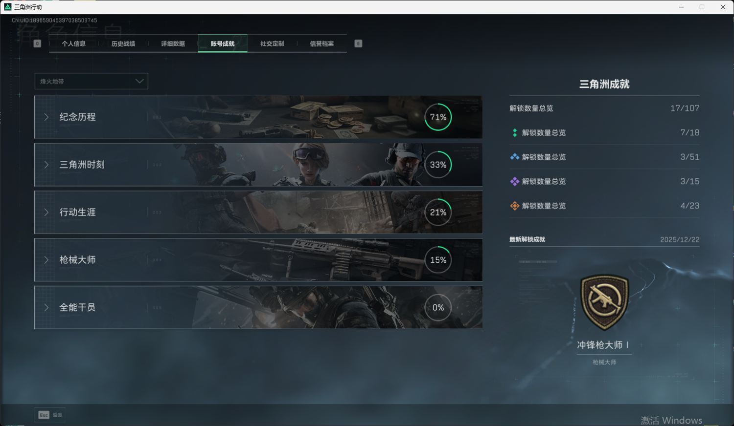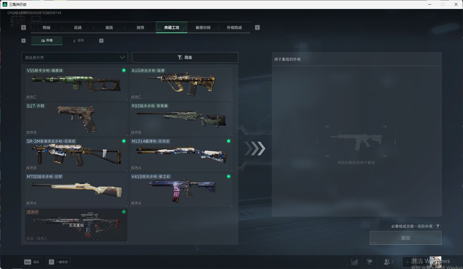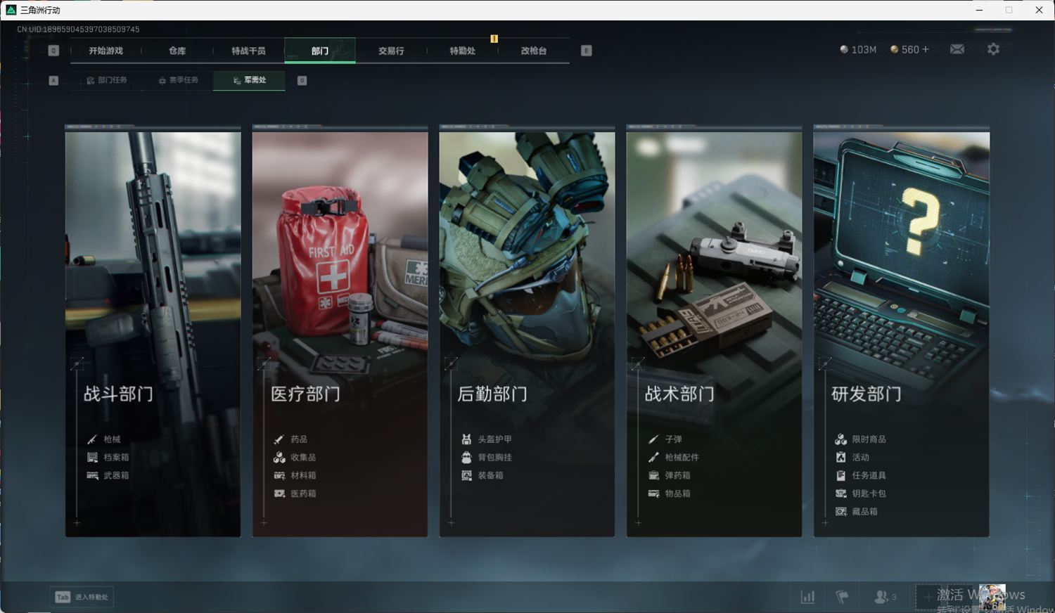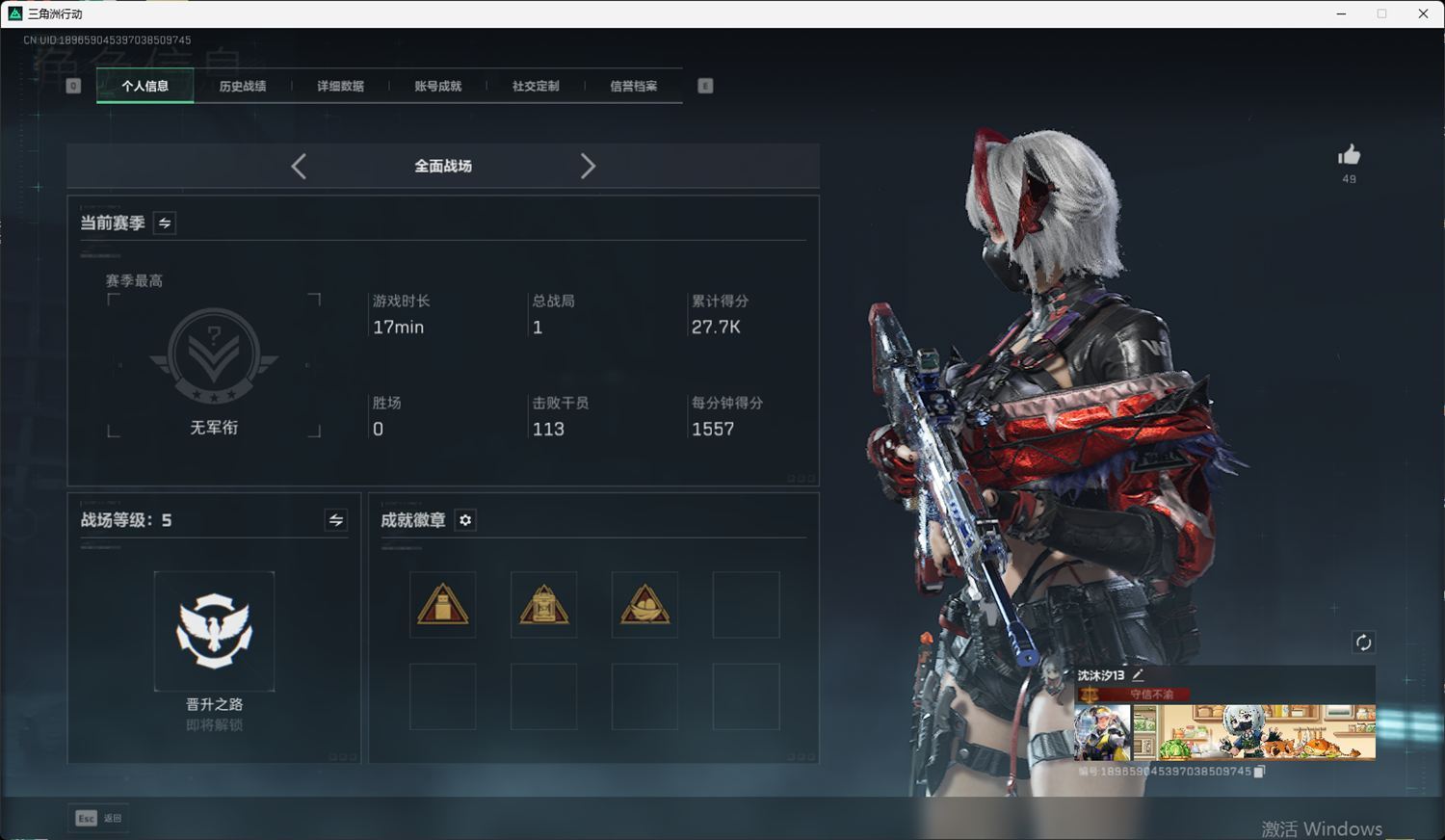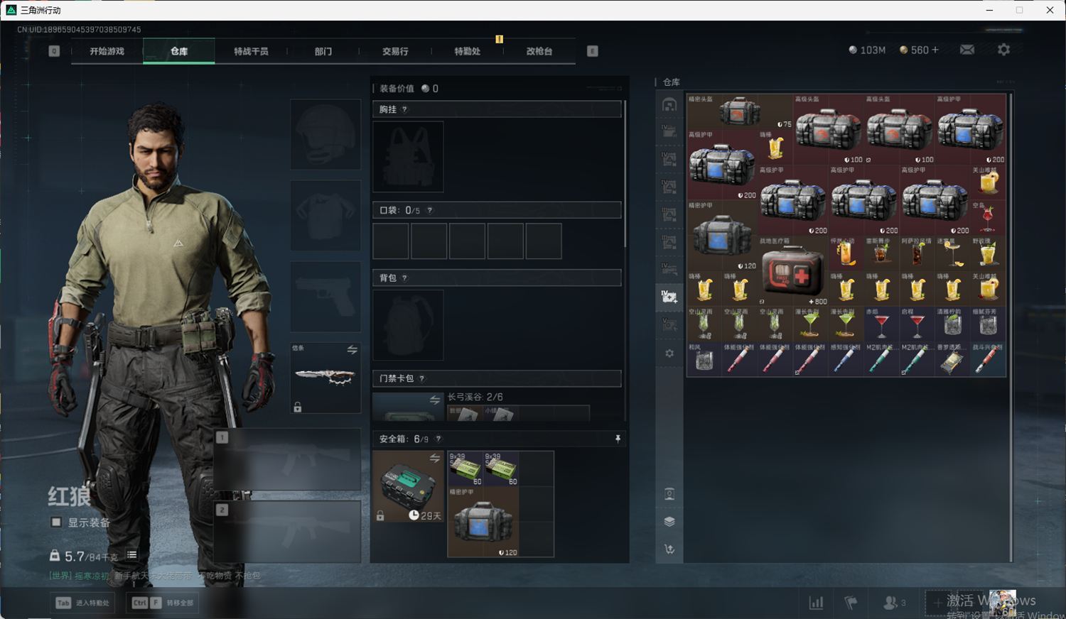 总资产:59.8M,哈夫币:260W,武器皮肤:25,钻石,战场60级:【安全箱】基础安全箱;【特勤处等级】仓库LV.8,靶场LV.7,训练中心LV.7;【干员皮肤】蜂医送葬人无题密令,无名夜鹰,红狼蚀金玫瑰;【近战武器】近战武器-北极星,近战武器-黑鹰;【步枪皮肤】M4A1突击步枪-蚀金玫瑰,M7战斗步枪-神秘艺术,SR-25射手步枪-水墨云图,ASVal突击步枪-蛇年祥瑞,AK-12突击步枪-夜鹰,K437突击步枪-北极星,CAR-15突击步枪-阿米娅,腾龙突击步枪-捞点薯条,AK-12突击步枪-特斯拉线圈,M4A1突击步枪-阿米娅,SCAR-H战斗步枪-启航,KC17突击步枪-电锯惊魂,SG552突击步枪-运动员;【冲锋枪皮肤】P90冲锋枪-神秘艺术,QCQ171冲锋枪-北极星,SMG-45冲锋枪-骑士,UZI冲锋枪-特斯拉线圈,SR-3M紧凑突击步枪-特斯拉线圈,勇士冲锋枪-能天使-午夜邮差;【狙击步枪皮肤】AWM狙击步枪-捞点薯条;【霰弹枪皮肤】725双管霰弹枪-送葬人-无题密令;【轻机枪皮肤】M250通用机枪-骑士之心;【手枪皮肤】93R-捞点薯条;