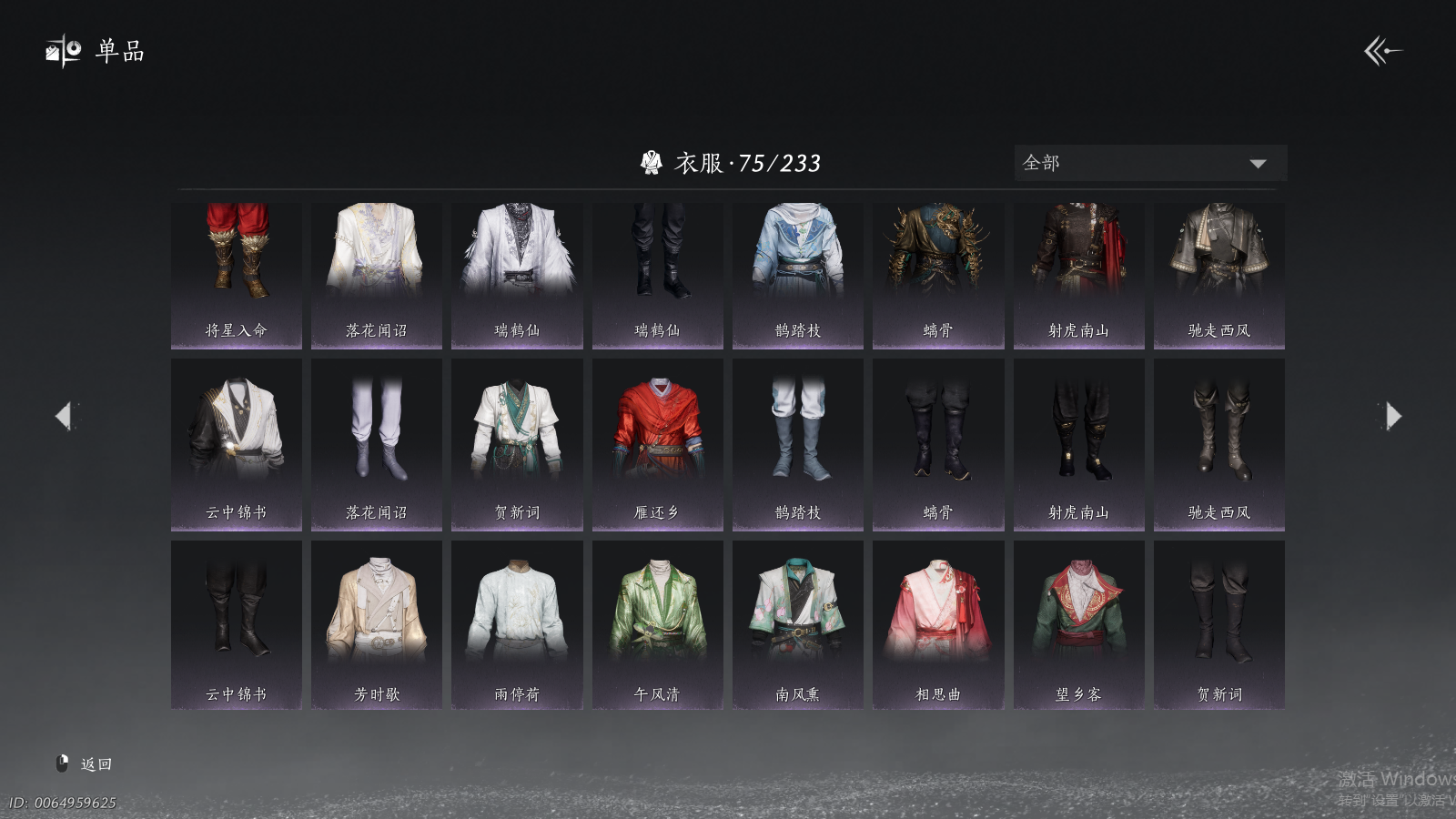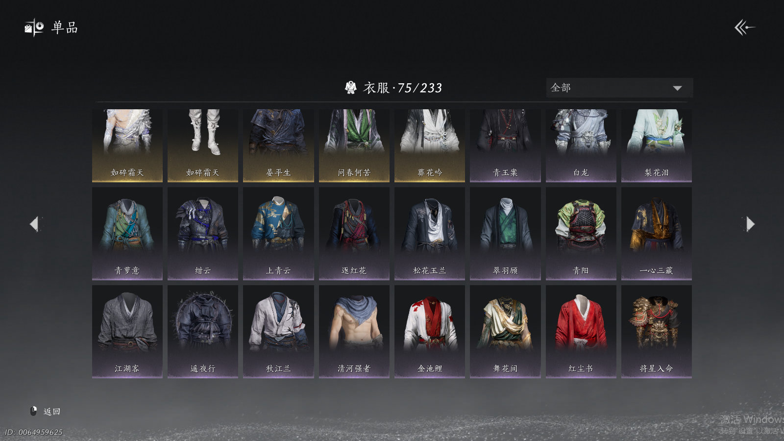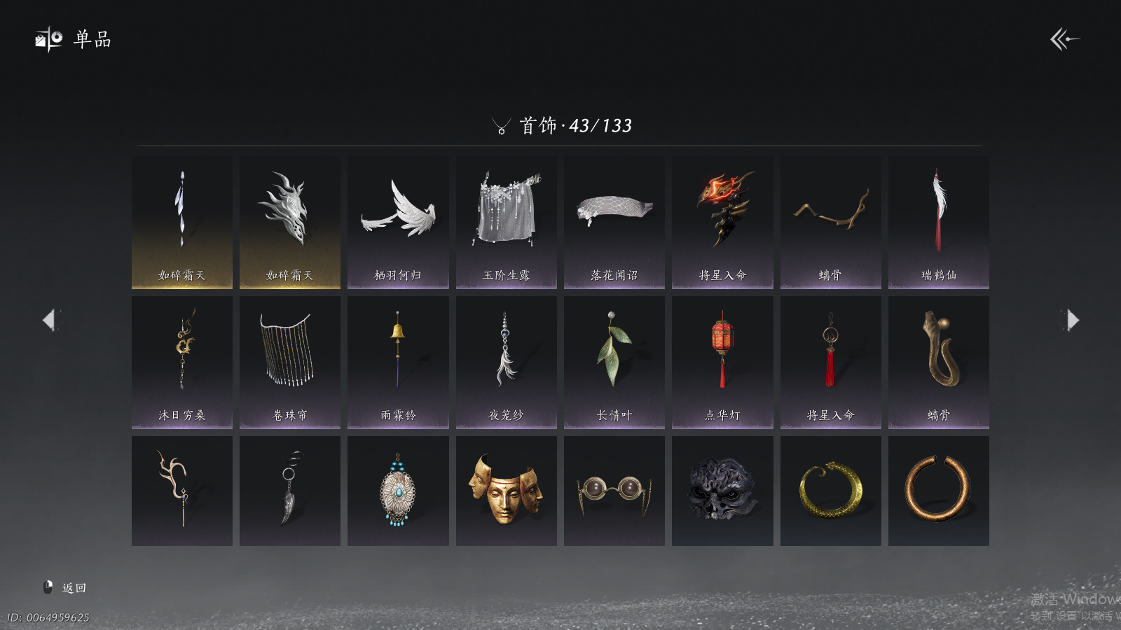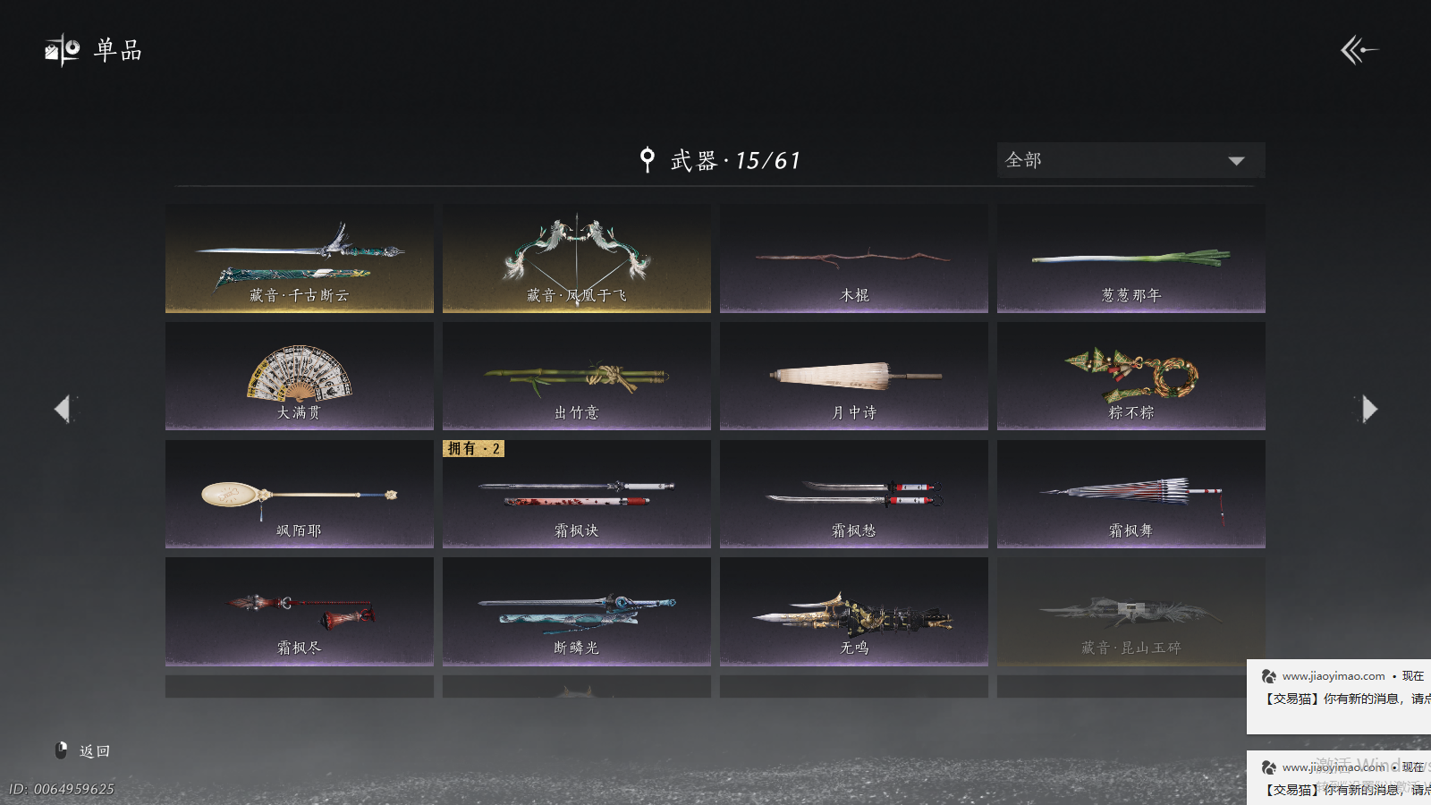 商品描述: 【背包两未用+可封装珍珠双惊霆五金枪+可封装腾光清弦四金弓+瑞鹤仙将星+碎冰冰+九剑+射虎五战令,武器封装cd半个月左右】 风华值48454 武林造诣(鹅)35423 已用八音窍数量5 未用八音窍数量2 等级100 角色性别【文本】男 【绝境】 【无换绑CD】 【未绑定或可换绑】 【未注册】 【不支持人脸包赔】 【男】 稀有套装1 稀有武器外观2 稀有武学奇术1 套装33 武器外观11 武学奇术1 坐骑2 稀有套装:如碎霜天; 稀有武器外观:藏音·千古断云,藏音·凤凰于飞; 稀有武学奇术:一斩绛天; 套装:葬花吟,问春何苦,云中锦书,青玉案,鹊踏枝,贺新词,雁还乡,红尘书,芳时歇,午风清,南风熏,相思曲,望乡客,一心三藏,逐红花,遥夜行,江湖客,雨停荷,舞花间,松花玉兰,上青云,螭骨,将星入命,青阳,白龙,射虎南山,金池鲤,瑞鹤仙,翠羽顾,落花闻诏,梨花泪,清河强者,驰走西风; 武器外观:大满贯,月中诗,出竹意,木棍,葱葱那年,飒陌耶,霜枫舞,霜枫愁,霜枫尽,无鸣,断鳞光; 武学奇术:御帚飞鸡; 坐骑:白义,飒露子;