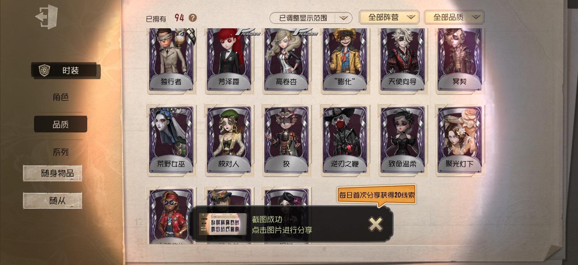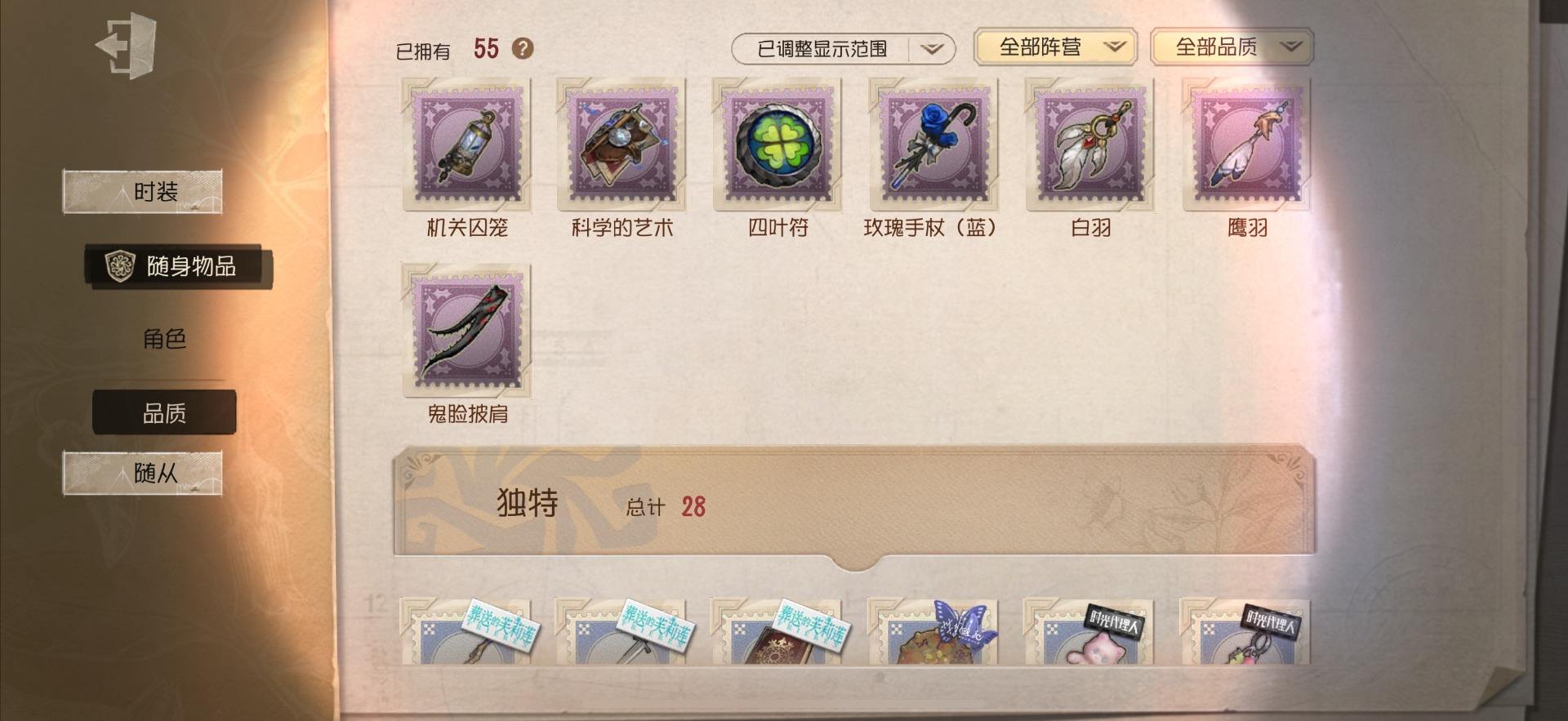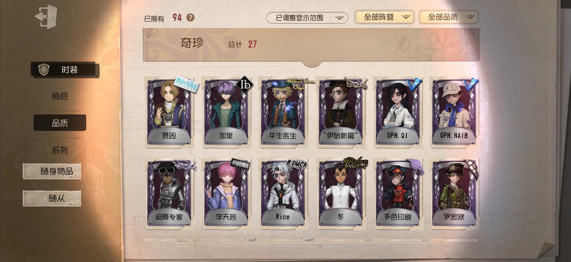 [14028274]OPPO-非账号转移 手机账号 559时装 23金皮 147紫皮 20随从 186随身物品 【时装】:勘探员-盖提亚之遗,爱哭鬼-摩诺,红蝶-壹原侑子,渔女-Chef K,小提琴家-不羁的浪漫,野人-雪原猎人,佣兵-柴郡猫,佣兵-赤井秀一,蜘蛛-花祭,“囚徒”-天海兰太郎,“小女孩”-欧律狄刻,调香师-提炼师,记者-伊布,医生-司药,雕刻家-善忘的海马体,记者-华生小姐,画家-掌中篆记,幸运儿-蛋小黄的好朋友,调香师-Buffy,教授-紧急运输,古董商-菌丝研究,画家-多色印刷,蜘蛛-不息载械,木偶师-义体再构,小说家-“伊始新篇”,击球手-迫降专家,空军-尼德霍格,空军-寒香舞,空军-毛利兰,机械师-不会枯萎的花,机械师-小红帽,26号守卫-蛋壳先生,爱哭鬼-点金,病患-逃罪之人,“杰克”-盛宴伯爵,红夫人-贝拉夫人,红蝶-花嫁,调香师-今夜不再,调香师-Lady K,“小女孩”-滚滚伙伴,医生-罪木蜜柑,幸运儿-苗木诚,幸运儿-拉塔托斯克,孽蜥-窃梦行者,盲女-暗金蛋糕,盲女-吉尔达,梦之女巫-川上富江,“囚徒”-蝰