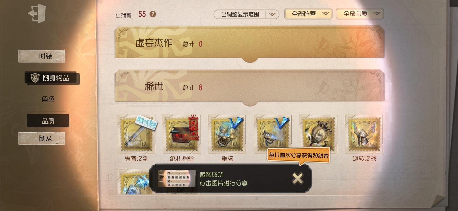 [13699808]安卓官服 手机账号 145时装 8金皮 37紫皮 12随从 37随身物品 【时装】:歌剧演员-幕外之音,作曲家-幽灵帆,爱丽丝·德罗斯-片刻闲暇,渔女-Chef K,调香师-提炼师,咒术师-噩之牙,作曲家-澄明的理性,骑士-Mentor K,骑士-艺术品商人,园丁-郁金香之梦,医生-司药,红蝶-硫火,调香师-Buffy,医生-永生花,小说家-“伊始新篇”,拉拉队员-采集速巡,宿伞之魂-桃面书生,祭司-“朝圣者”,教授-温泉煮酒,祭司-梦之使者,蜡像师-淋浴,昆虫学者-可妮兔,红夫人-女大公,画家-江户川乱步,红夫人-贝拉夫人,红蝶-白无垢,红蝶-更纱,调酒师-海盐特调,舞女-香薰桑拿,调香师-笼中之蝶,调香师-冰上舞蹈,调香师-致命温柔,调香师-今夜不再,调香师-Lady K,小提琴家-孤月骑士,医生-往昔,“使徒”-校监夫人,冒险家-爱丽丝,宿伞之魂-安魂曲【随身物品】:遗忘之花(稀世),沙滩镜(奇珍),月光(奇珍),记忆囚笼(奇珍),酩酊(奇珍),折柳(稀世),法典(奇珍),旧日征帆(奇珍),玫瑰手杖(蓝)(奇珍),长生(奇珍),焚樱(奇珍),玫瑰之下(稀世),完美人偶(稀世),星云瓶(稀世),小人偶(奇珍),“星辰”(稀世),梦魇结晶(稀世),凝露(奇珍),凝聚之水(奇珍),书中蝶(稀世)