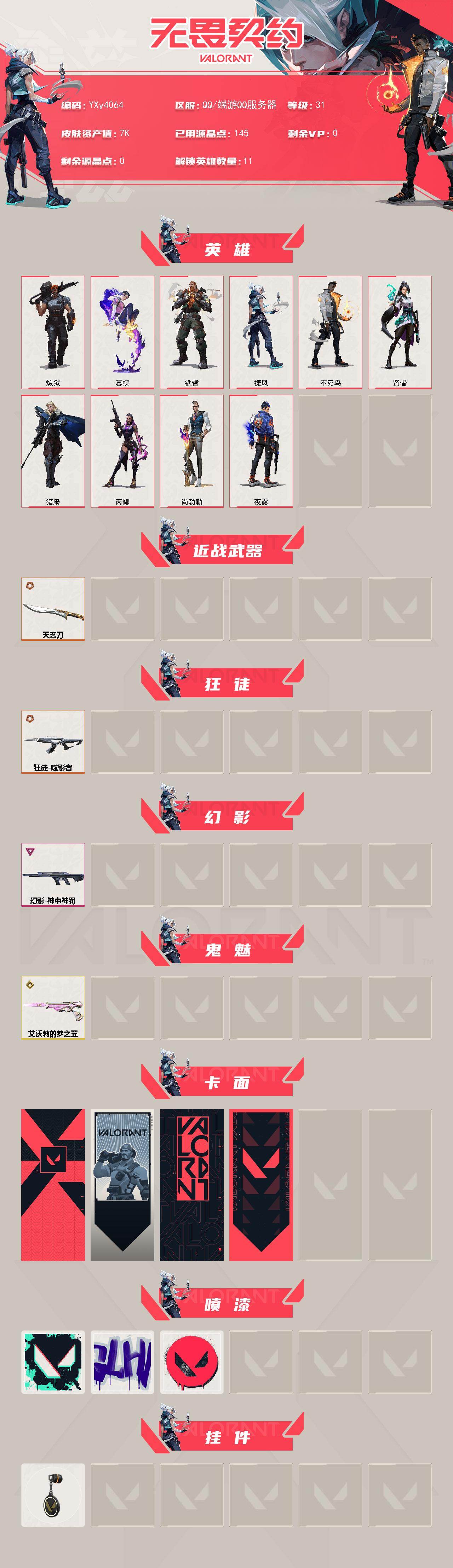 商品描述:【天玄刀.噬影者.神中神罚.猫猫鬼魅】YXy4064【无二次】【因赛季更新游戏段付以上号为准!】【英雄】:炼狱,暮蝶,铁臂,捷风,不死鸟,贤者,猎枭,芮娜,尚勃勒,夜露【近战武器】:近战武器-天玄刀【狂徒】:狂徒-噬影者【幻影】:幻影-神中神罚【鬼魅】:鬼魅-艾沃莉的梦之翼【卡面】:代号红色 卡面,新兵报到 卡面,V契约 卡面,无畏契约 卡面【喷漆】:胜利属于无畏契约 喷漆,GLHF 喷漆,无畏契约 喷漆【挂饰】:无畏契约 纪念币 挂饰