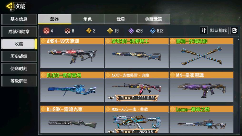 MHZ2415【7红2满12金】安卓Q-等级400-史诗枪械522 【7神话】AMR-亚特兰蒂斯(满级) Kilo 141-暗夜奏鸣曲(满级) M13-黑耀星辰 Switchblade X9-瞬影斩决 Krig6-冰霜巨龙 Fennec-无畏 AK117-熔岩 【12传说】 AN94-毁灭浪潮 十字弓-动能电流 Arctic50-青眸白虎 S36-甜心诱惑 DLQ33-先进火力 唐刀-白月魁 Type25-赤焰复仇 SA80-狂暴冲锋 电棍-永恒炽热 CR56-回音律动 AK47-火箭炮 飞翼浮游炮-v高达
