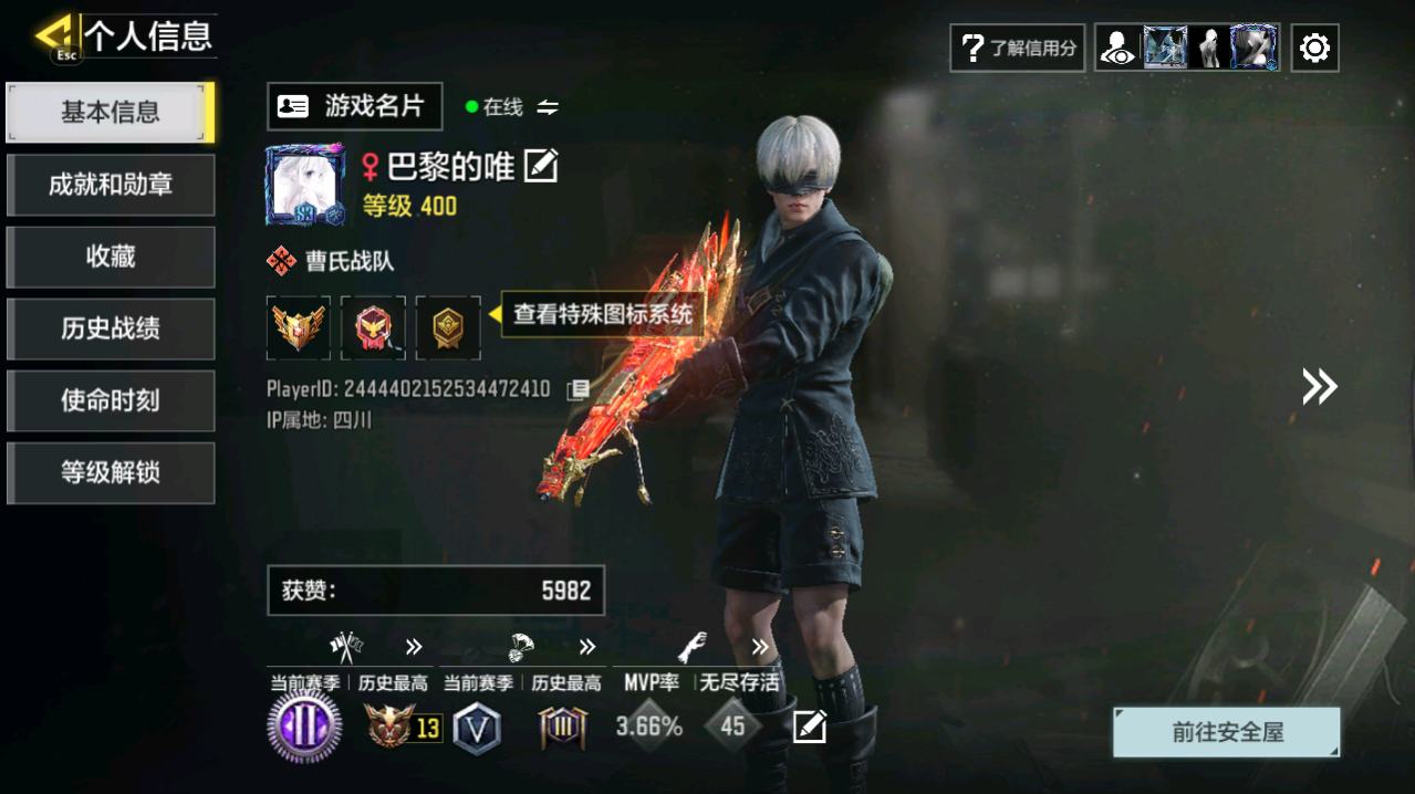 MHZ2415【7红2满12金】安卓Q-等级400-史诗枪械522 【7神话】AMR-亚特兰蒂斯(满级) Kilo 141-暗夜奏鸣曲(满级) M13-黑耀星辰 Switchblade X9-瞬影斩决 Krig6-冰霜巨龙 Fennec-无畏 AK117-熔岩 【12传说】 AN94-毁灭浪潮 十字弓-动能电流 Arctic50-青眸白虎 S36-甜心诱惑 DLQ33-先进火力 唐刀-白月魁 Type25-赤焰复仇 SA80-狂暴冲锋 电棍-永恒炽热 CR56-回音律动 AK47-火箭炮 飞翼浮游炮-v高达