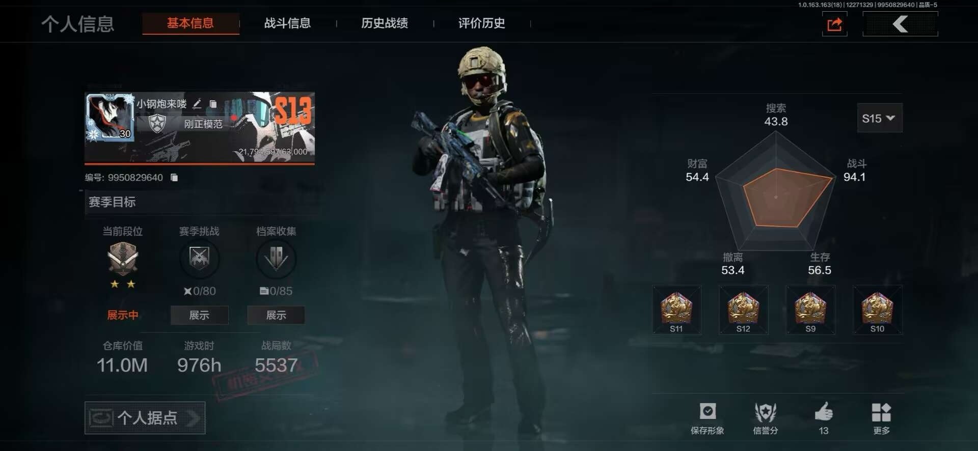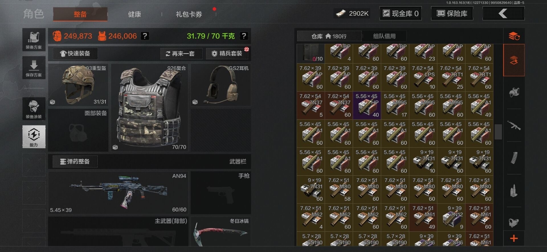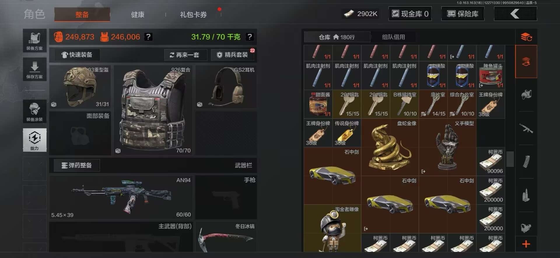 [15916266]库存价值145.3 3近战武器 9金枪皮 可修改实名 【柯恩币数量】937930现金库9.8m 【近战武器】工兵铲,空腔战术,来战·开山刀 【金色枪皮】利齿风暴·MPX,浮鳞影青·QBZ192,伦琴幻影·AX50,旧王圣谕·QBZ191,包络战术·AKM,告丧夜曲·AUG,棱光裂变·QBU191,蓝色咆哮·H416,竞技·FAL 【紫色枪皮】利齿风暴·T79,鱼跃丹青·QBU191,鱼跃丹青·DT MDR,火力倾泻·AKM,德尔塔小队·H416,火力倾泻·AUG,棱光裂变·AKM,棱光裂变·AK102,棱光裂变·ACE31,湖冰倒影·MPX,骑士之剑·AKM,包络战术·USAS12,典礼武备·14,典礼武备·M249,战术大师·AK74N,战术大师·Suomi,战术大师·SKS,战术大师·SVDS,旗帜脉冲·M110,潜渊蛇鳞·M4A1,神锋·Vector45,火绒草·AUG,快乐游戏·MPX,骑士之剑·AKS74U,骑士之剑·SJ16,娜迦·RPK16,07式林地迷彩·QBZ191,缟兵玄墨·AKM 【角色装扮(紫)】鎏金街头套装,王国卫队礼装,速度新星赛车服,财团之手作战套装,速降反光·户外运动套装,砼城浪客·套装