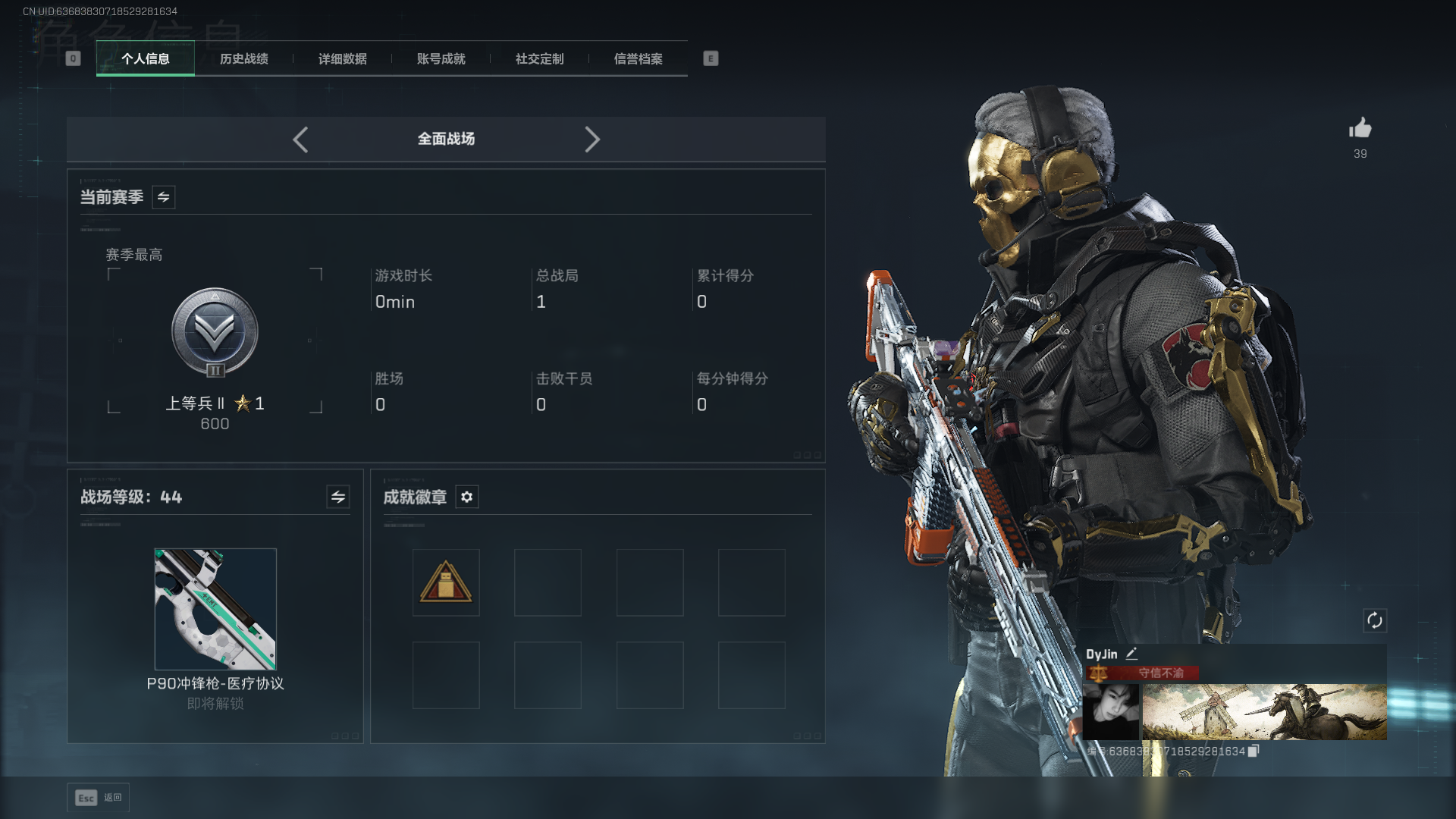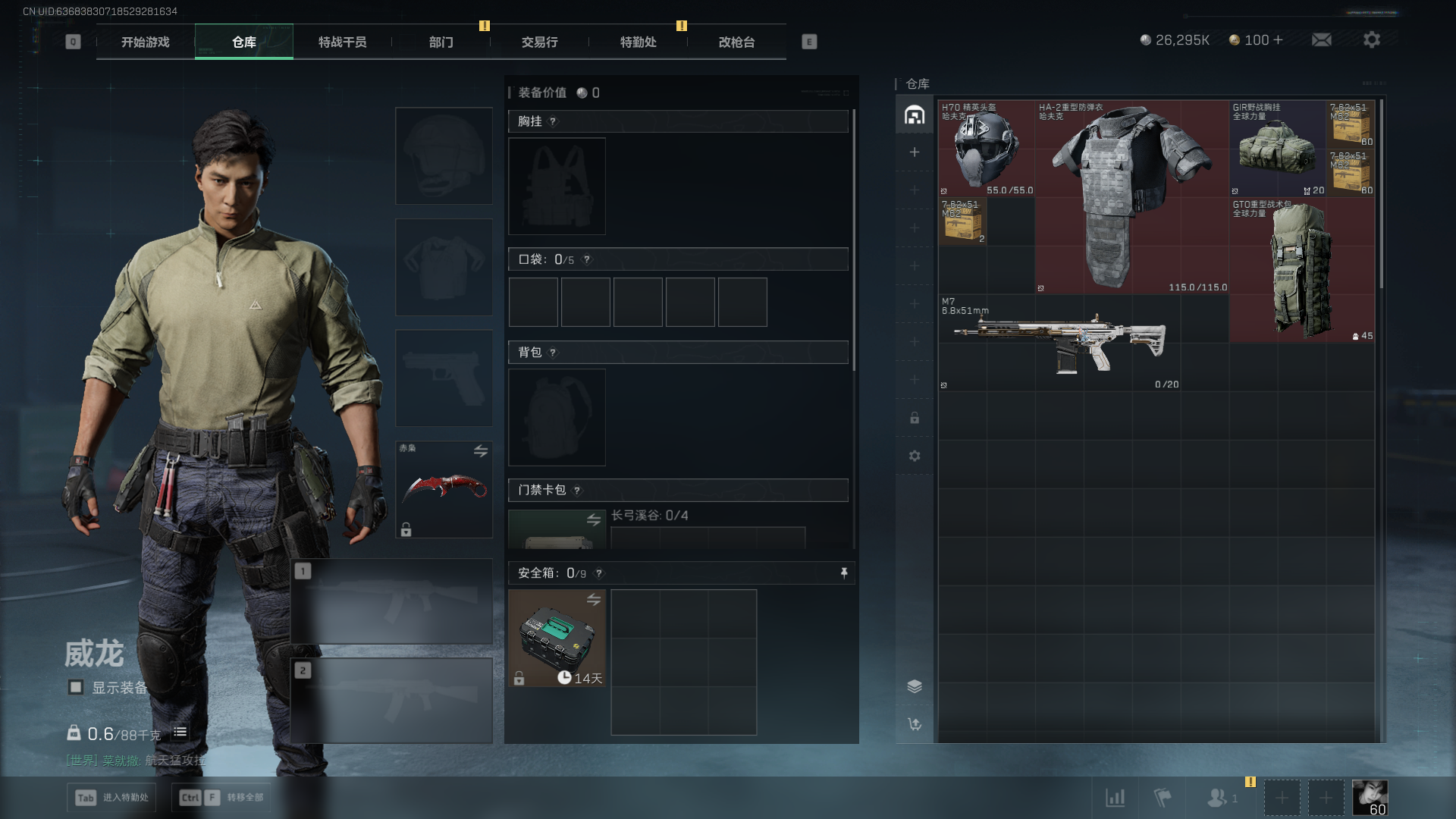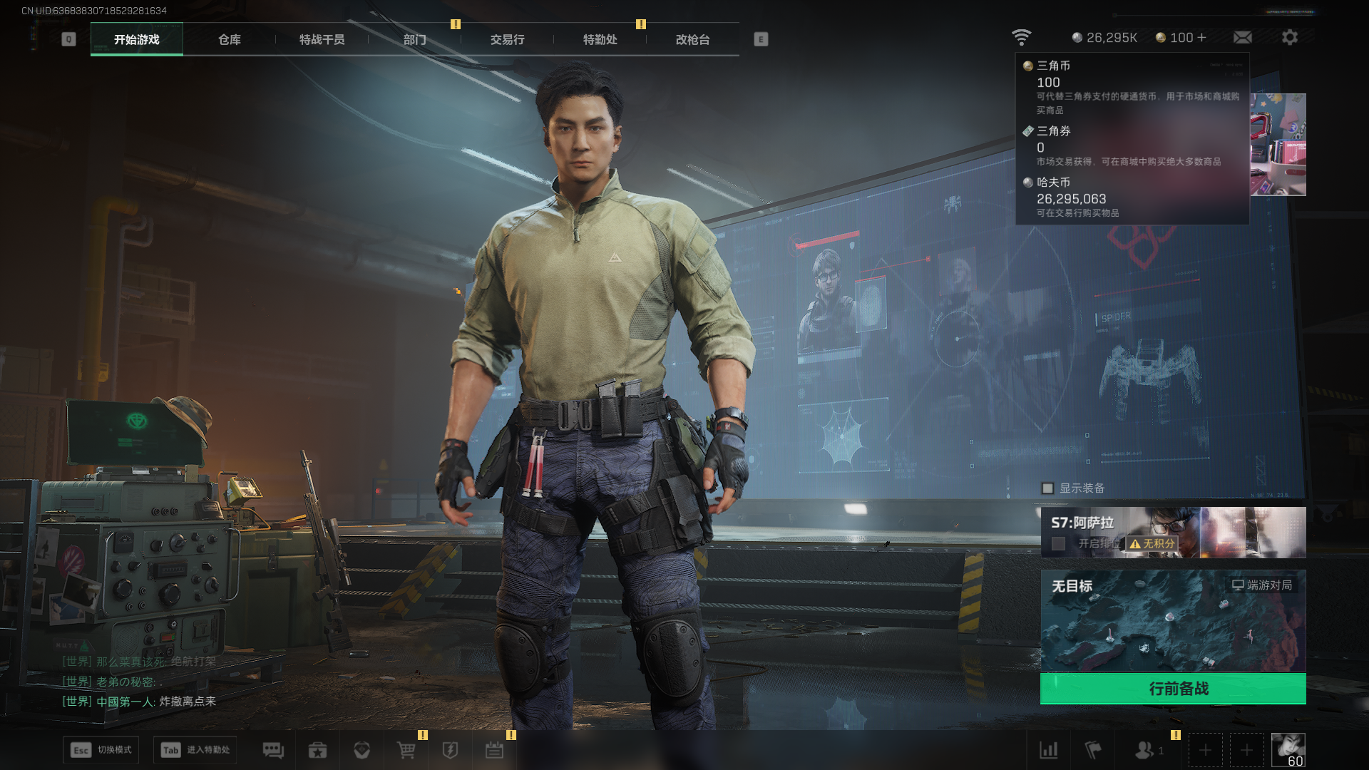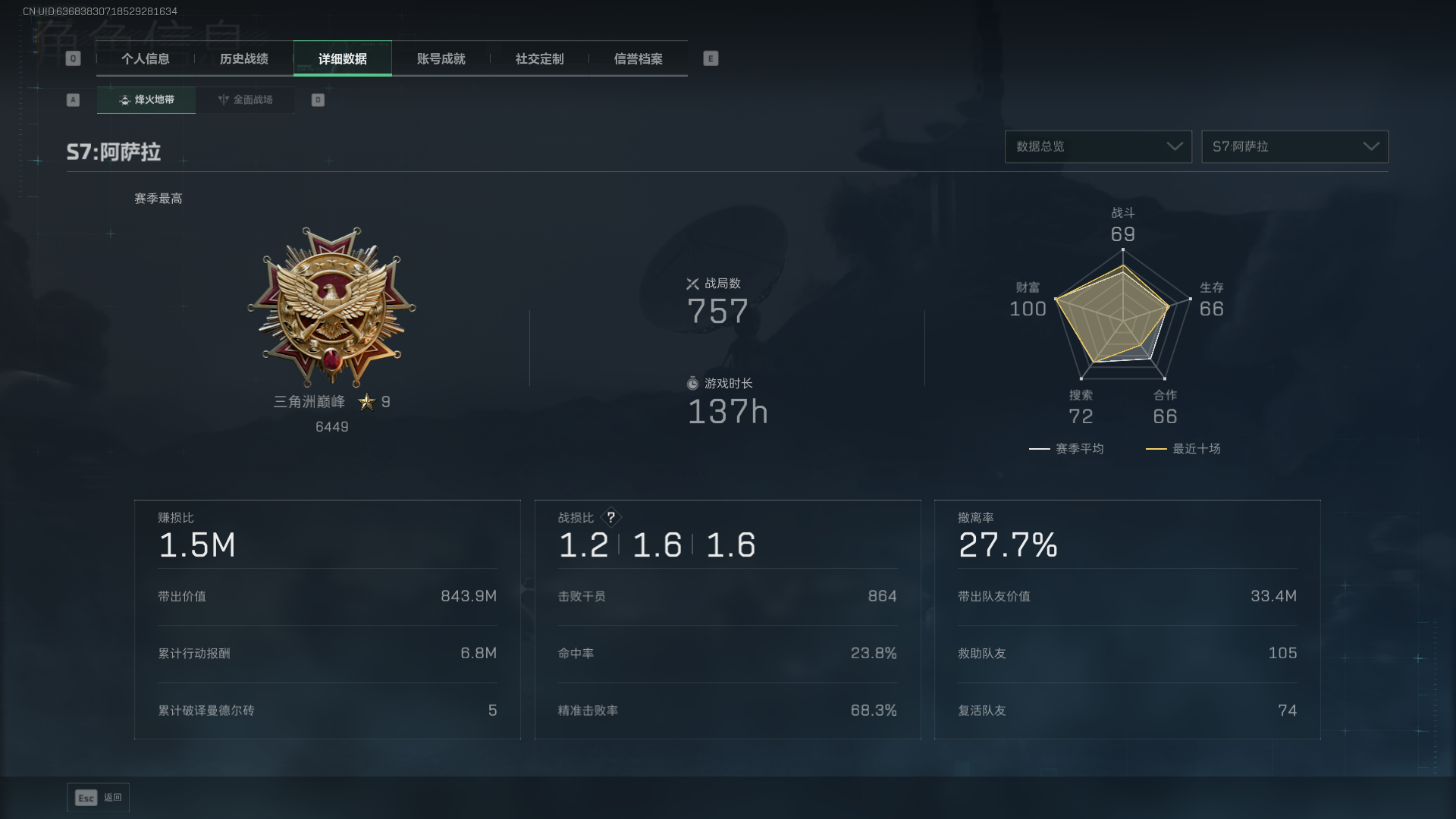 总资产:59.8M,哈夫币:260W,武器皮肤:25,钻石,战场60级:【安全箱】基础安全箱;【特勤处等级】仓库LV.8,靶场LV.7,训练中心LV.7;【干员皮肤】蜂医送葬人无题密令,无名夜鹰,红狼蚀金玫瑰;【近战武器】近战武器-北极星,近战武器-黑鹰;【步枪皮肤】M4A1突击步枪-蚀金玫瑰,M7战斗步枪-神秘艺术,SR-25射手步枪-水墨云图,ASVal突击步枪-蛇年祥瑞,AK-12突击步枪-夜鹰,K437突击步枪-北极星,CAR-15突击步枪-阿米娅,腾龙突击步枪-捞点薯条,AK-12突击步枪-特斯拉线圈,M4A1突击步枪-阿米娅,SCAR-H战斗步枪-启航,KC17突击步枪-电锯惊魂,SG552突击步枪-运动员;【冲锋枪皮肤】P90冲锋枪-神秘艺术,QCQ171冲锋枪-北极星,SMG-45冲锋枪-骑士,UZI冲锋枪-特斯拉线圈,SR-3M紧凑突击步枪-特斯拉线圈,勇士冲锋枪-能天使-午夜邮差;【狙击步枪皮肤】AWM狙击步枪-捞点薯条;【霰弹枪皮肤】725双管霰弹枪-送葬人-无题密令;【轻机枪皮肤】M250通用机枪-骑士之心;【手枪皮肤】93R-捞点薯条;