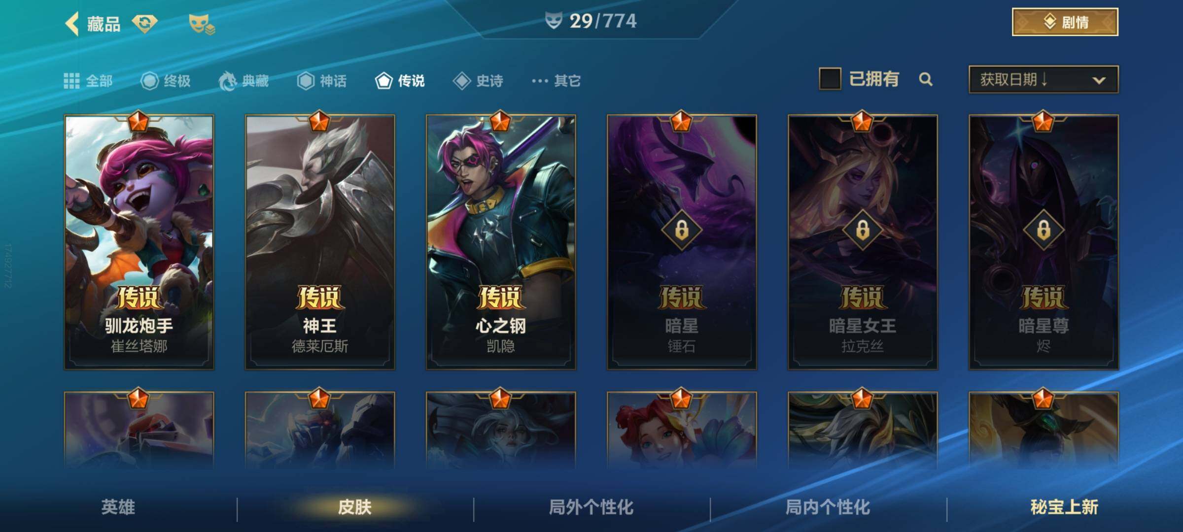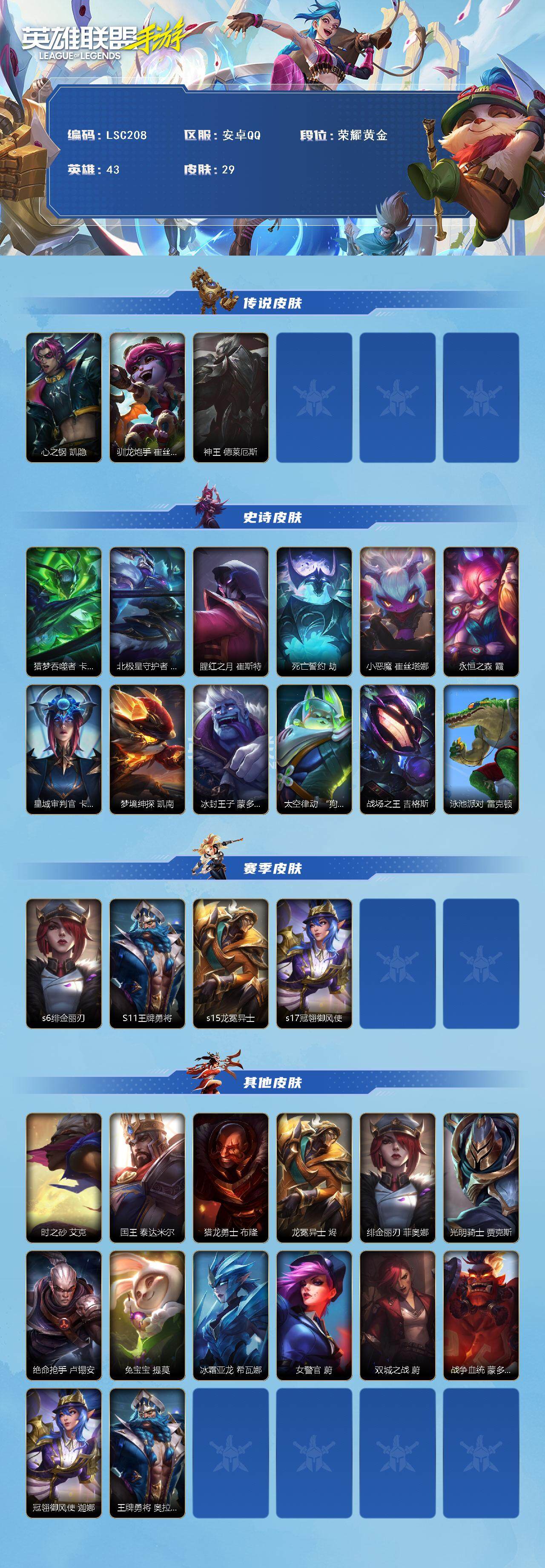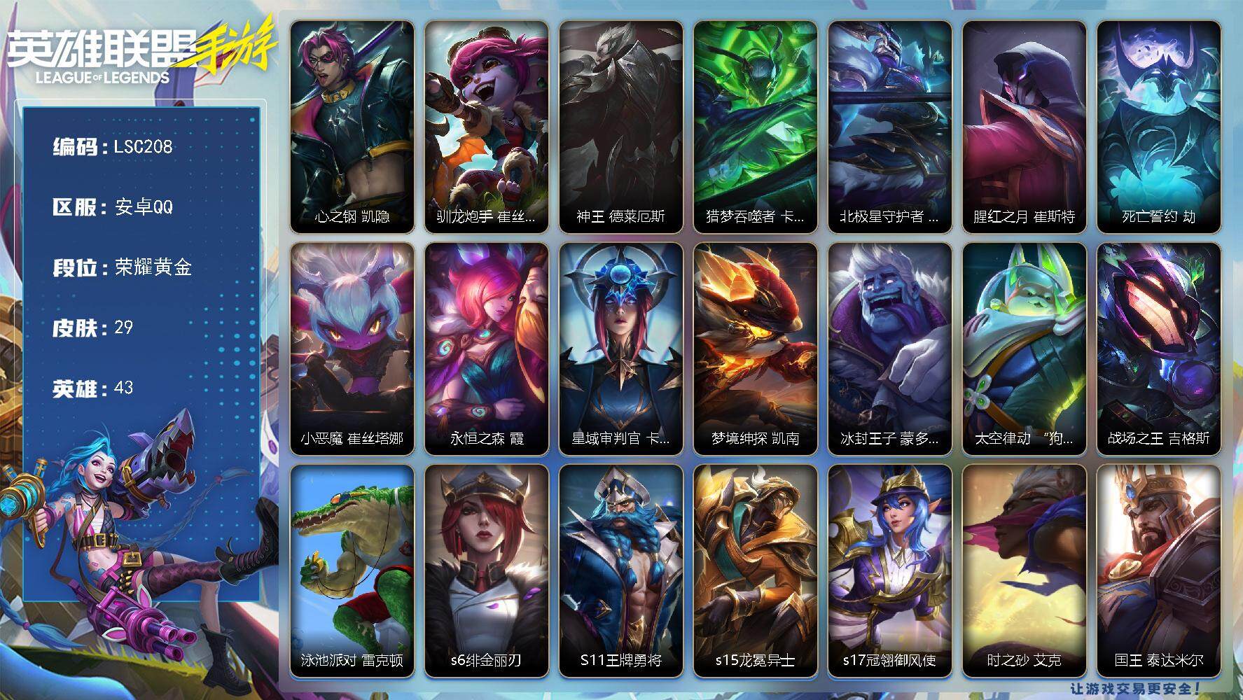 【LSC208】43英雄/29皮肤/3传说/12史诗/荣耀黄金/心之钢 凯隐/驯龙炮手 崔丝塔娜/神王 德莱厄斯/猎梦吞噬者 卡兹克/北极星守护者 赫卡里姆/腥红之月 崔斯特/死亡誓约 劫/小恶魔 崔丝塔娜/永恒之森 霞/星域审判官 卡蜜尔/梦境绅探 凯南/冰封王子 蒙多医生/太空律动 “狗头” 内瑟斯/战场之王 吉格斯/泳池派对 雷克顿/s6绯金丽刃/S11王牌勇将/s15龙冕异士/s17冠翎御风使/时之砂 艾克/国王 泰达米尔/猎龙勇士 布隆/龙冕异士 烬/绯金丽刃 菲奥娜/光明骑士 贾克斯/绝命枪手 卢锡安/兔宝宝 提莫/冰霜亚龙 希瓦娜/女警官 蔚/双城之战 蔚/战争血统 蒙多医生/