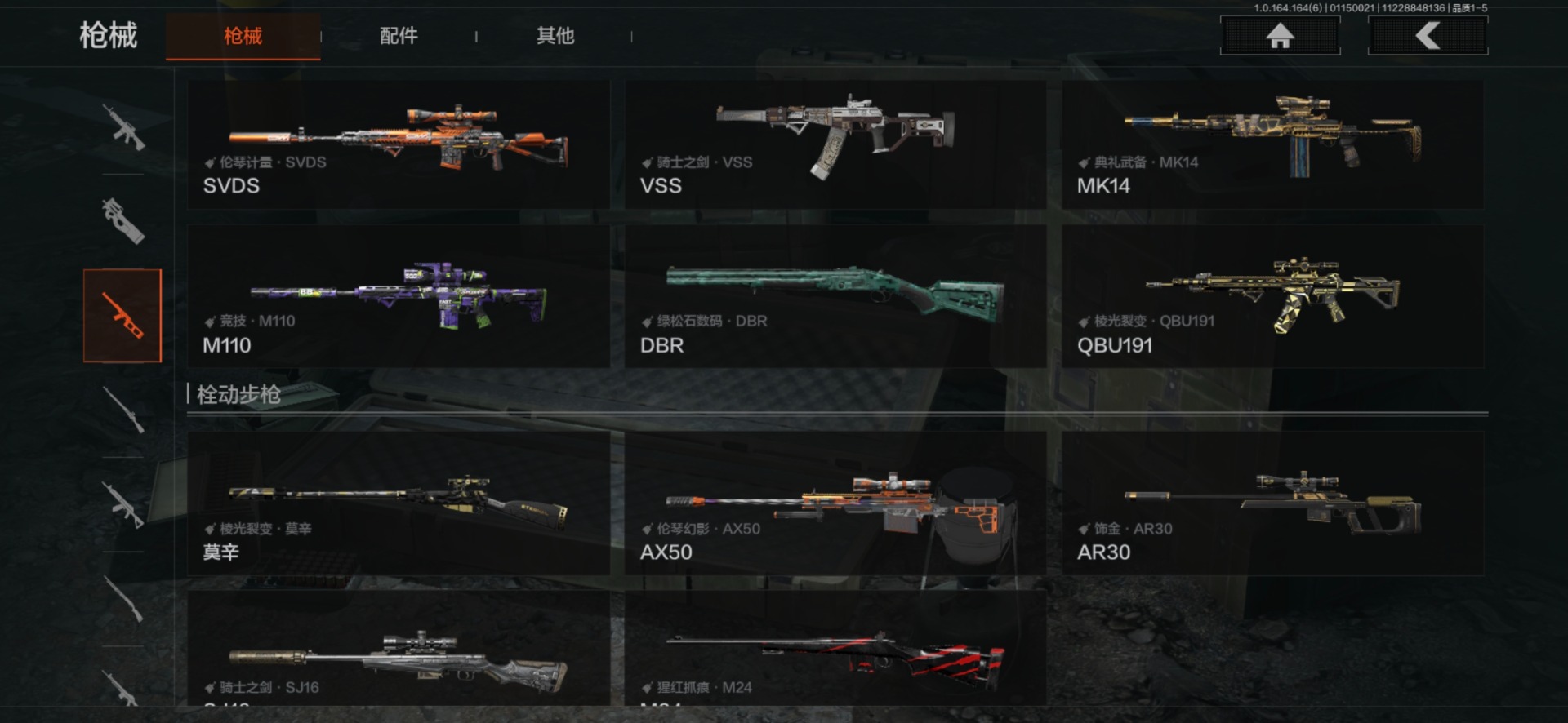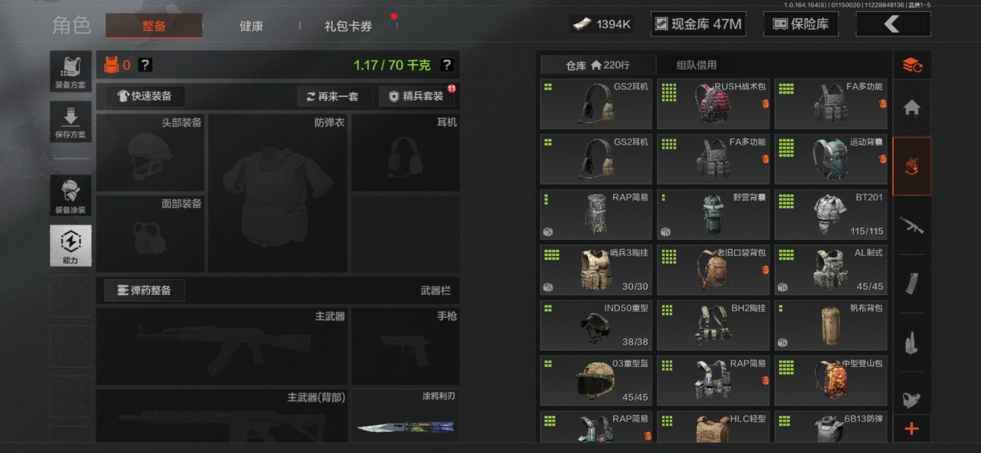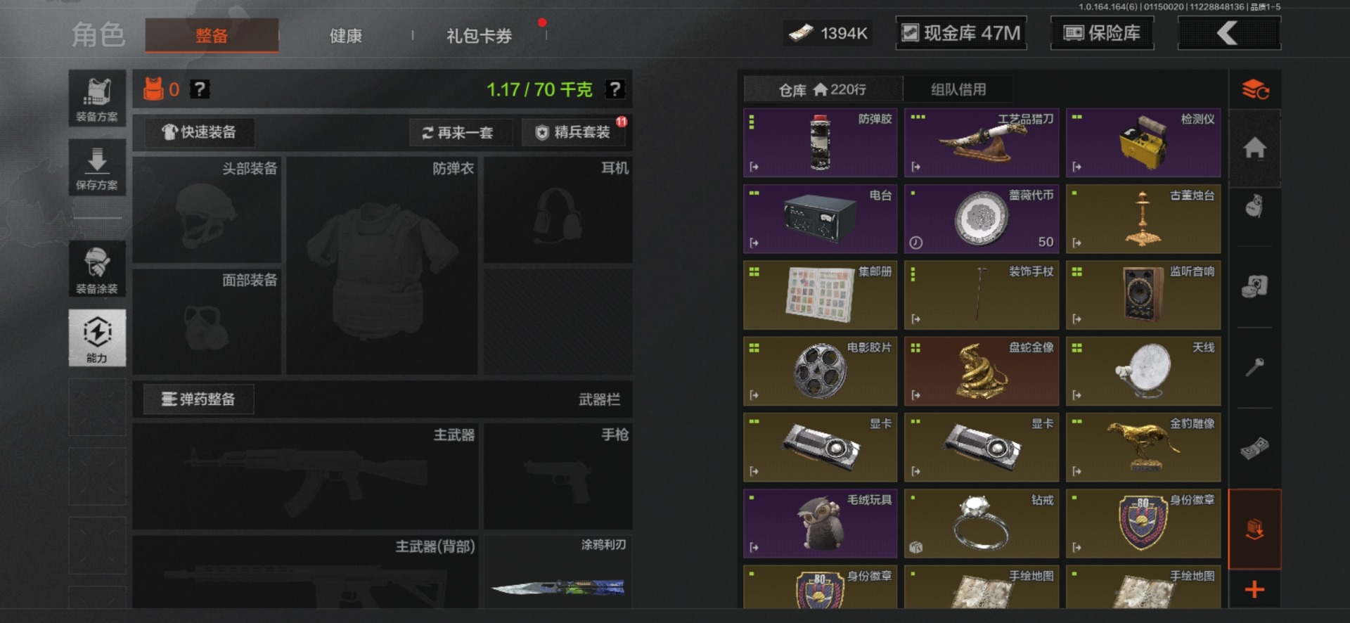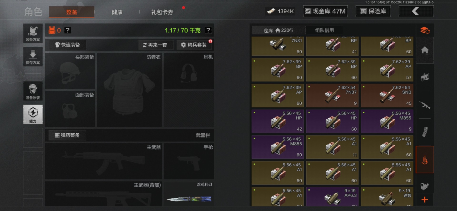 AQ393安Q-可二次-仓库价值:2.2M 科恩币: 525170 3刀皮: S-07折刀 工兵铲 来战·开山刀 金枪: 伦琴幻影· FAL 骑士之剑·VSS 武器: 来战·AKM 自喷网络·H416 北国内卫·MDR 鱼跃丹青·AK102 战术大师·AK74N 骑士之剑·AKS74U 火力倾泻·AUG 战术大师·AEK 幻象·FAMAS 典礼武器·MCX 利齿风暴·MPX 典礼武器·14